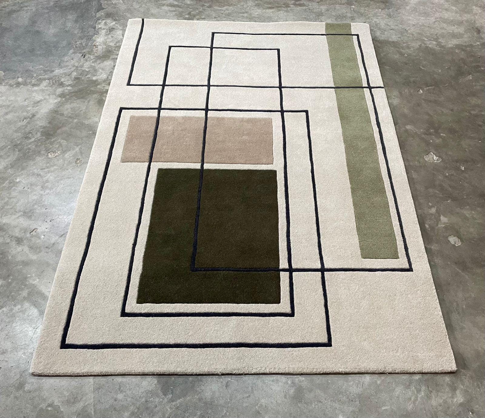 One of the most captivating aspects of this rug is its geometric pattern. The interplay of squares, rectangles, and lines creates a structured yet artistic feel, reminiscent of modernist architecture and abstract art. The color palette, featuring shades of beige, olive green, deep forest green, and black outlines, enhances its sophisticated look.