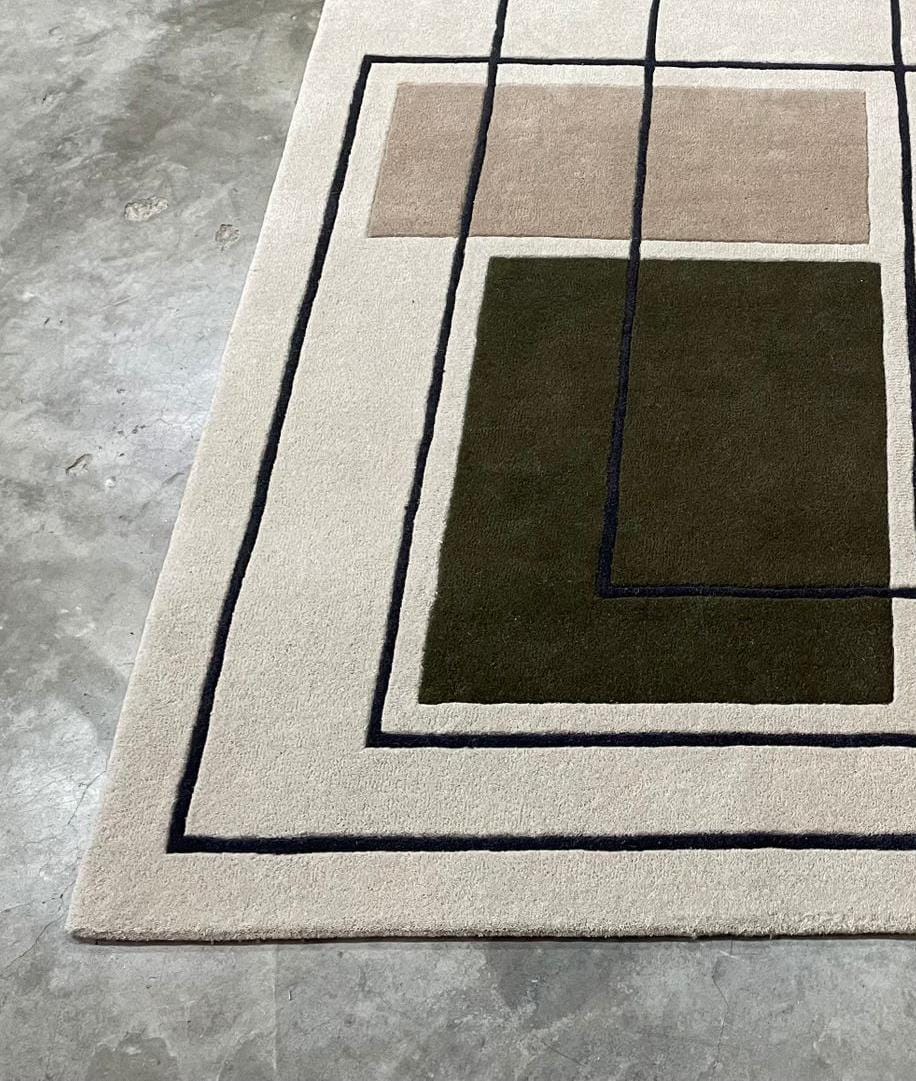 The color palette of this rug draws inspiration from natural elements. The deep green represents lush forests, the muted olive mirrors moss-covered landscapes, and the beige hues resemble sand and stone. Combined with the structured, architectural black lines, the design is a perfect balance between nature’s organic beauty and human-made precision.