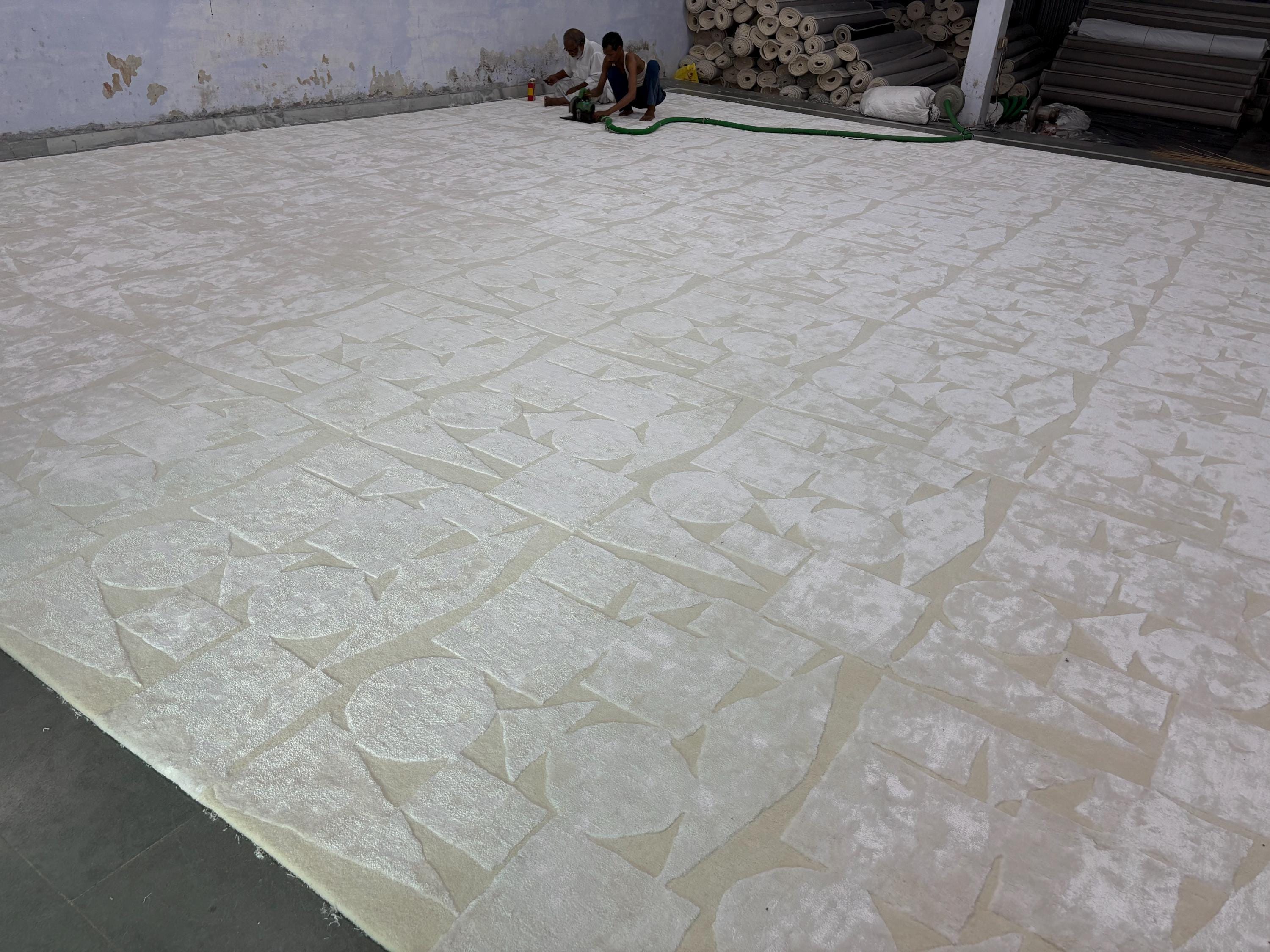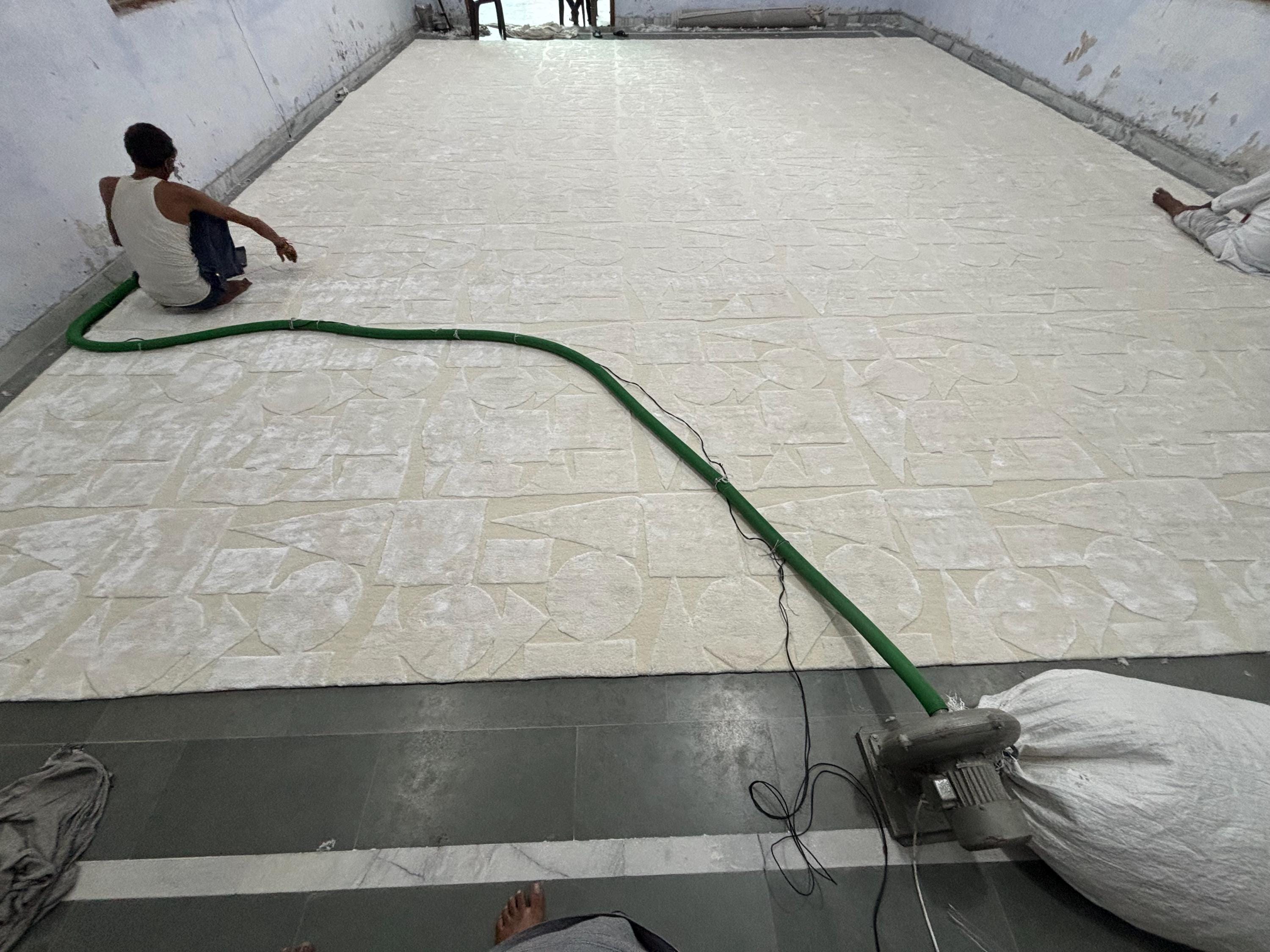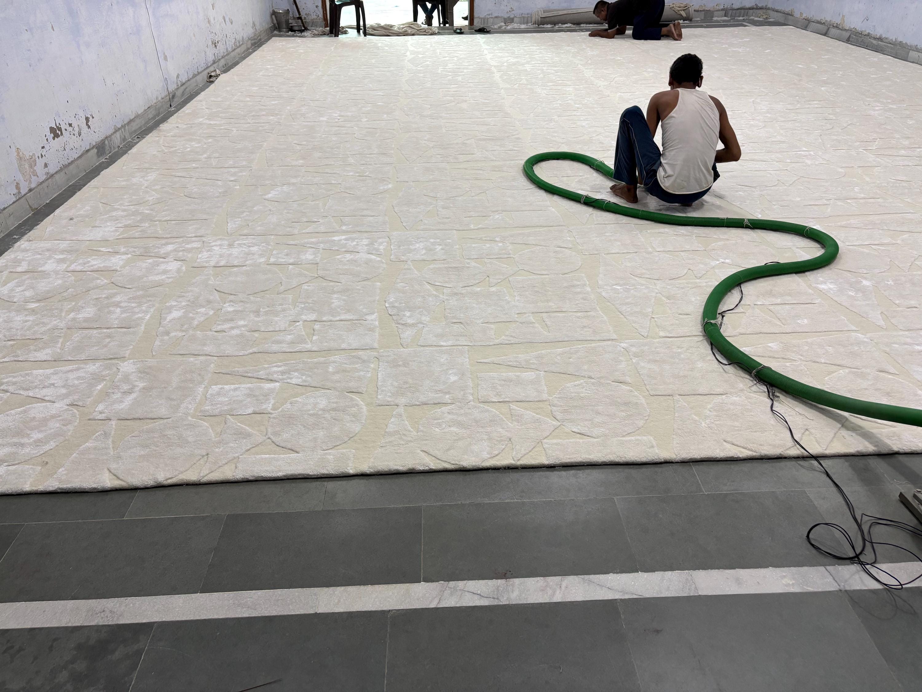 Off-white rug with a raised textured pattern is spread out on the floor. A person can be seen in the background, possibly involved in the rug's manufacturing or cleaning process.