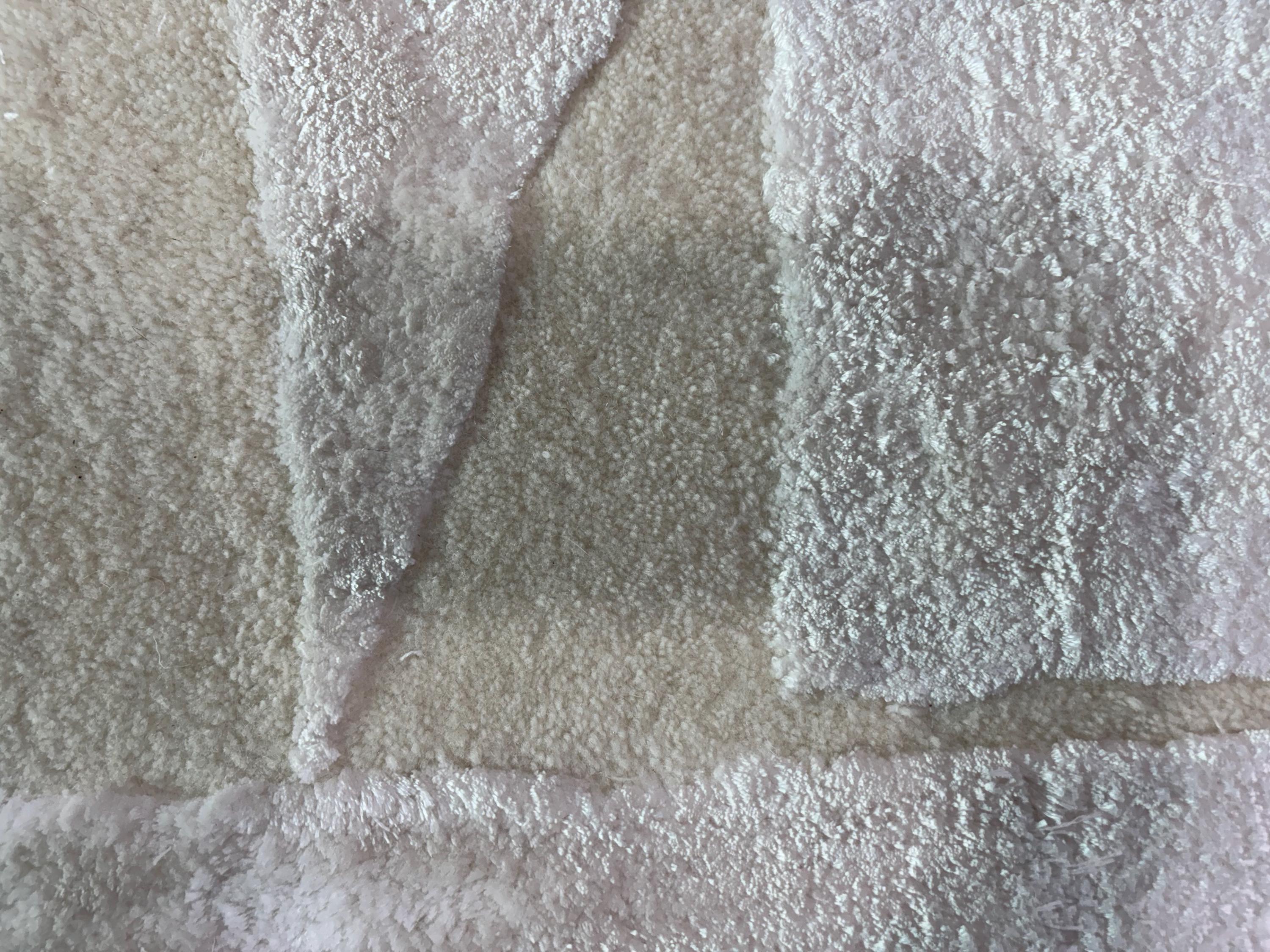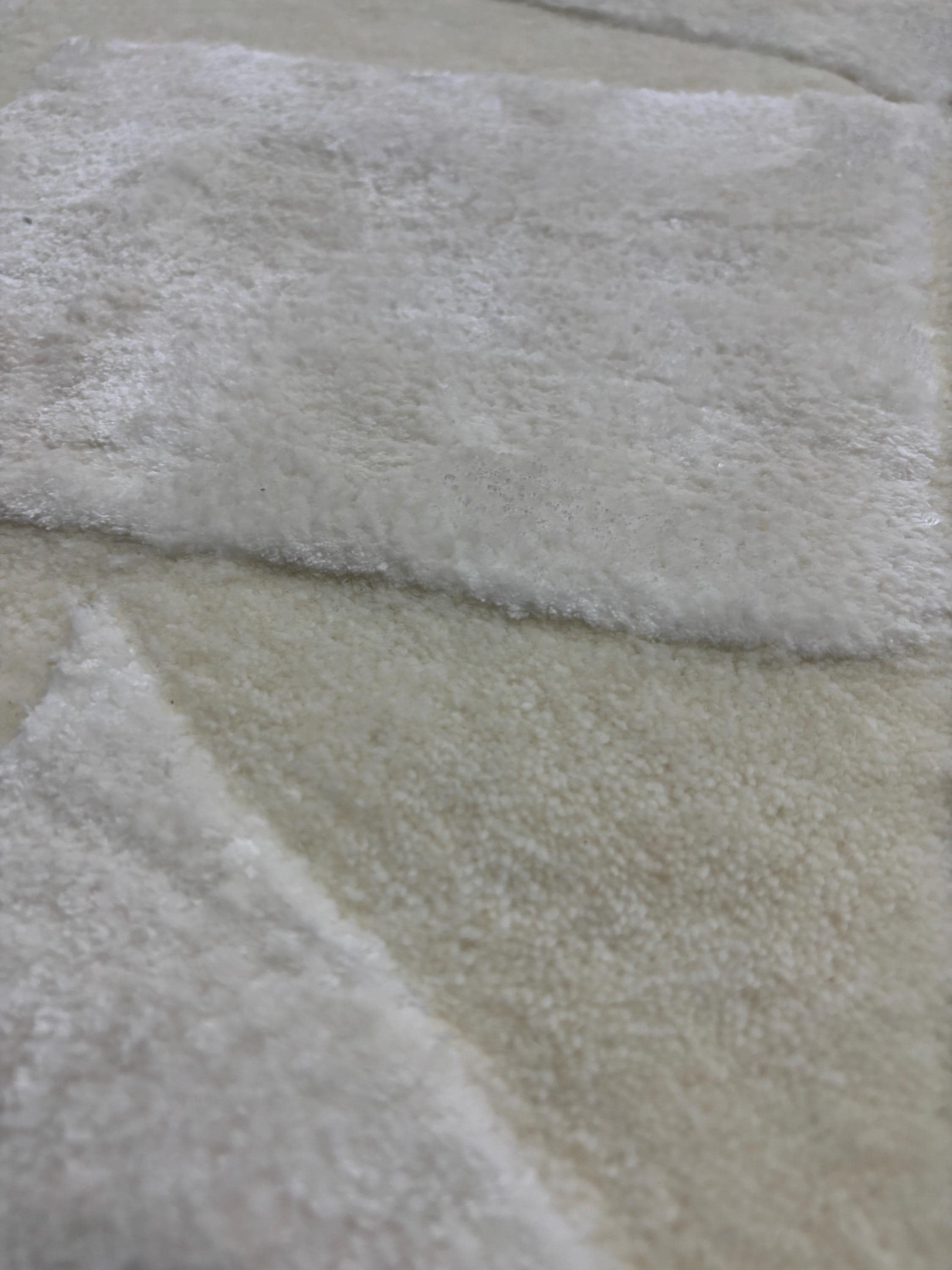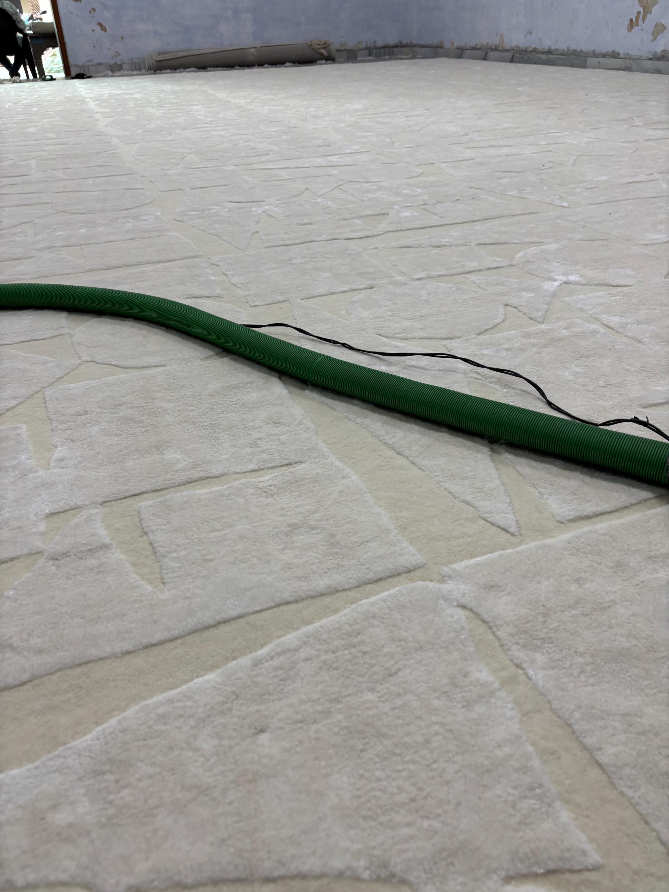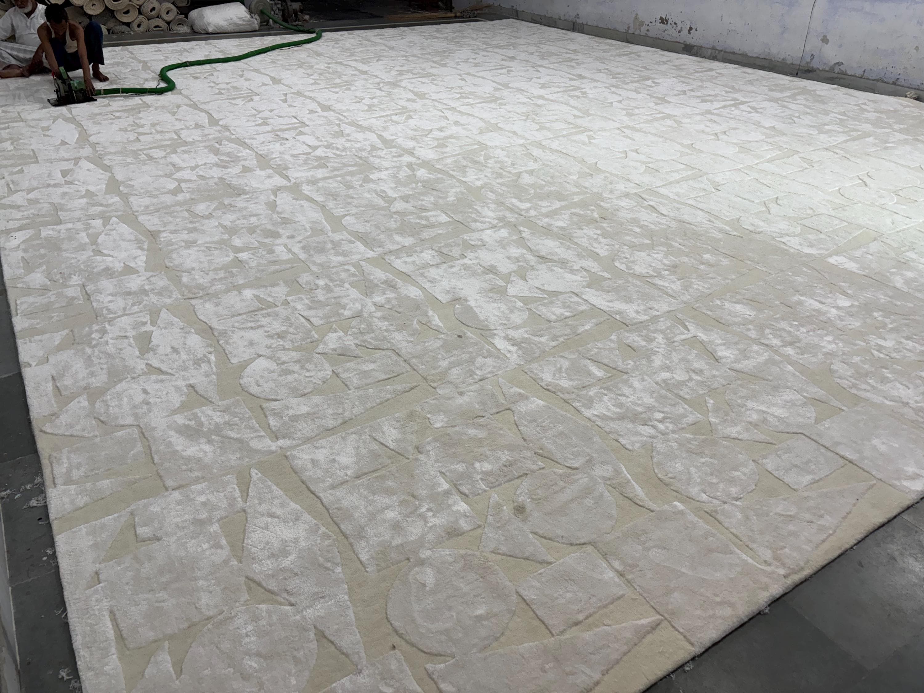 Off-white rug with a raised textured pattern is spread out on the floor. A person can be seen in the background, possibly involved in the rug's manufacturing or cleaning process.