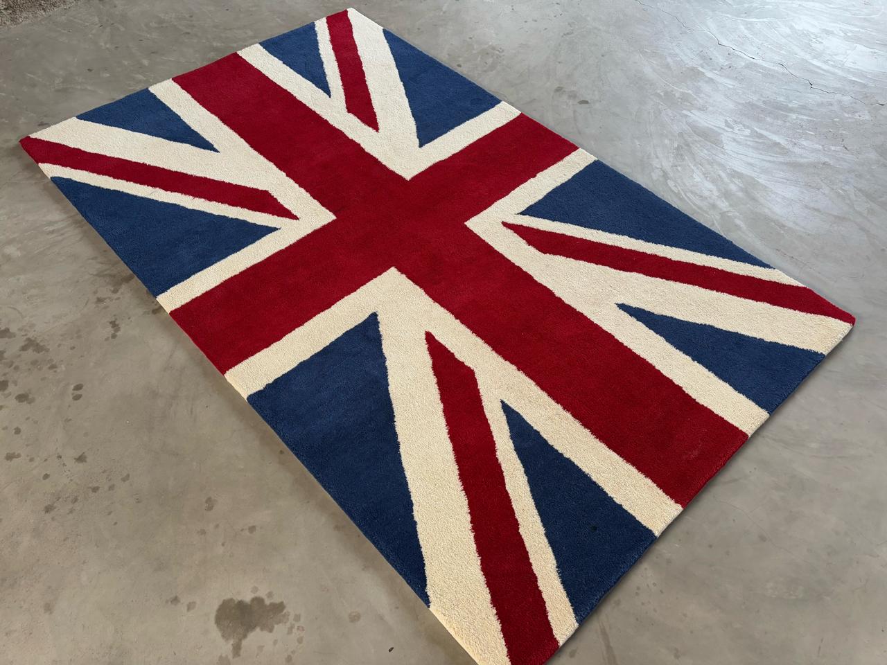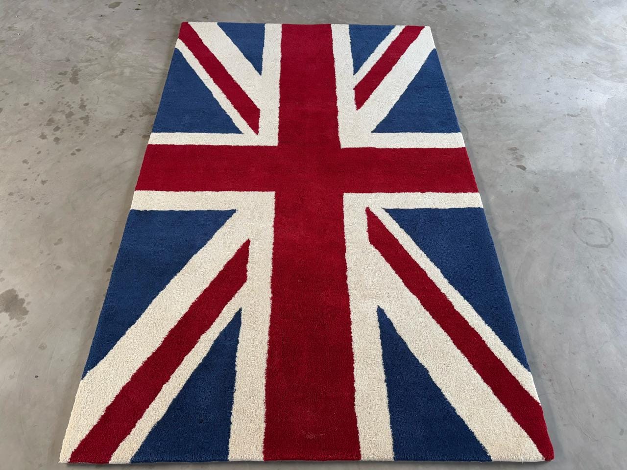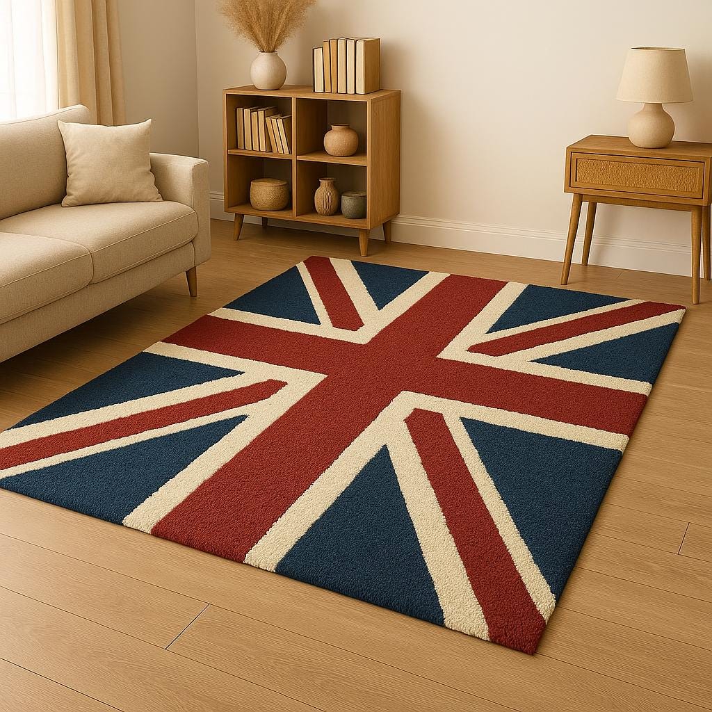 The rug showcases the iconic Union Jack flag, a powerful symbol of British heritage and identity.