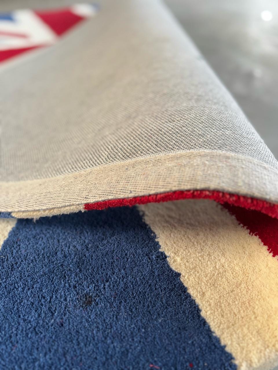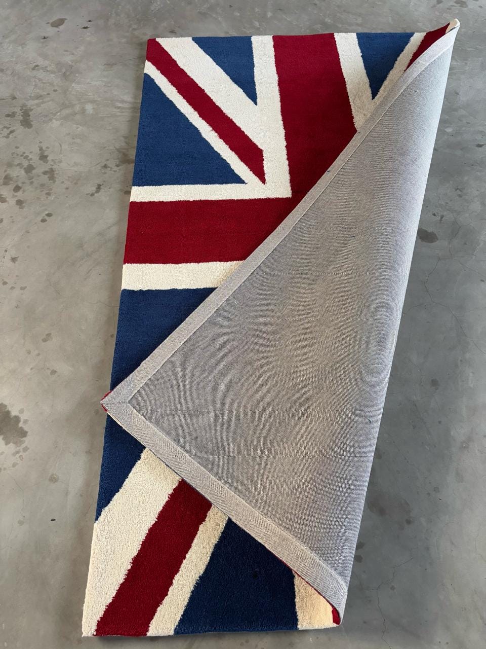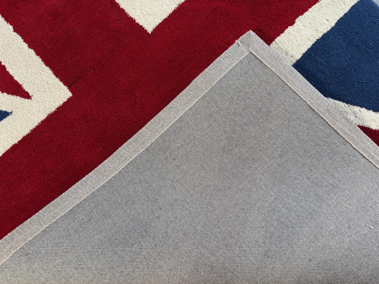 This Union Jack rug commands attention with its bold design and vibrant colors, making it a striking centerpiece for any room.