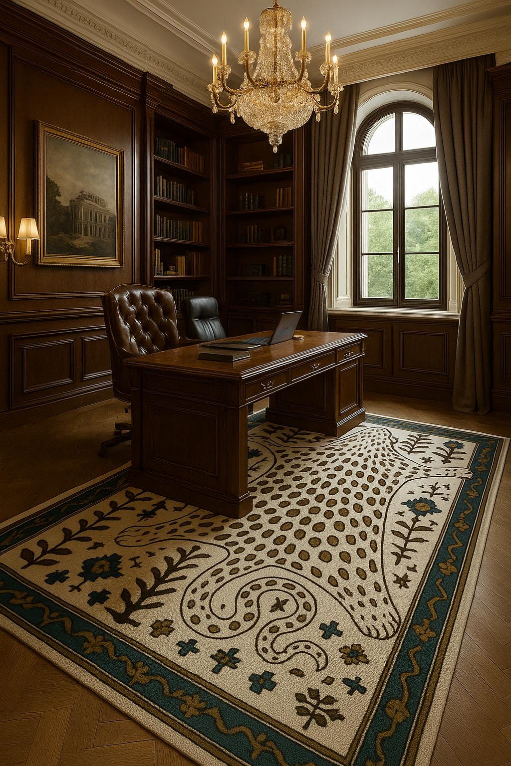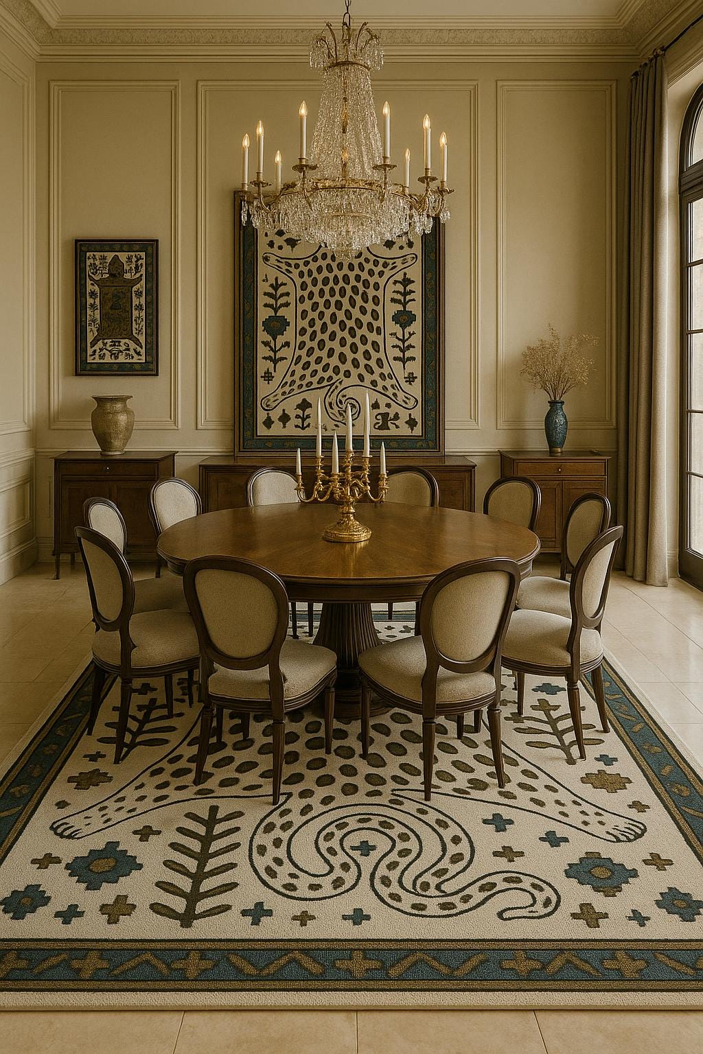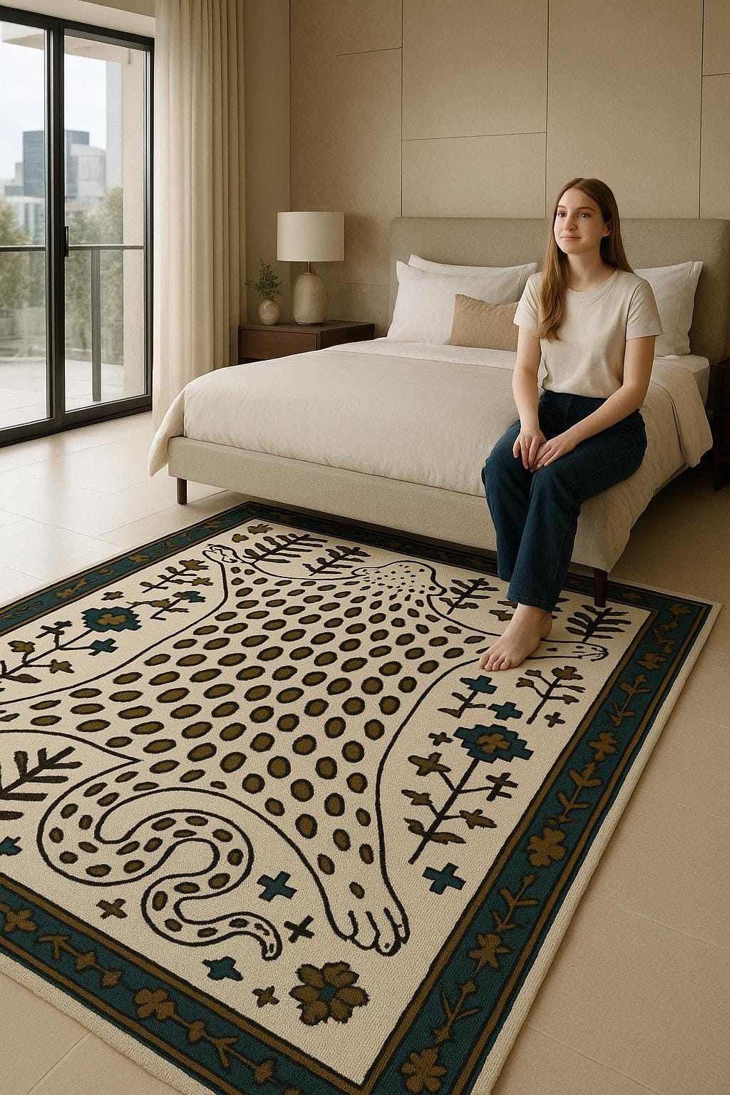 ✨ Bring bold character and artistic elegance into your space with this leopard skin inspired hand tufted rug. The design features a stylised animal hide silhouette with tribal and folk-inspired detailing, creating a statement piece that blends nature, culture, and modern decor beautifully.