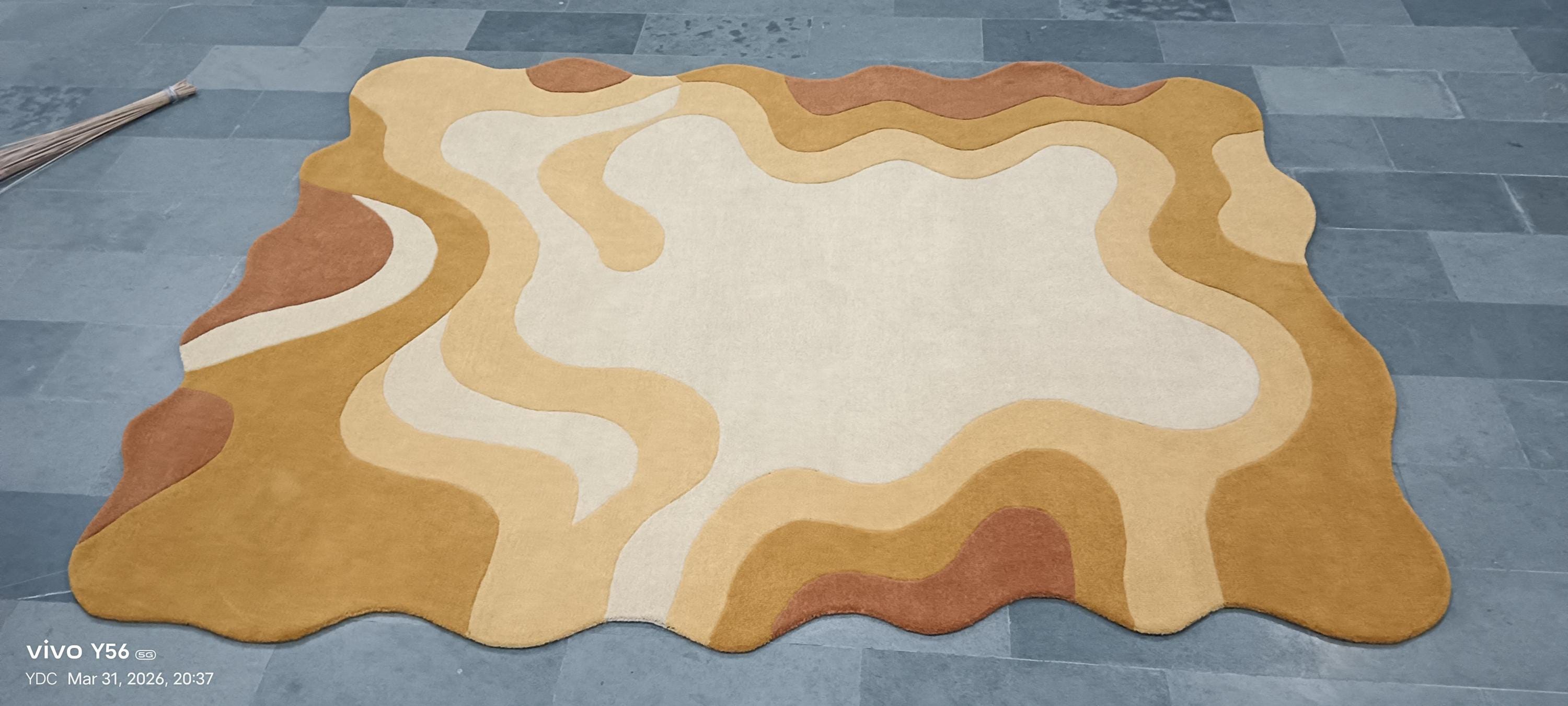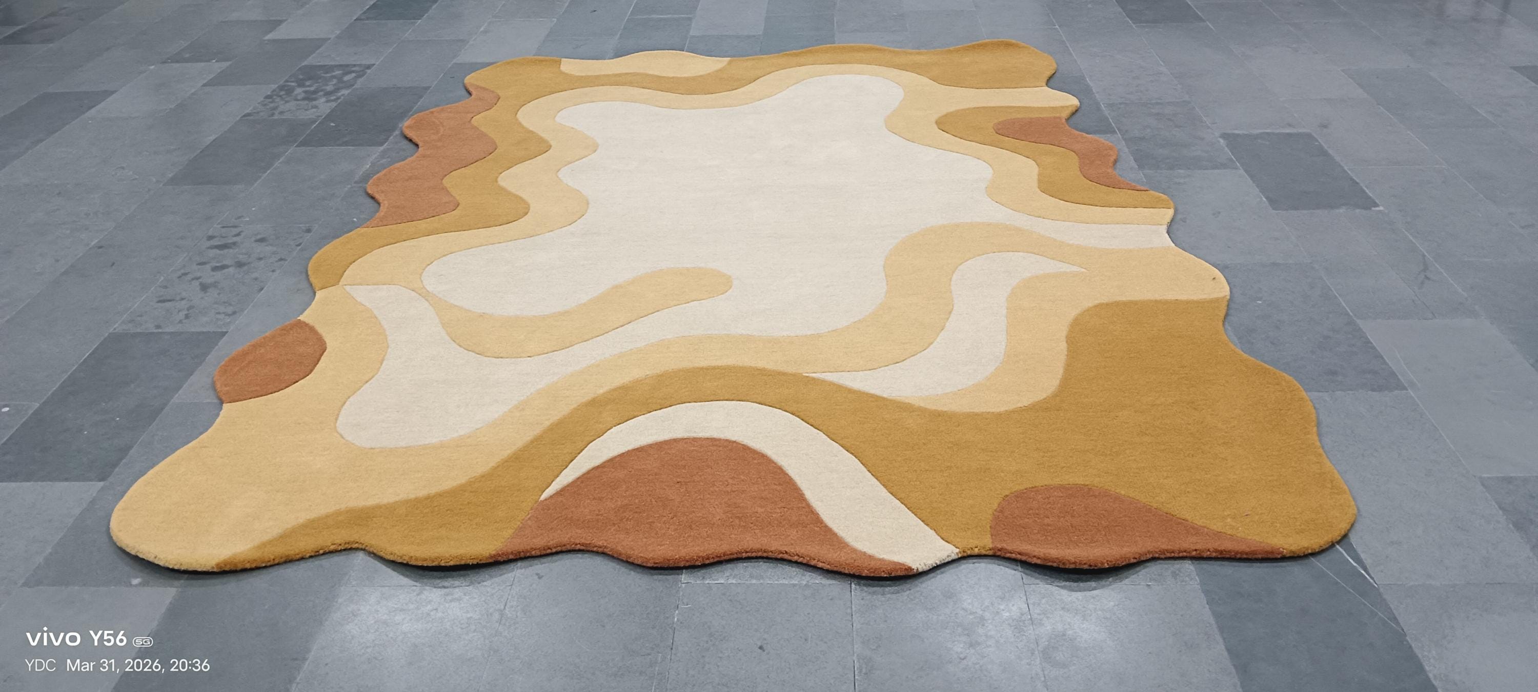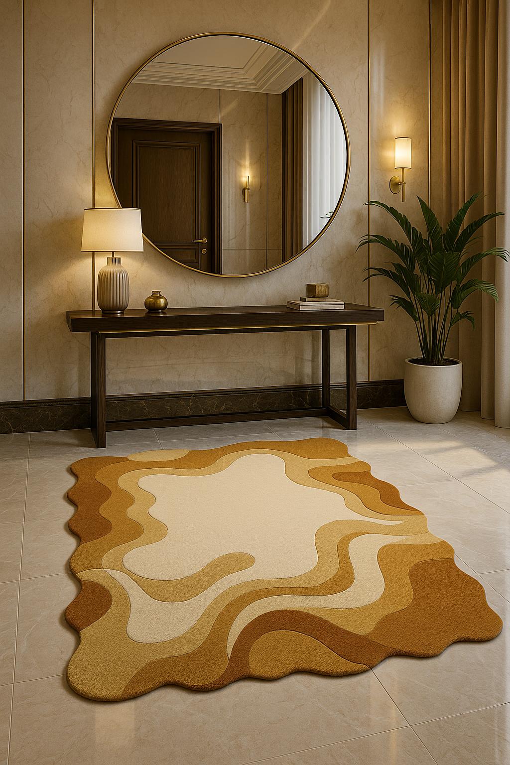 The wavy, asymmetrical contour of this rug draws from natural forms — the edge of a shoreline, the curves of sand dunes, or the soft ripple of wind-blown grass. 🌿🌬️🌊