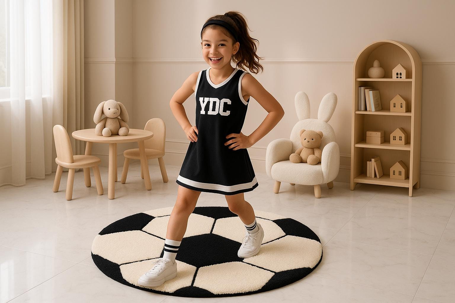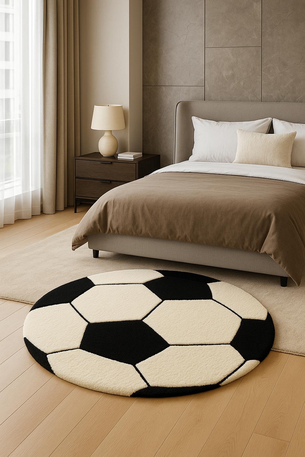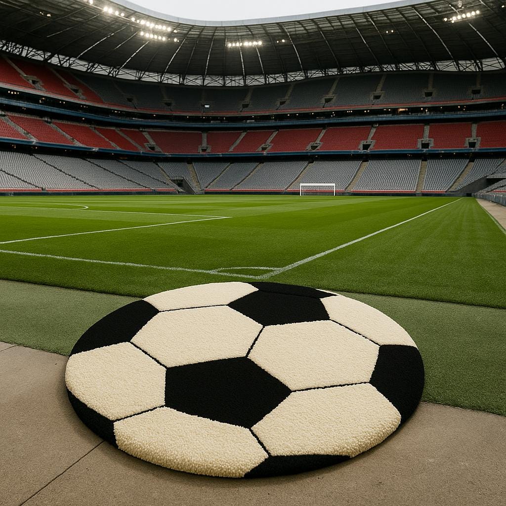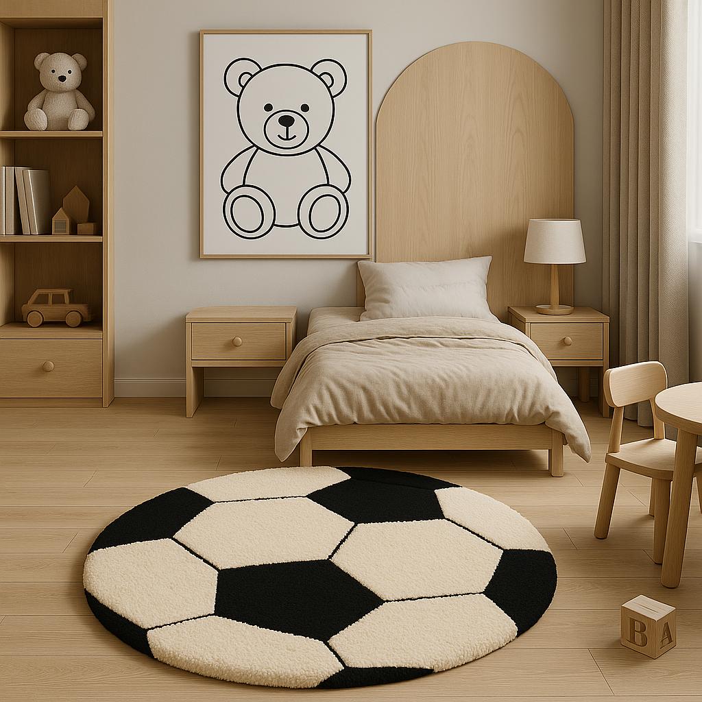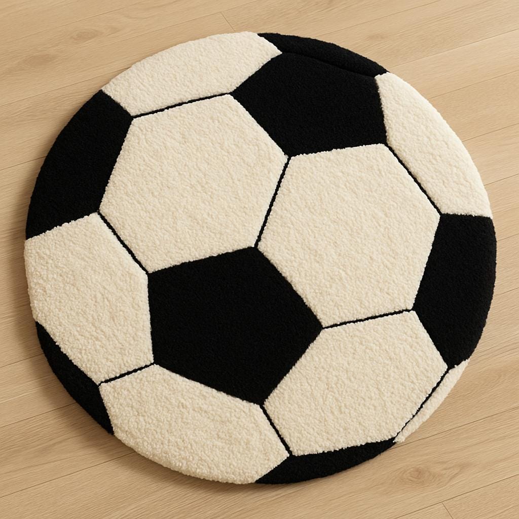 Bring fun, energy, and sporty style into your space with this hand tufted soccer ball rug, inspired by the classic football design. Featuring a bold black and white geometric pattern, this rug is perfect for kids’ rooms, playrooms, game rooms, or sports-themed interiors.