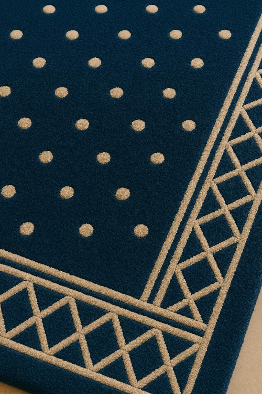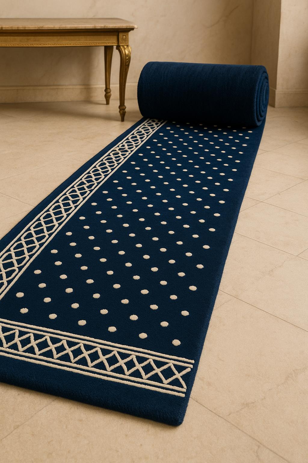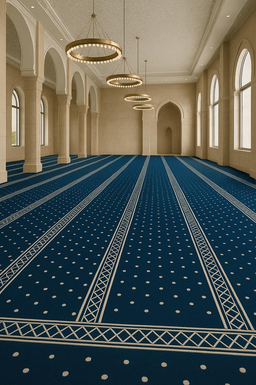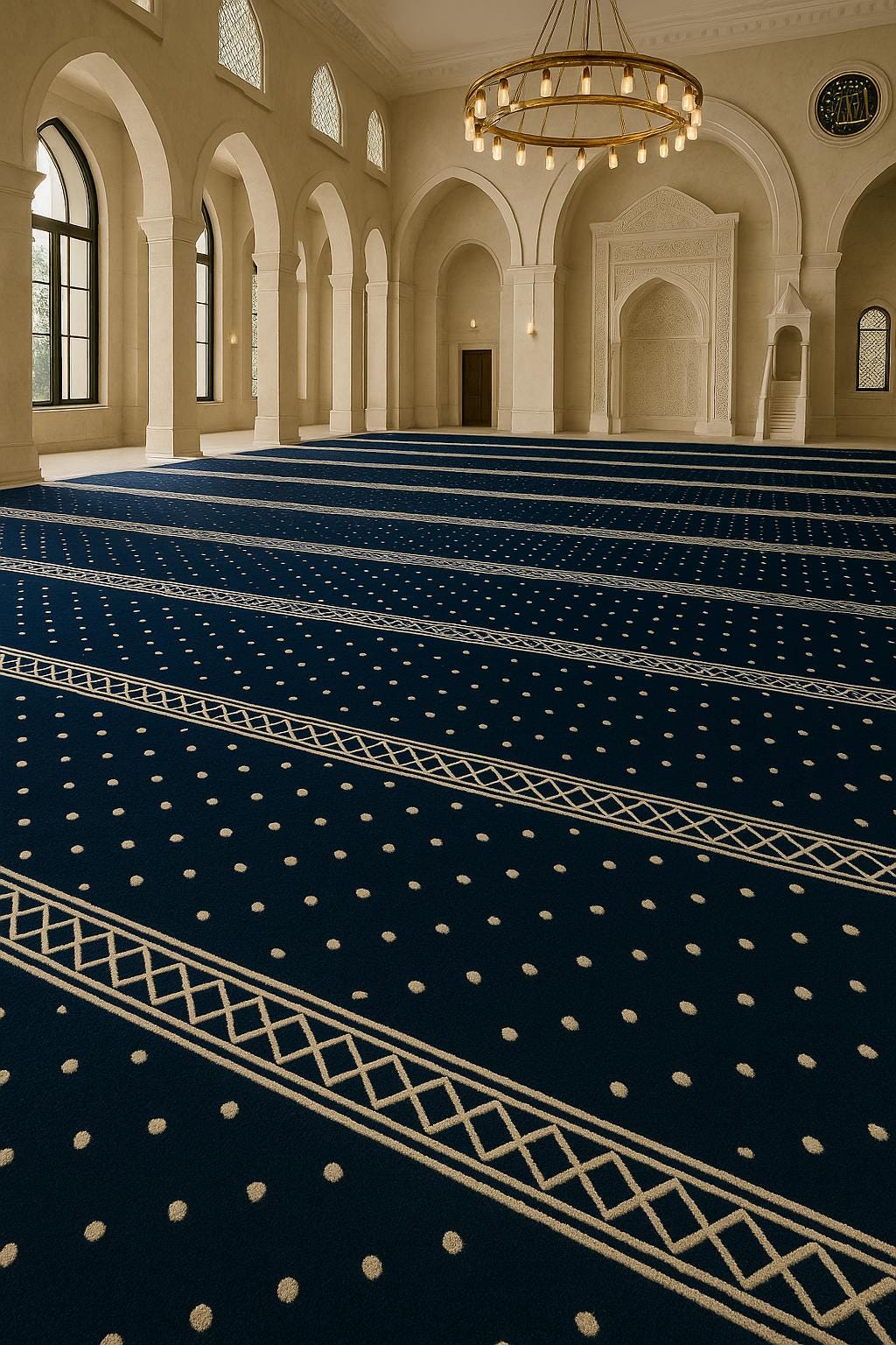 Crafted using New Zealand wool, this carpet offers excellent durability, softness underfoot, and long-lasting performance—ideal for high-traffic religious spaces. The deep blue base with subtle geometric dots and borders reflects timeless Islamic architectural aesthetics.
