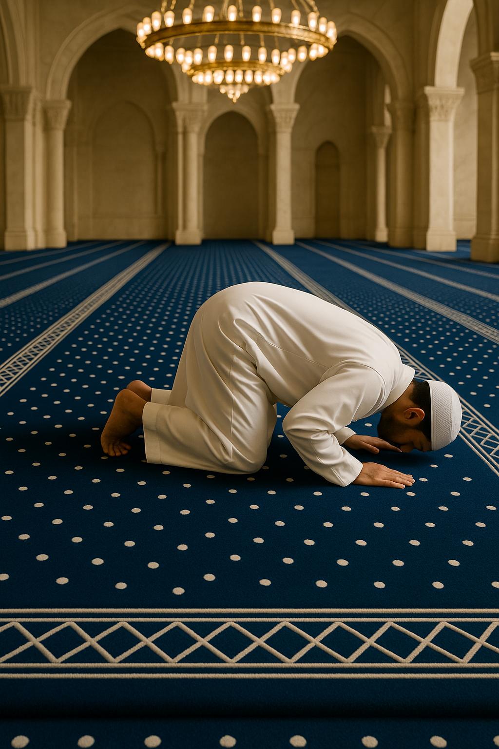 The straight row (saff) alignment helps maintain perfect prayer lines, while the dotted geometric detailing enhances focus, symmetry, and calmness during prayer.