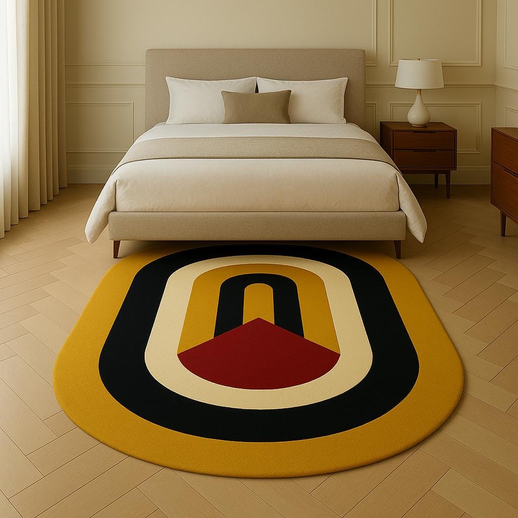 🎨 Design: Retro geometric arch in mustard, black, and red tones.