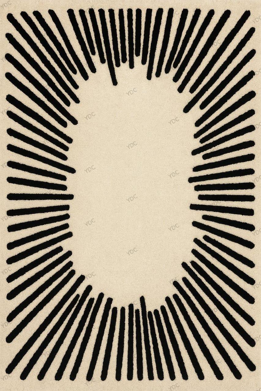 Add a bold artistic touch to your space with this modern sunburst area rug, featuring a striking black radial pattern emerging over a soft ivory base. The dynamic circular design creates a sense of movement and depth, making it a perfect statement piece for contemporary interiors.