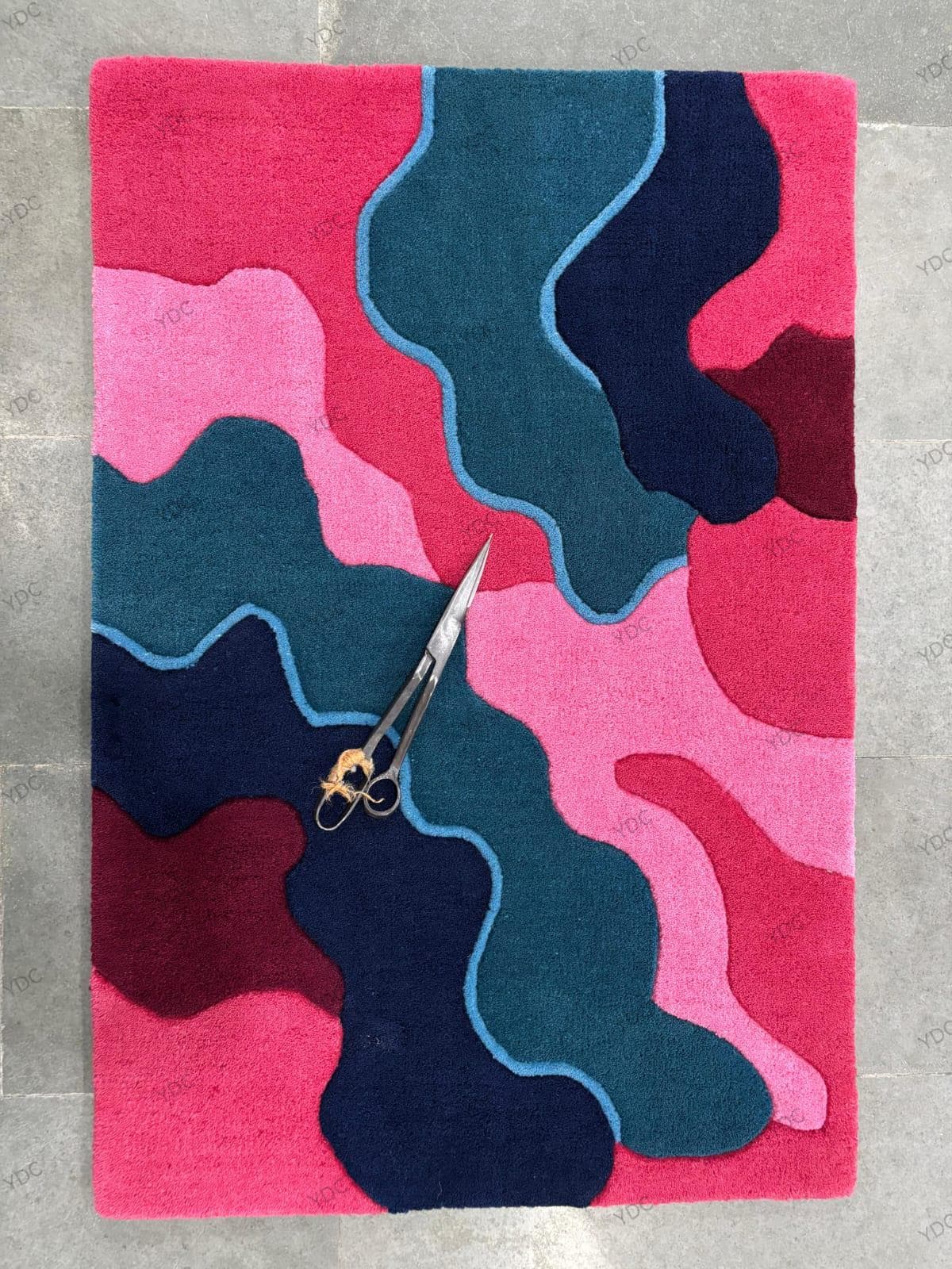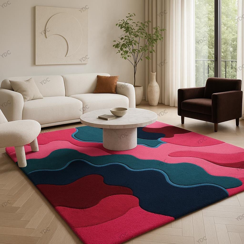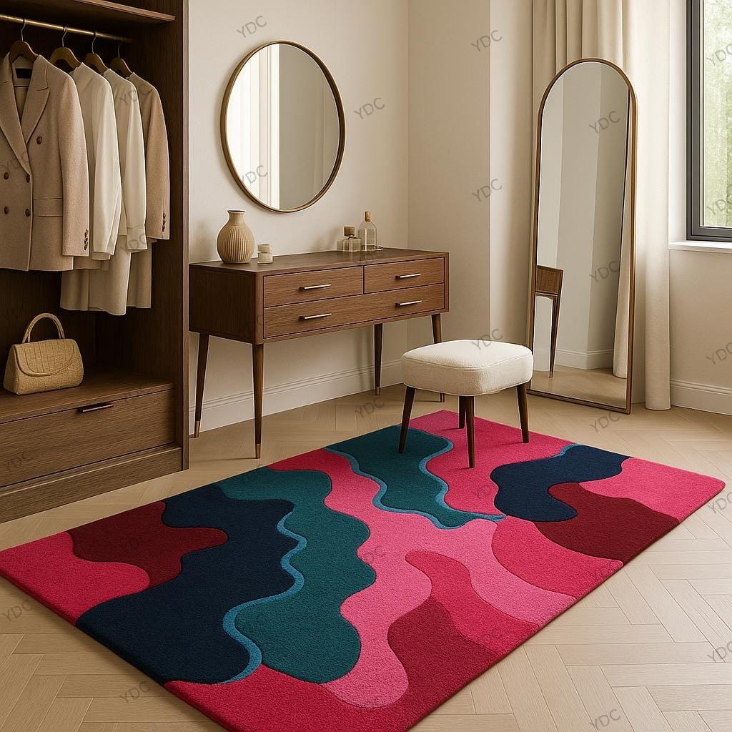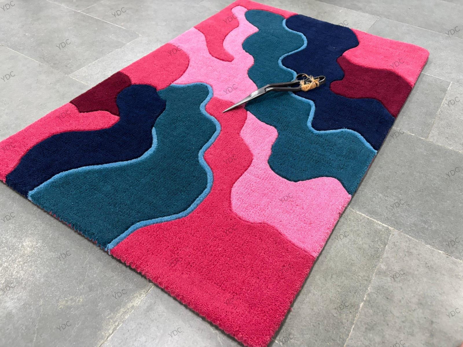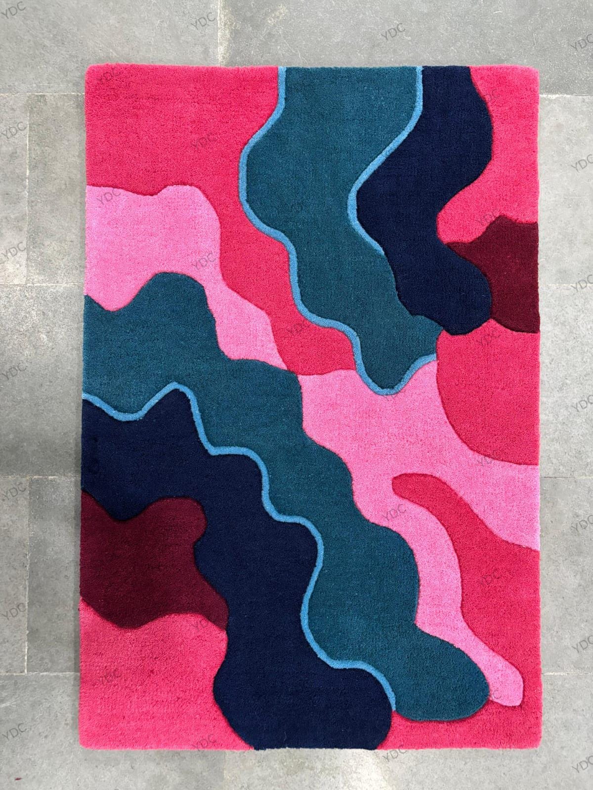 This "Vivid Cascade" hand-tufted rug is crafted for those who crave color, energy, and personality in their home. With sweeping waves of vibrant pink, deep teal, navy blue, and rich burgundy, all outlined by elegant contours, it creates a sense of movement, dimension, and modern style. Whether your decor leans minimalist or maximalist, this piece becomes the focal point that pulls your whole room together.