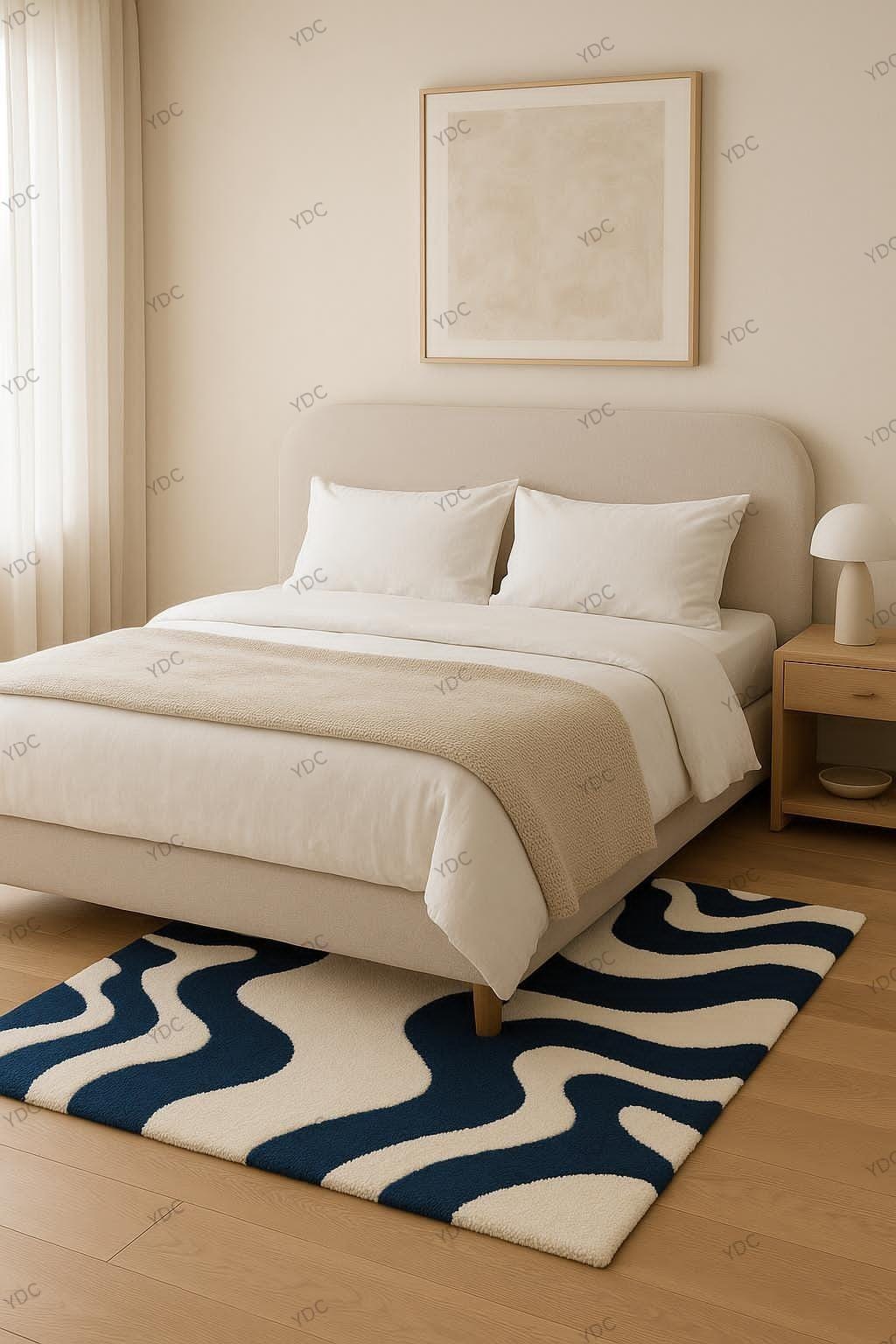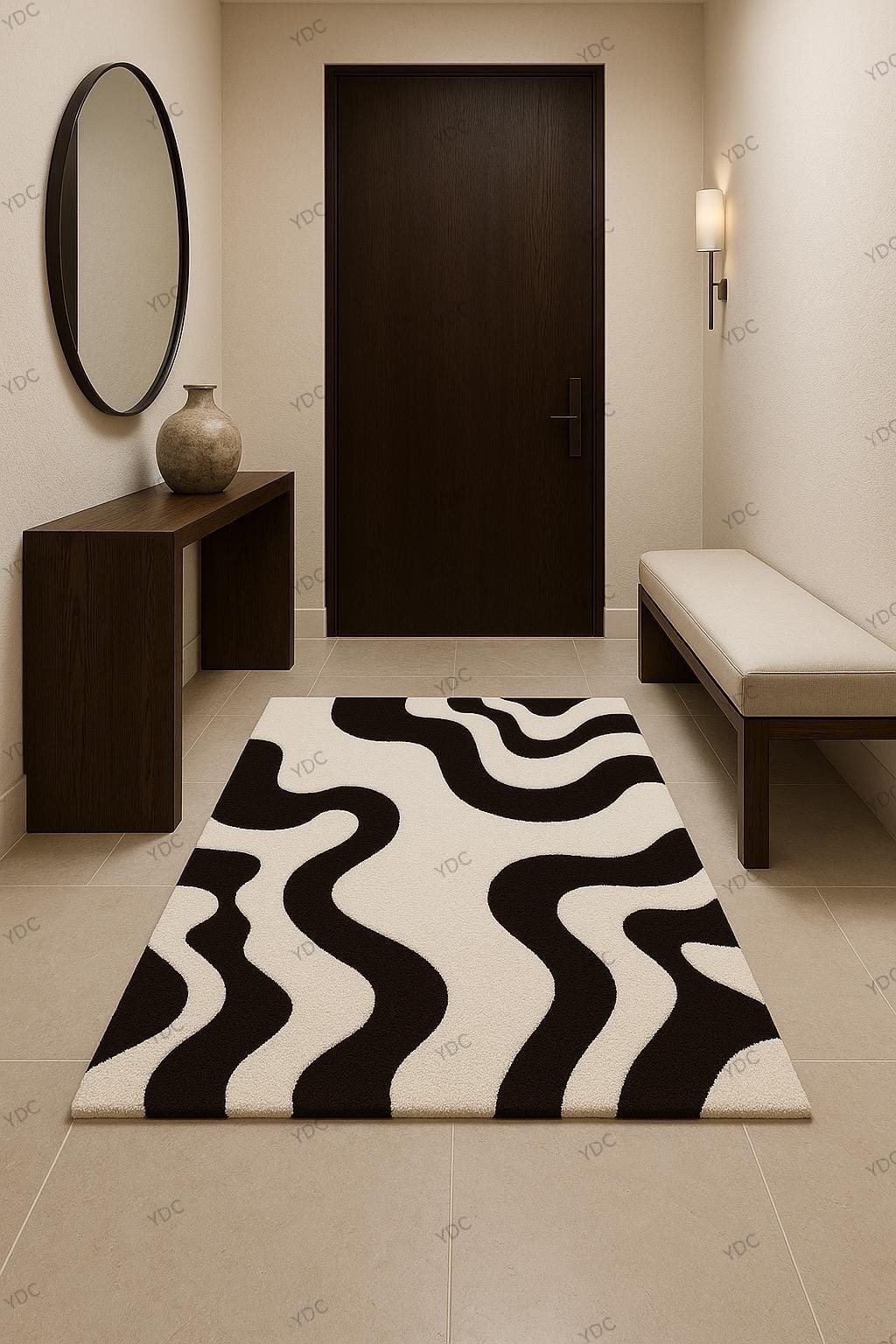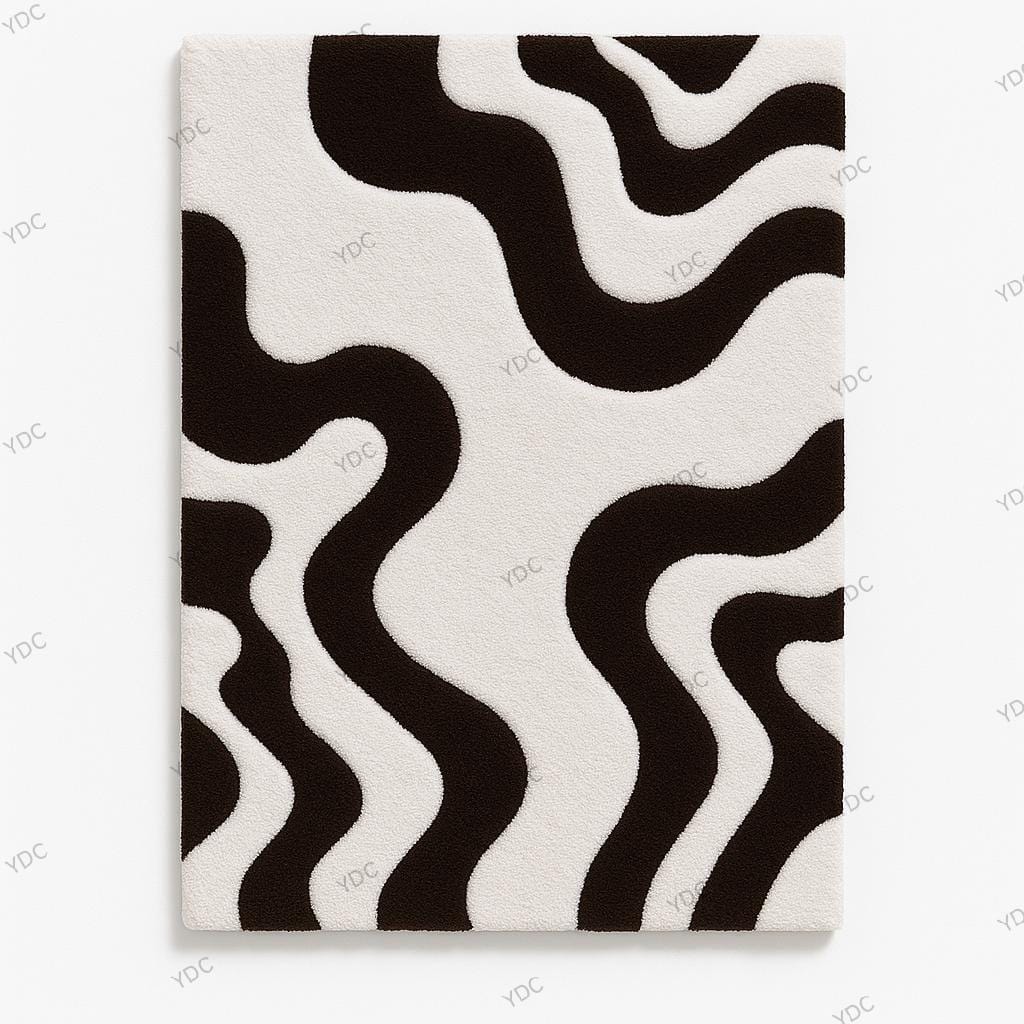 Give your space a bold designer statement with this Black and White Wavy Abstract Rug. Its flowing curves and high-contrast pattern bring a modern, eye-catching look to any living room, bedroom, hallway or creative space.
