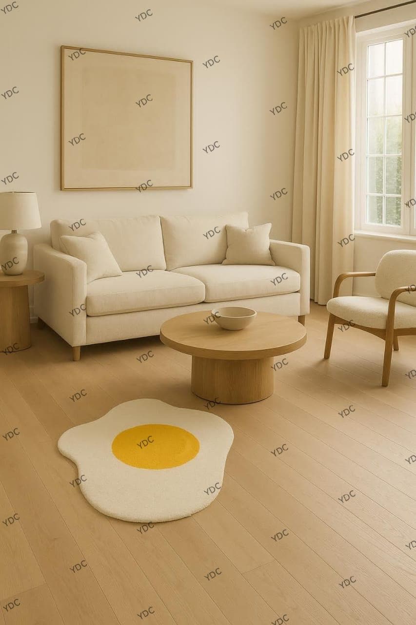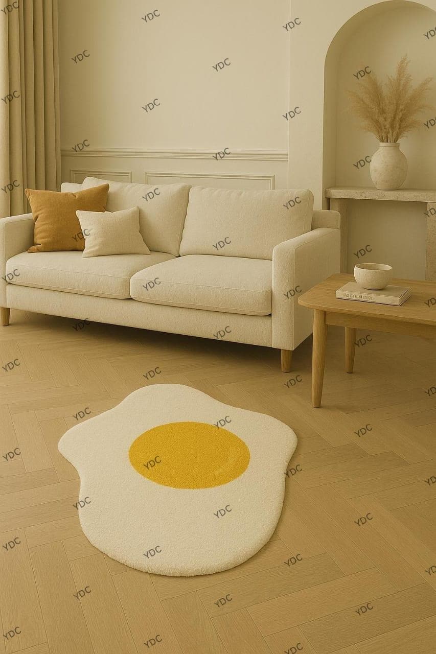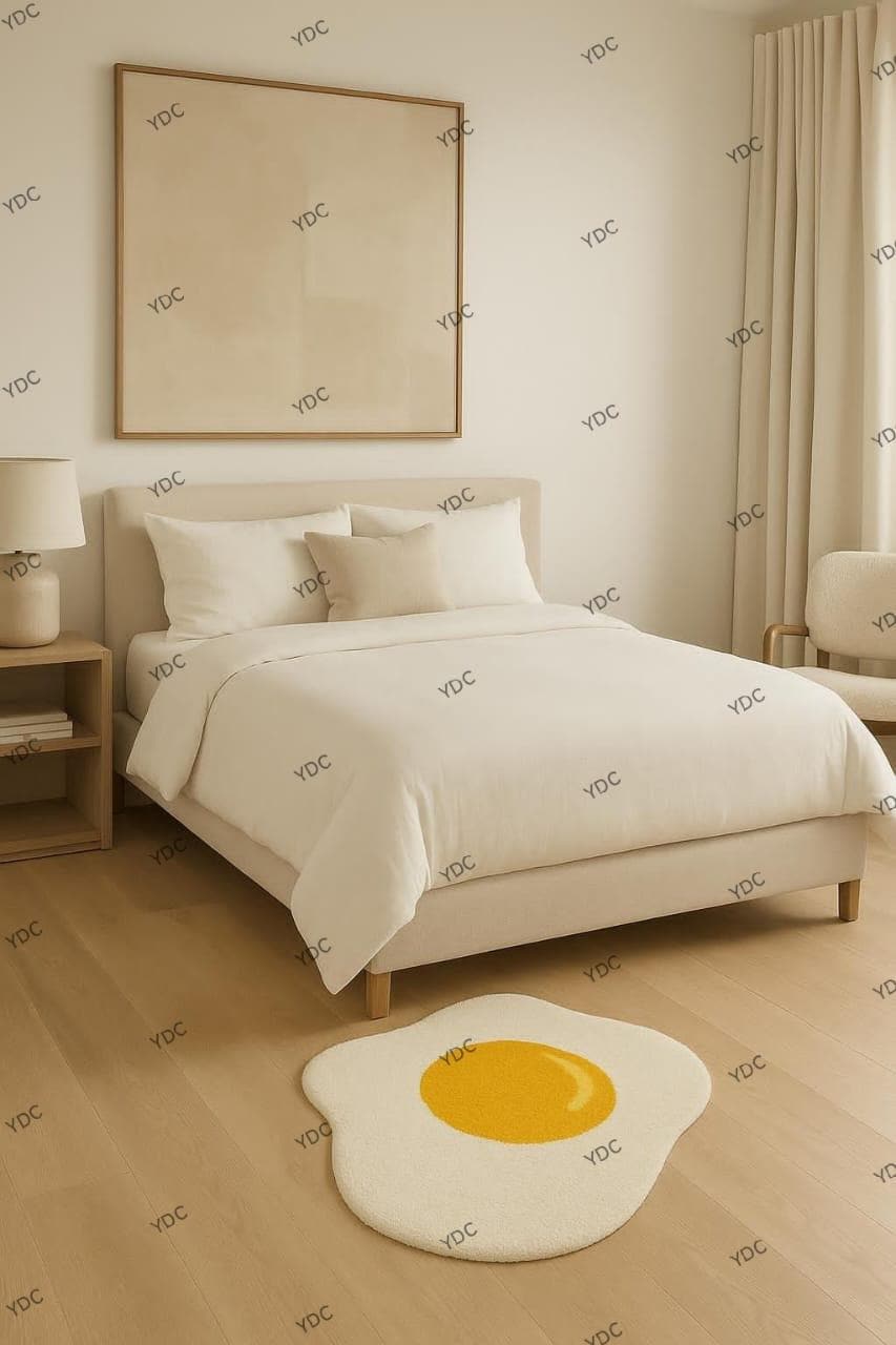 This charming egg-shaped irregular hand tufted rug is inspired by a playful fried-egg design, featuring a soft organic outline with a warm central accent. Its minimalist yet fun look makes it an eye-catching statement piece for modern homes, kids’ rooms, nurseries, bedrooms, reading corners, and creative living spaces.