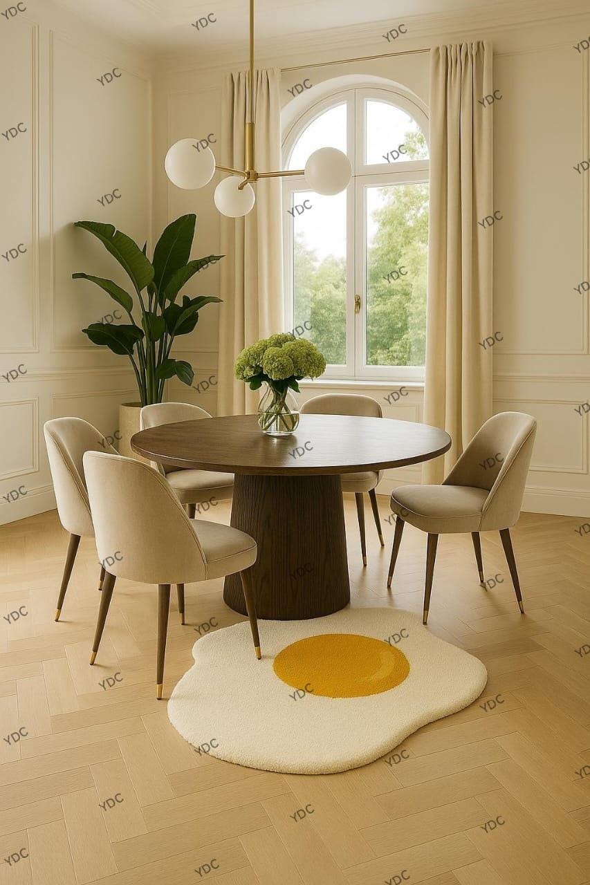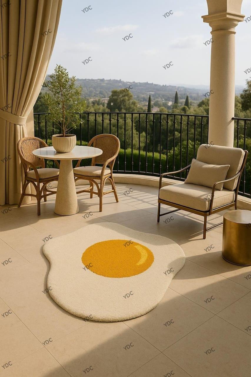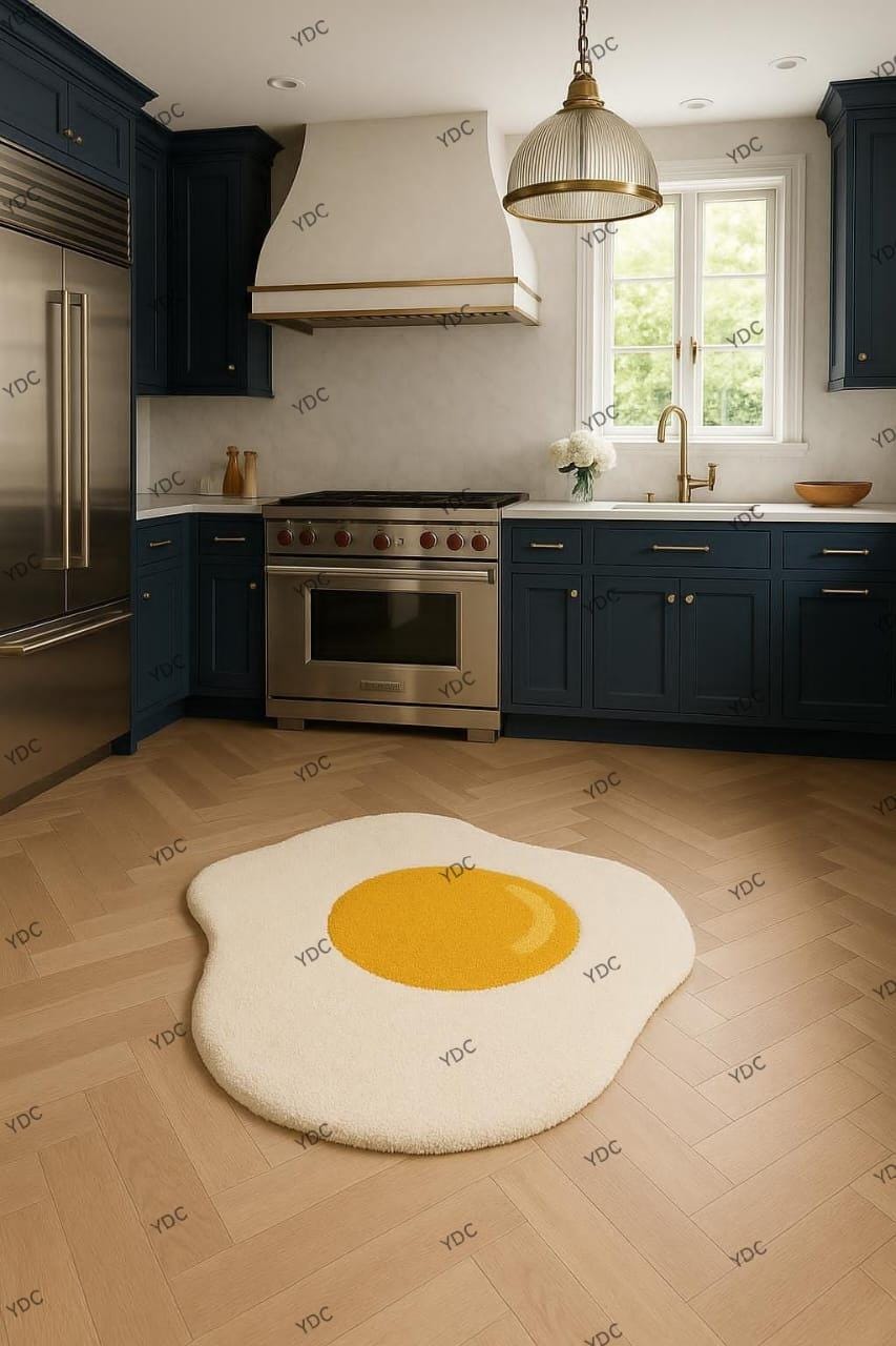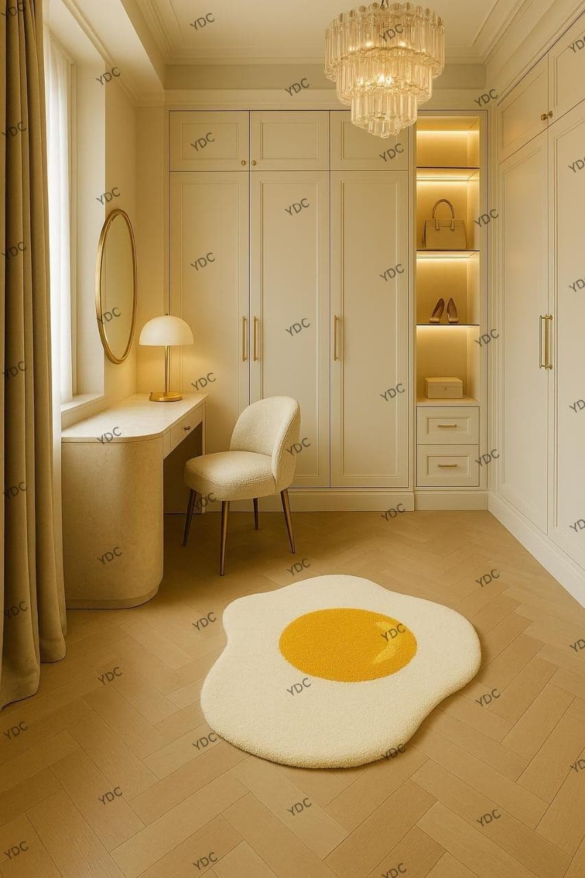This charming egg-shaped irregular hand tufted rug is inspired by a playful fried-egg design, featuring a soft organic outline with a warm central accent. Its minimalist yet fun look makes it an eye-catching statement piece for modern homes, kids’ rooms, nurseries, bedrooms, reading corners, and creative living spaces.