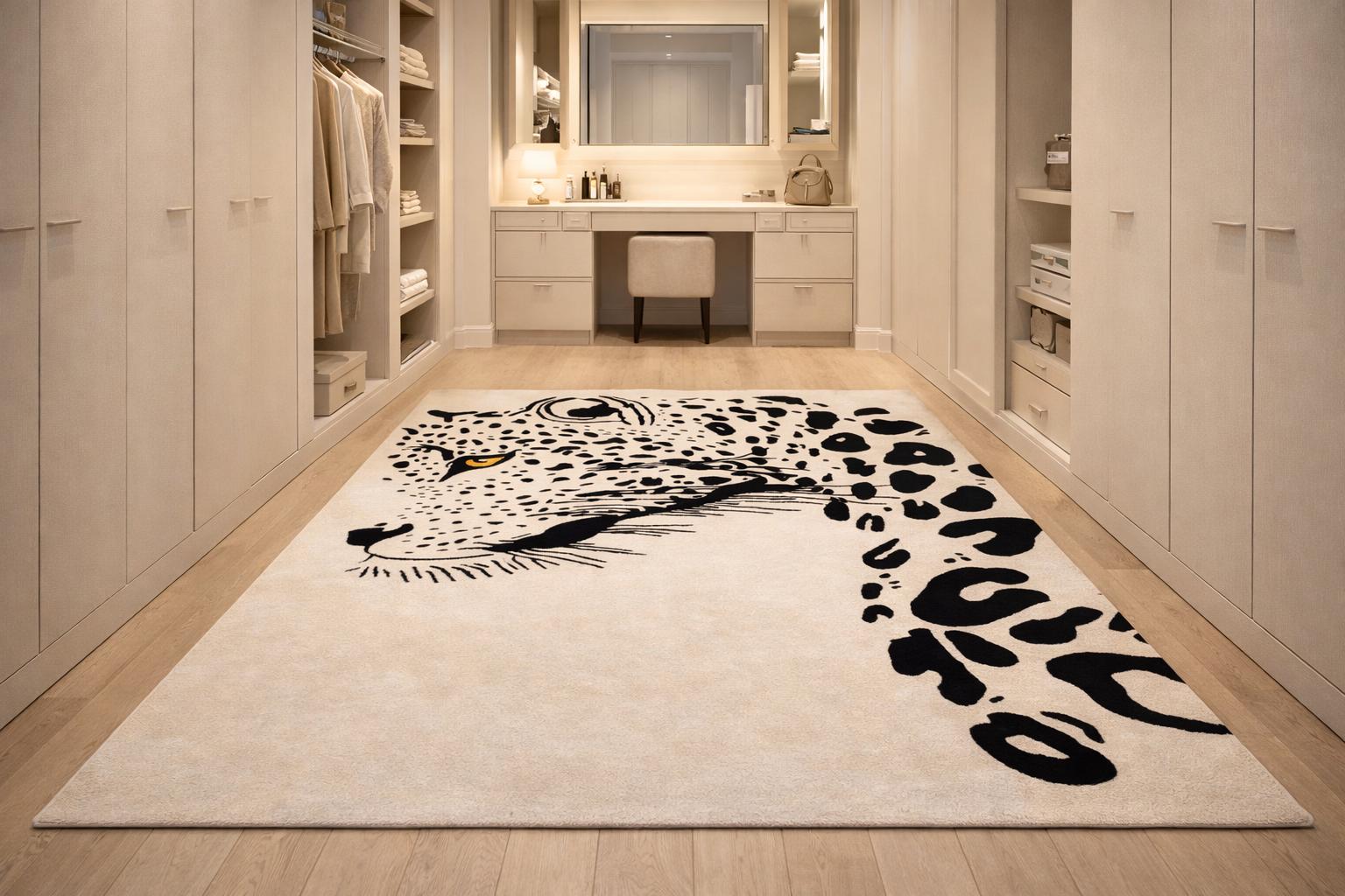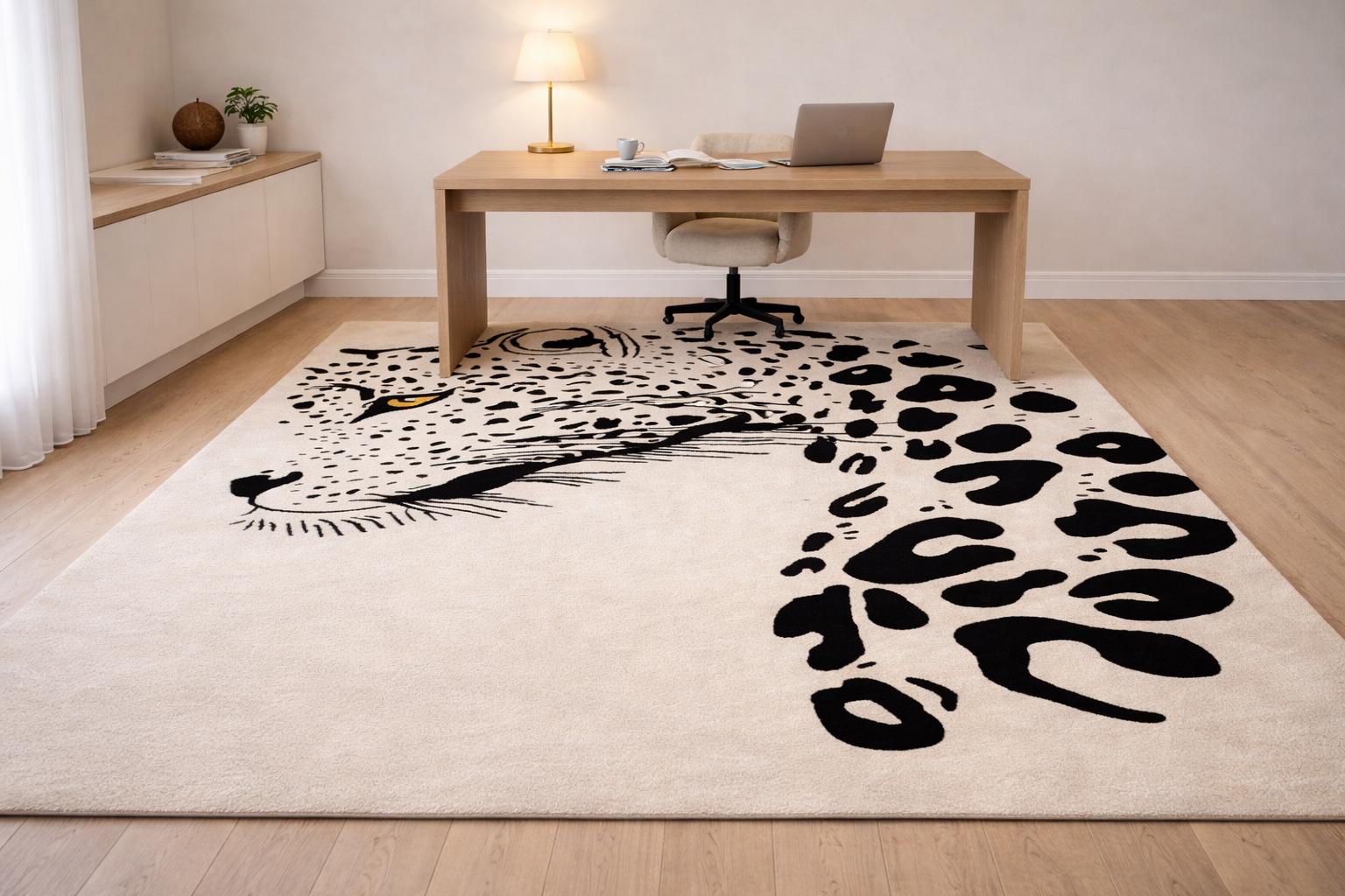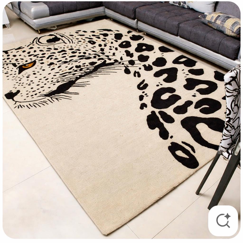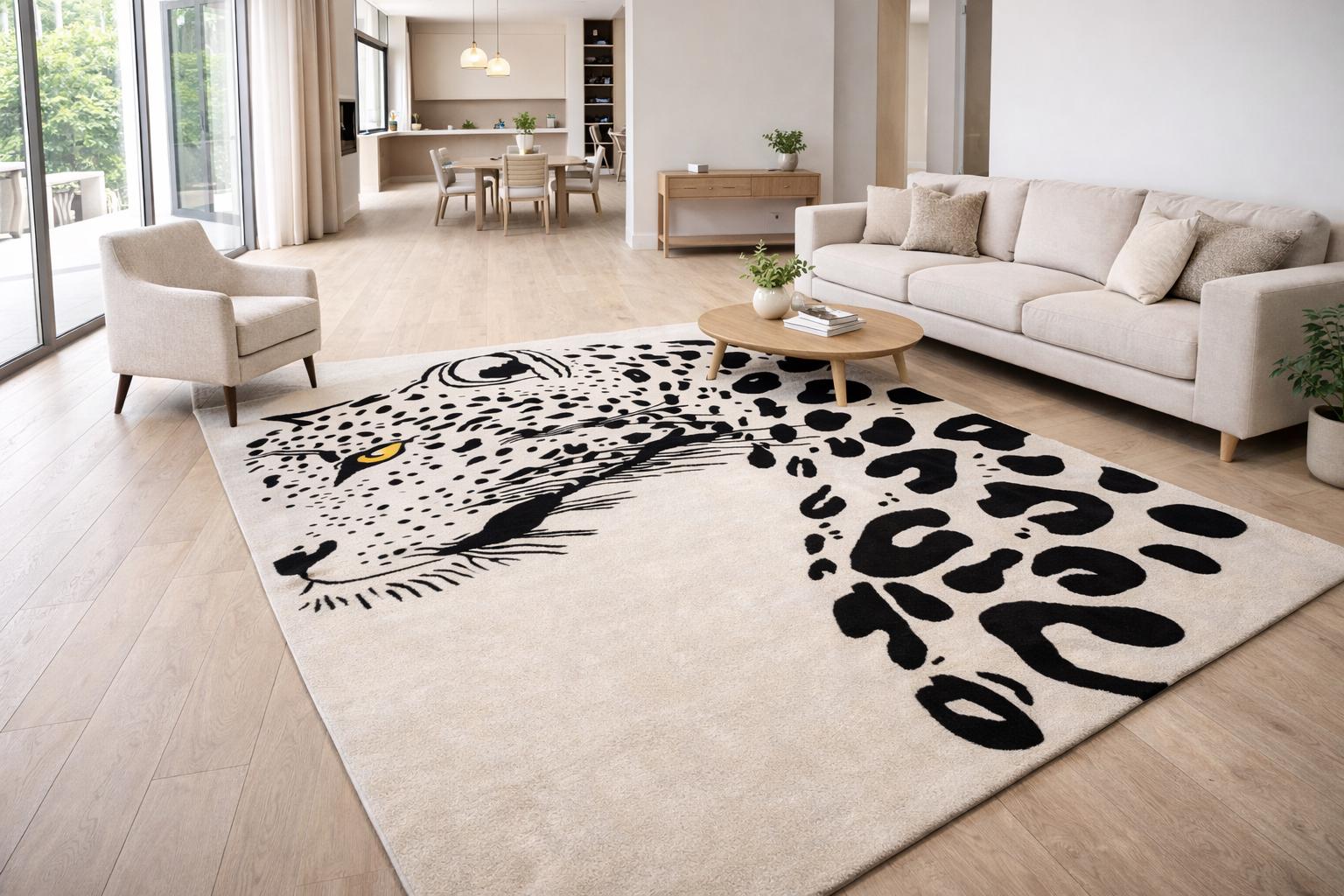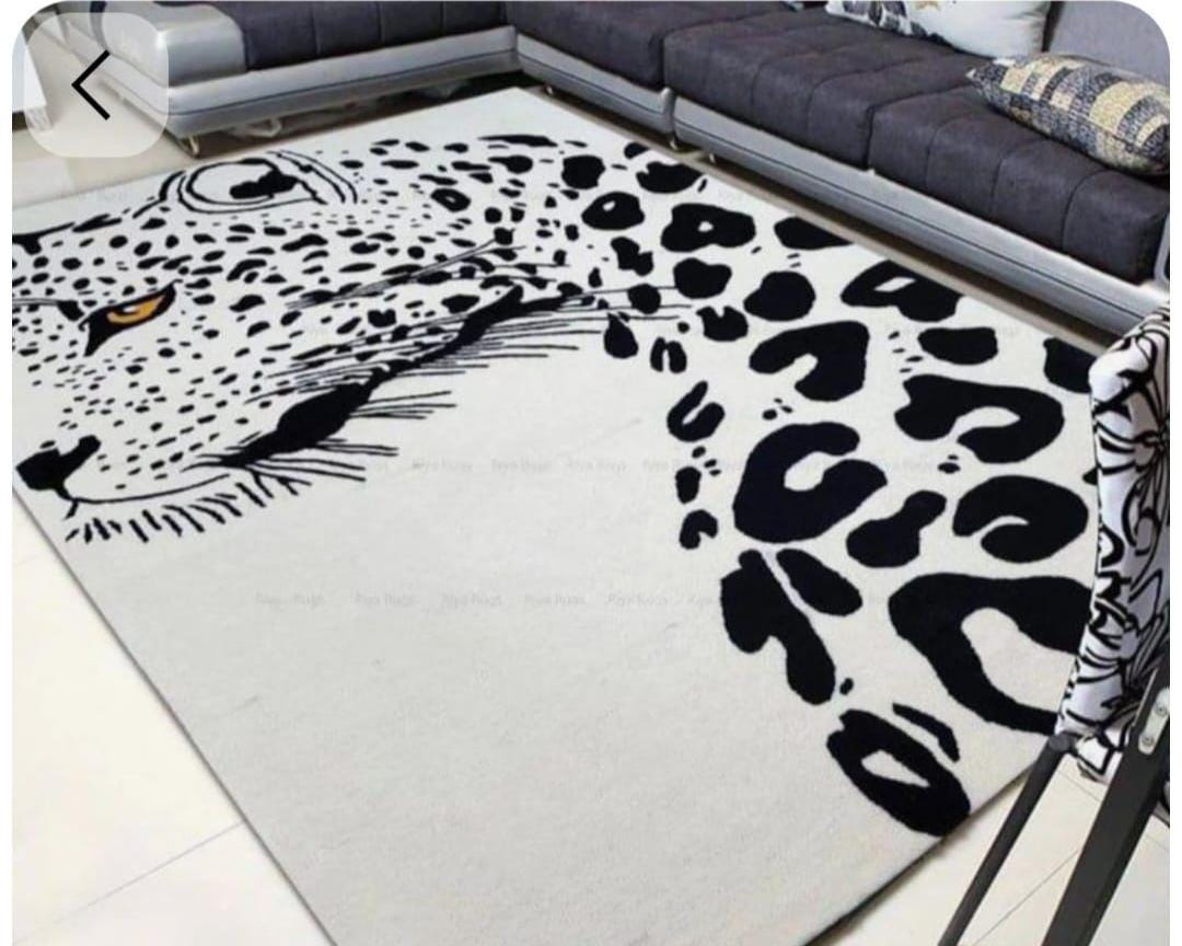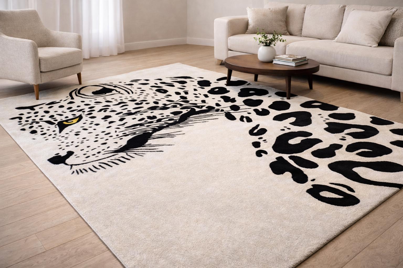 Make a bold statement in your living space with this striking hand tufted leopard face rug. Featuring a powerful leopard portrait with abstract spotted detailing, this rug brings a perfect balance of modern art and wild elegance. Its clean contrast and detailed craftsmanship make it an eye-catching centerpiece for contemporary living rooms, lounges, studios, or creative interiors.