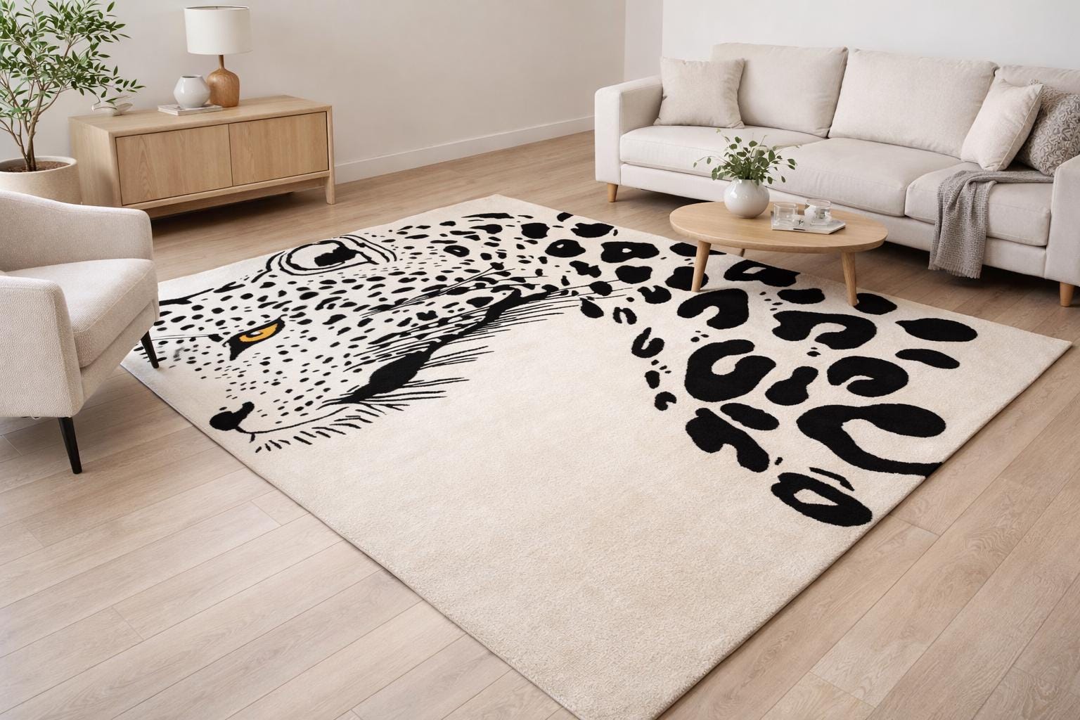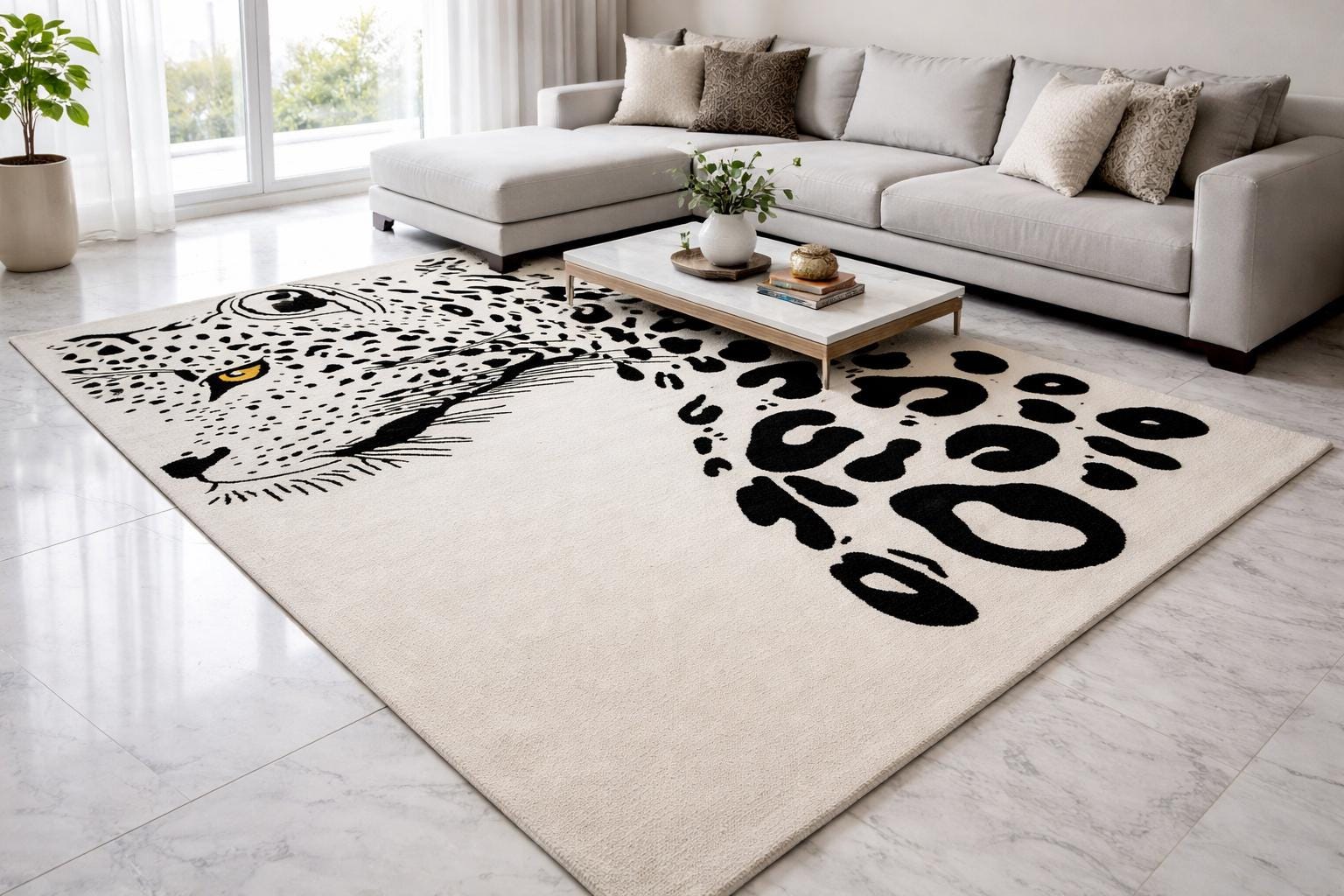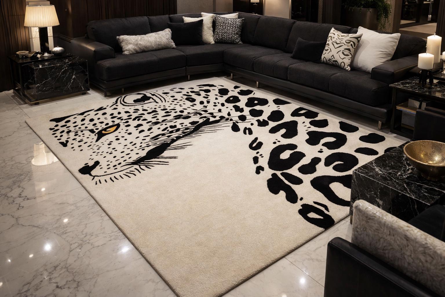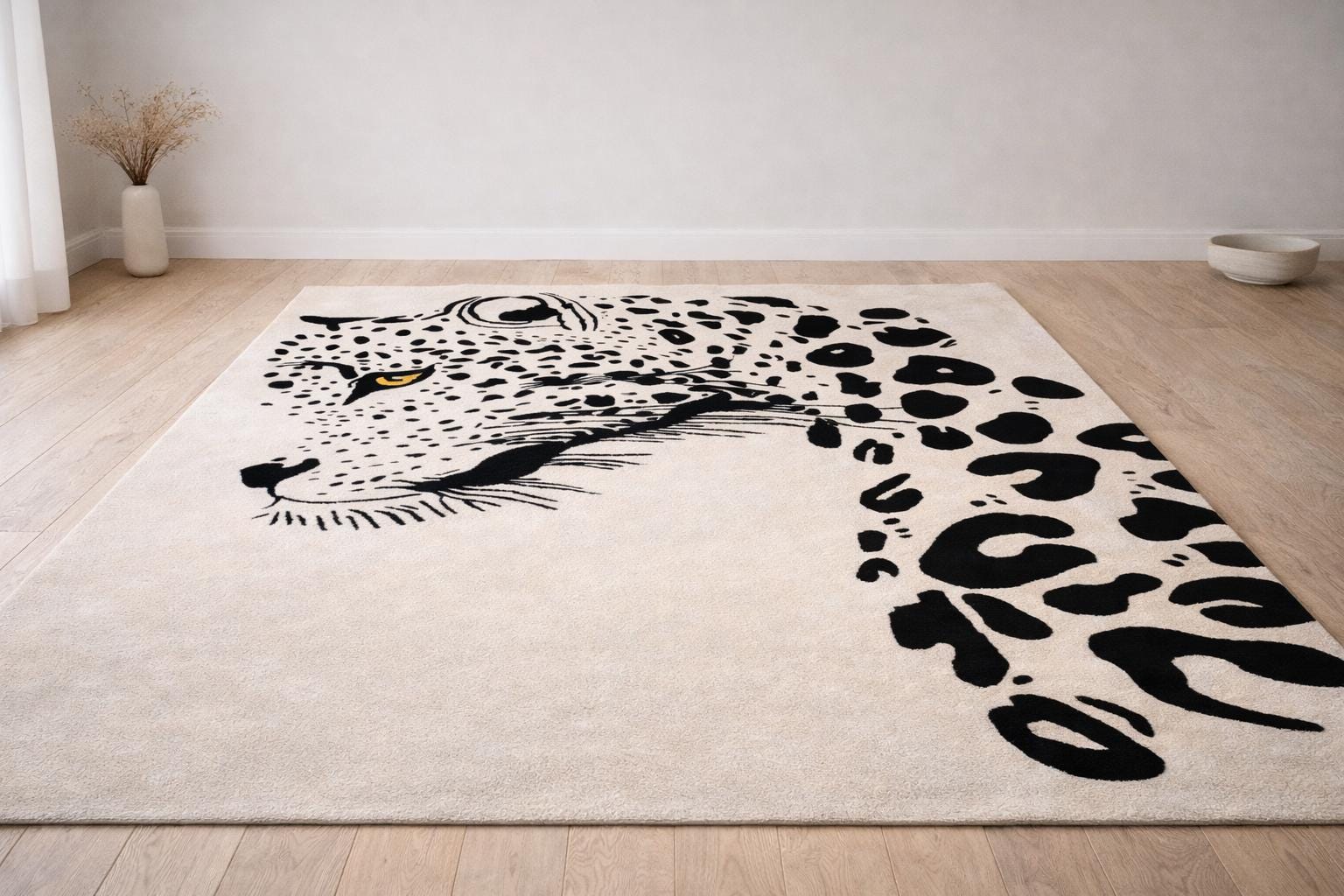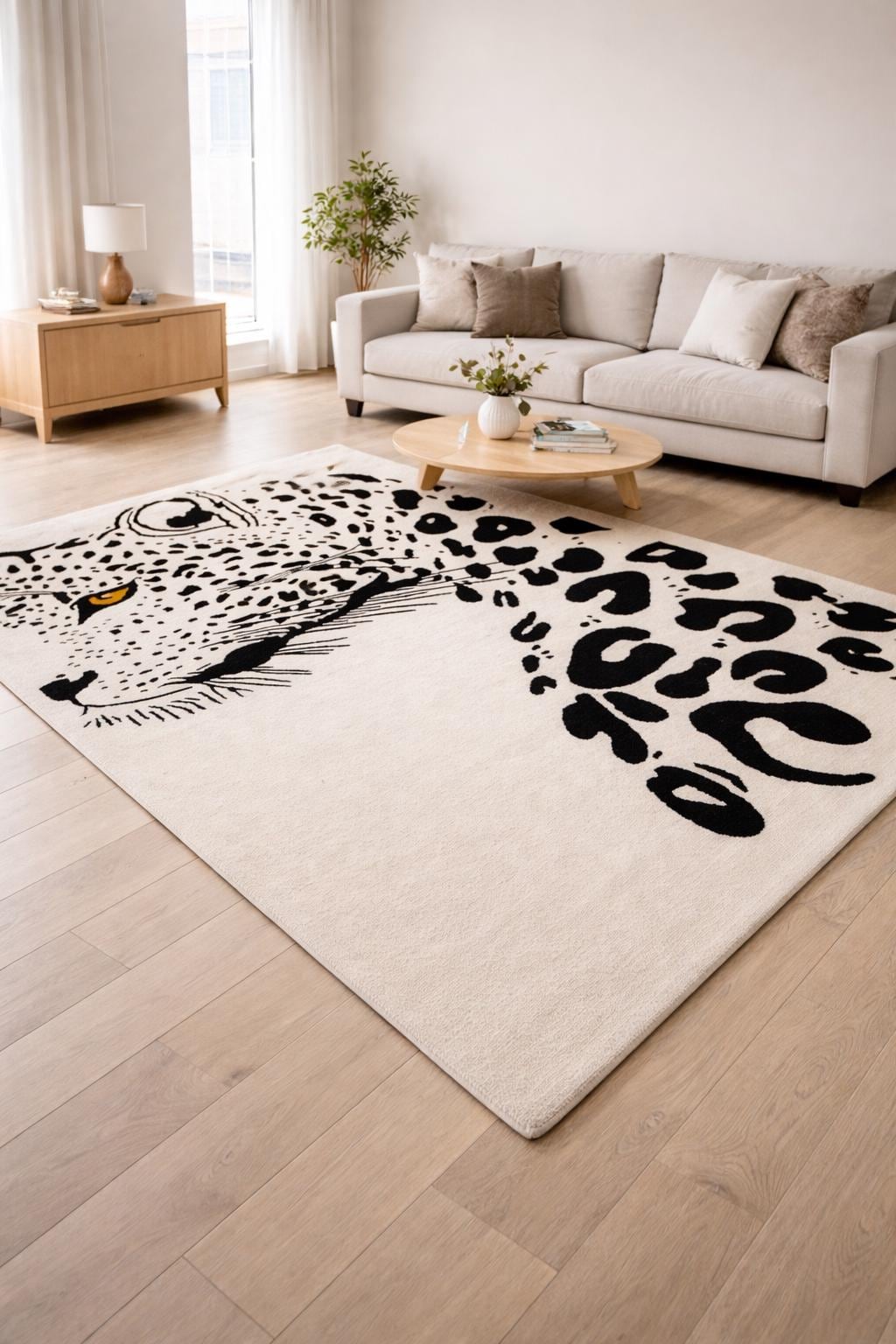 Make a bold statement in your living space with this striking hand tufted leopard face rug. Featuring a powerful leopard portrait with abstract spotted detailing, this rug brings a perfect balance of modern art and wild elegance. Its clean contrast and detailed craftsmanship make it an eye-catching centerpiece for contemporary living rooms, lounges, studios, or creative interiors.
