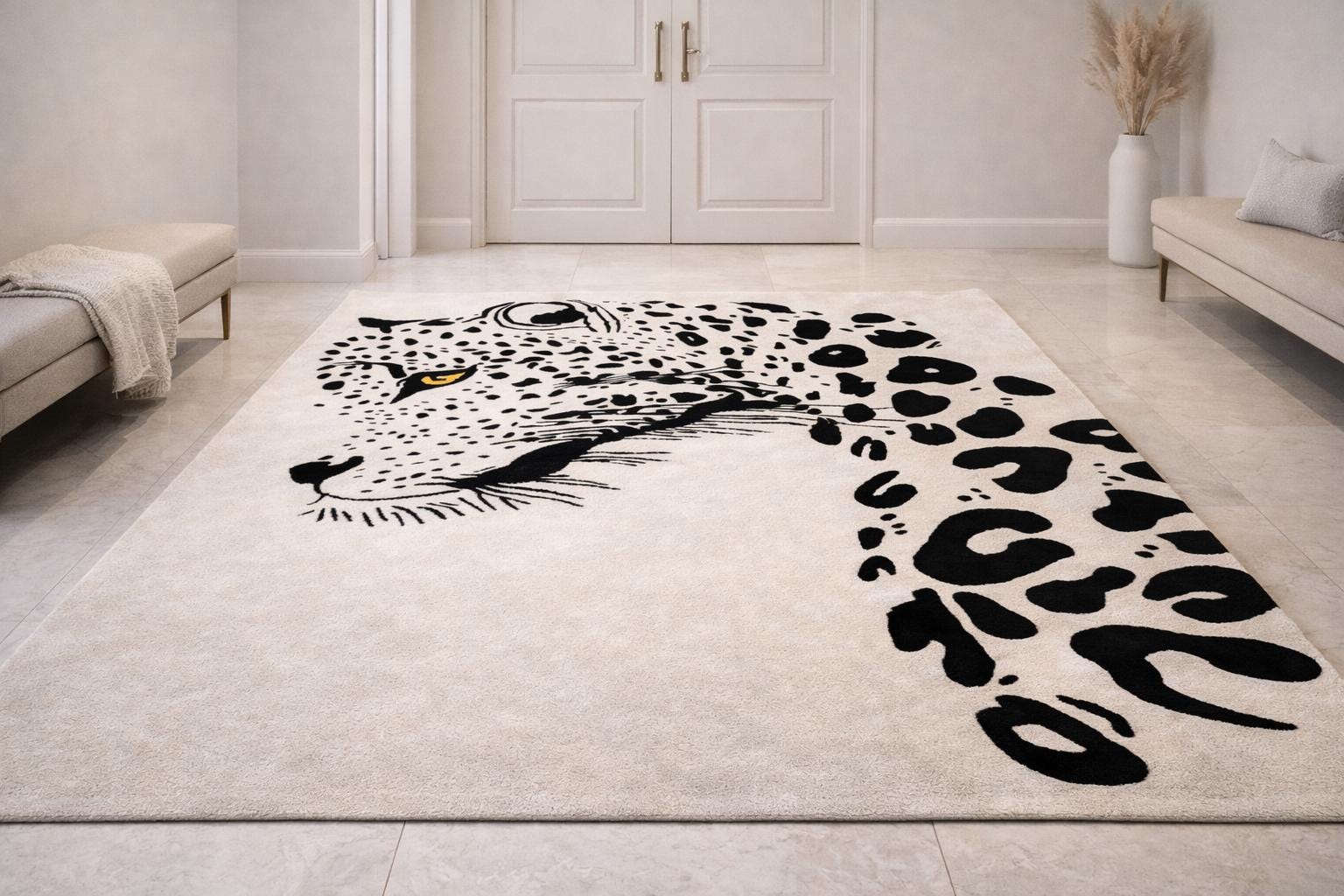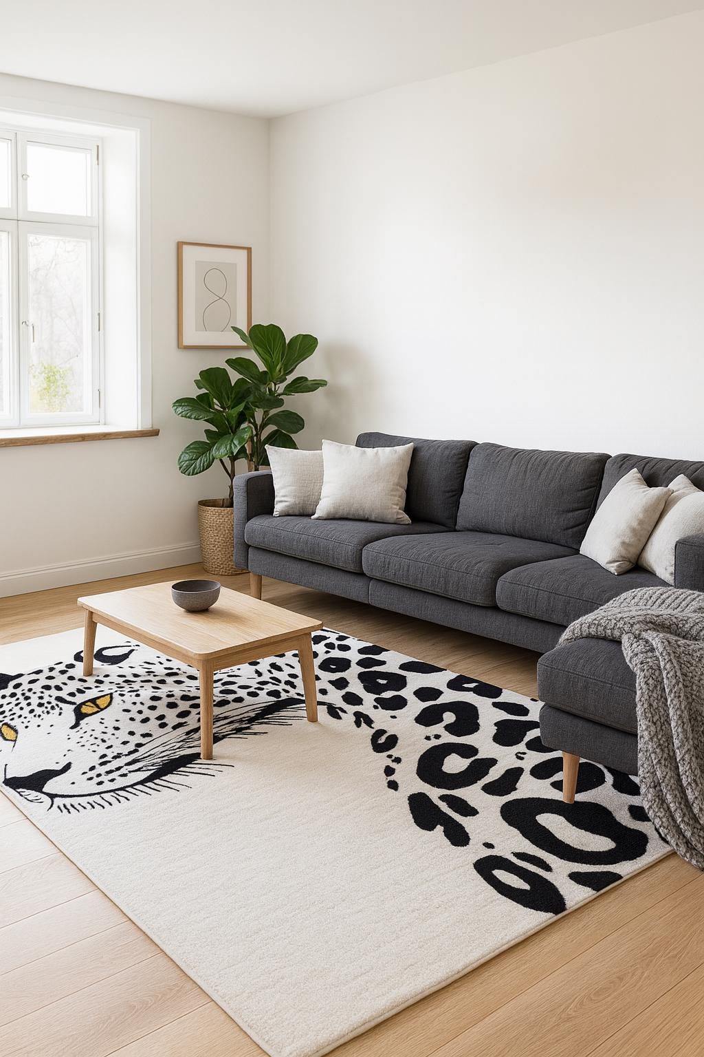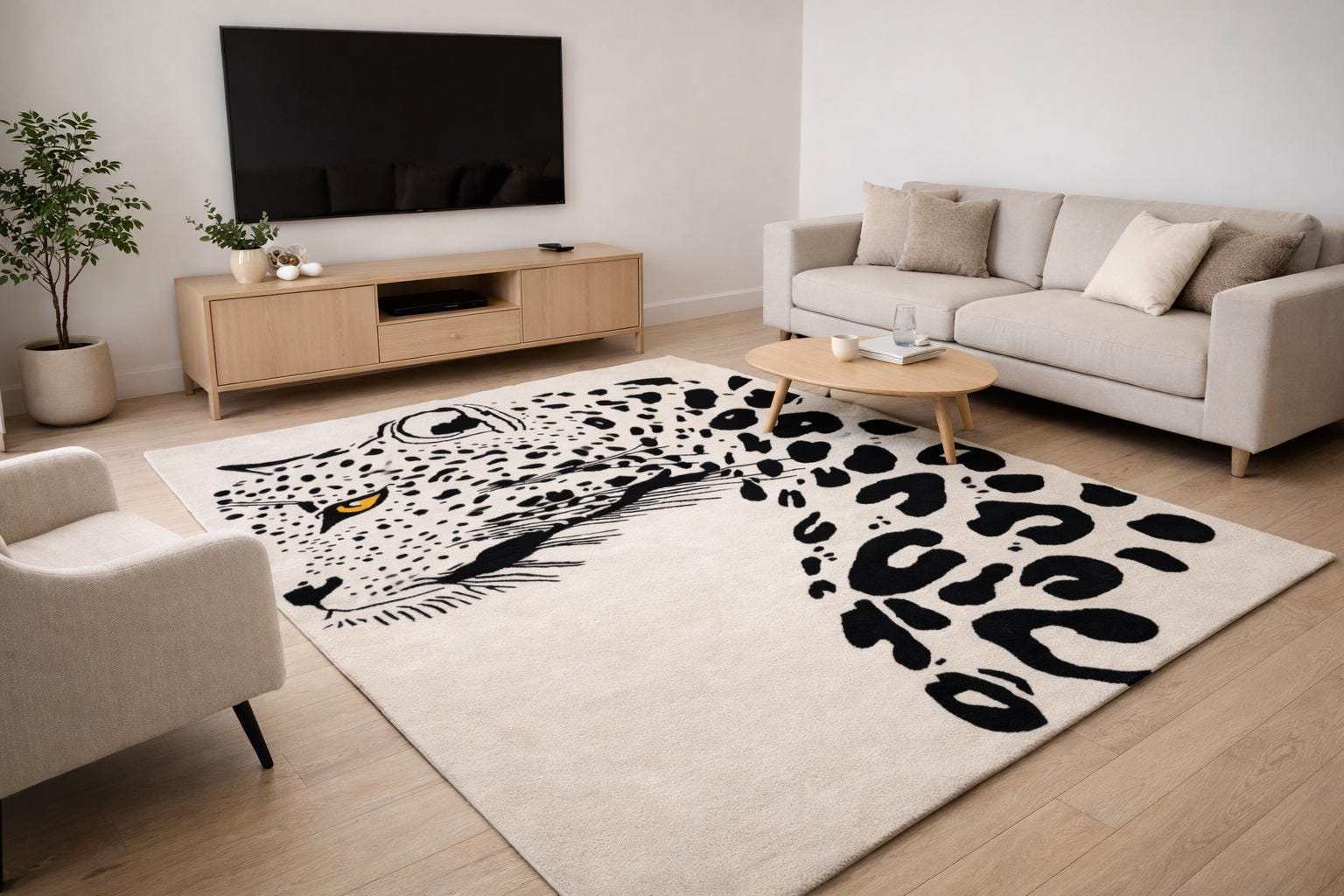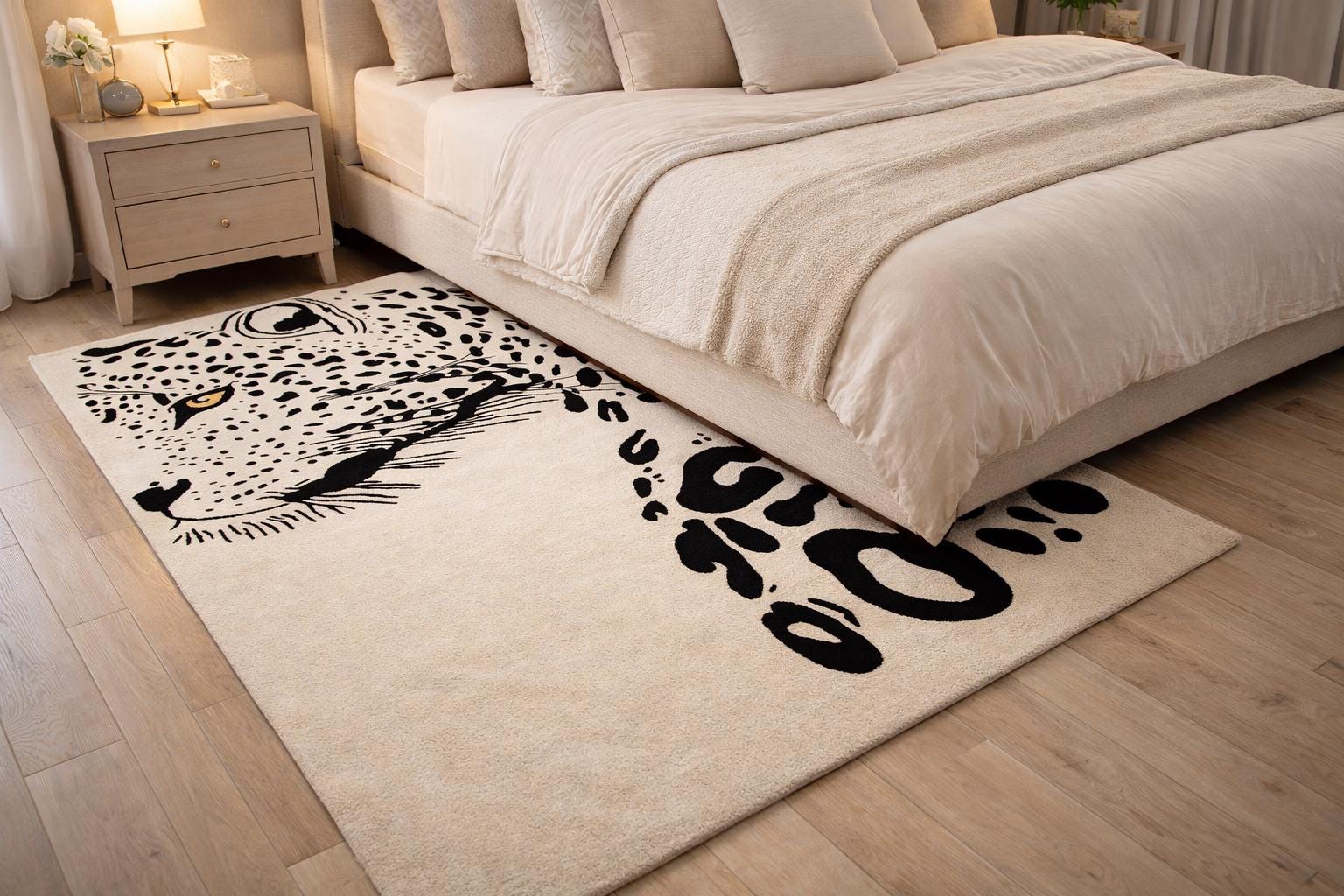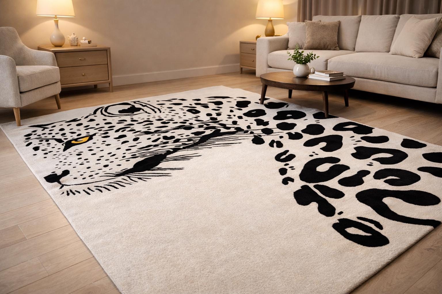 Make a bold statement in your living space with this striking hand tufted leopard face rug. Featuring a powerful leopard portrait with abstract spotted detailing, this rug brings a perfect balance of modern art and wild elegance. Its clean contrast and detailed craftsmanship make it an eye-catching centerpiece for contemporary living rooms, lounges, studios, or creative interiors.