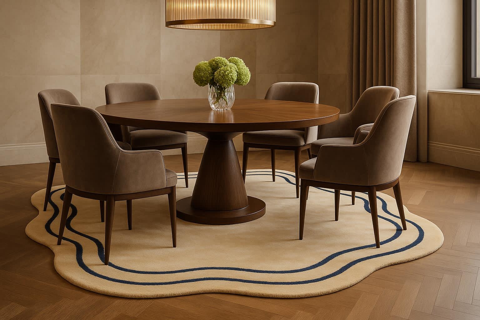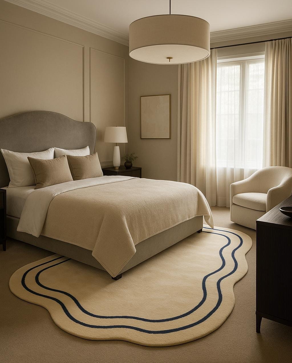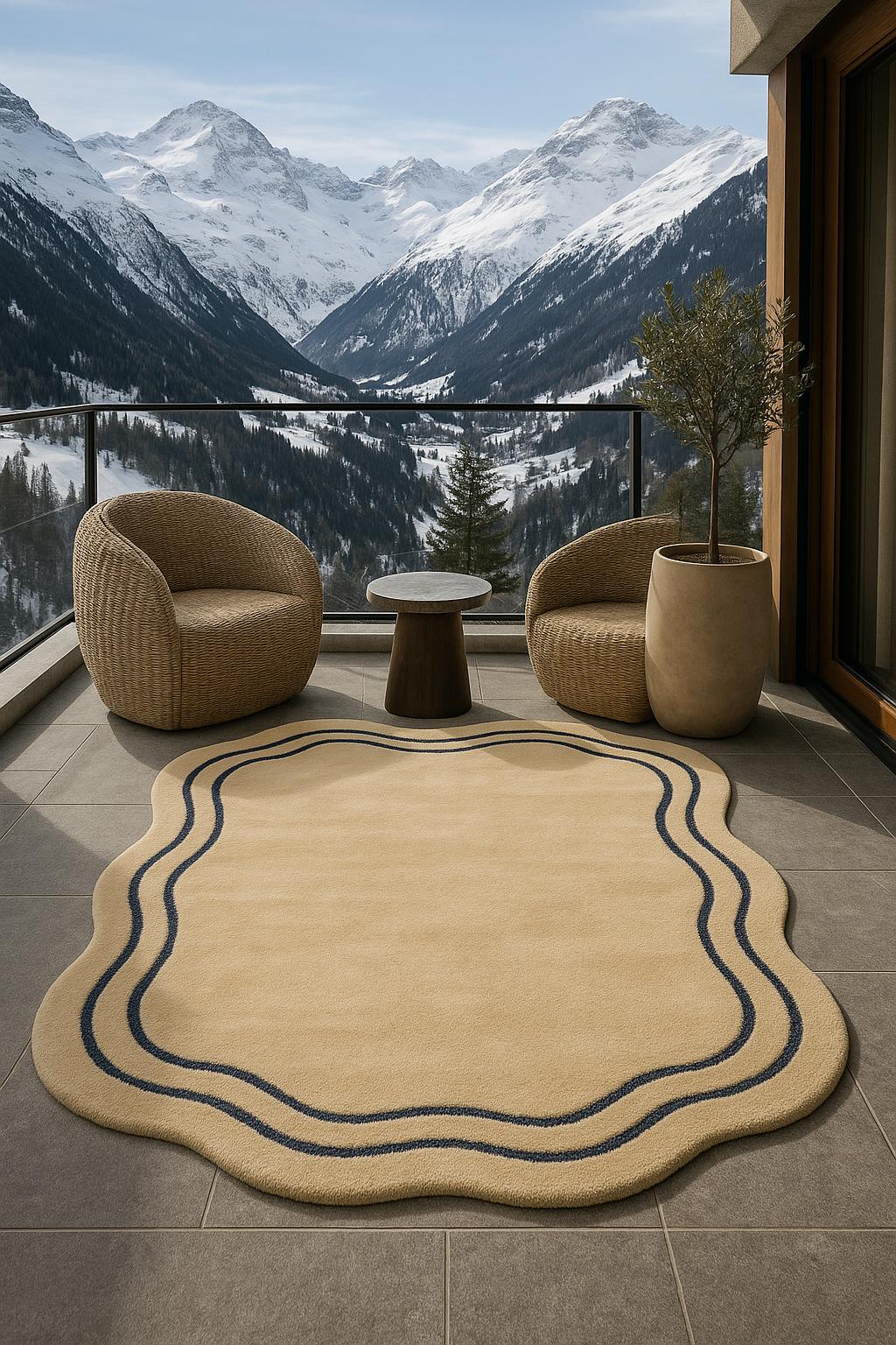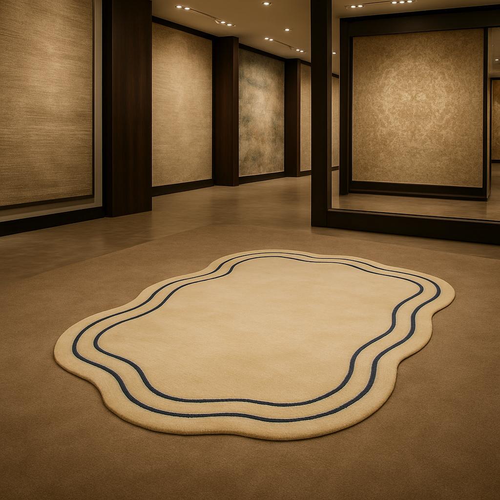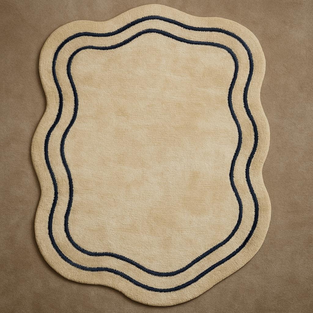 Bring calm luxury and modern elegance into your space with this beautifully crafted hand tufted irregular rug. Featuring a soft beige base accented with subtle navy blue wavy lines, this rug adds a refined yet artistic touch to bedrooms, living rooms, and contemporary interiors.