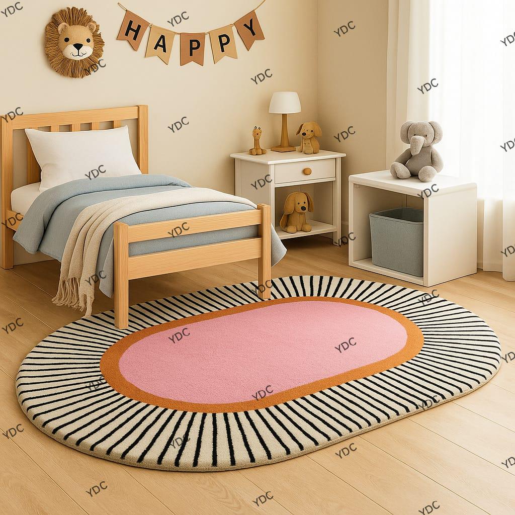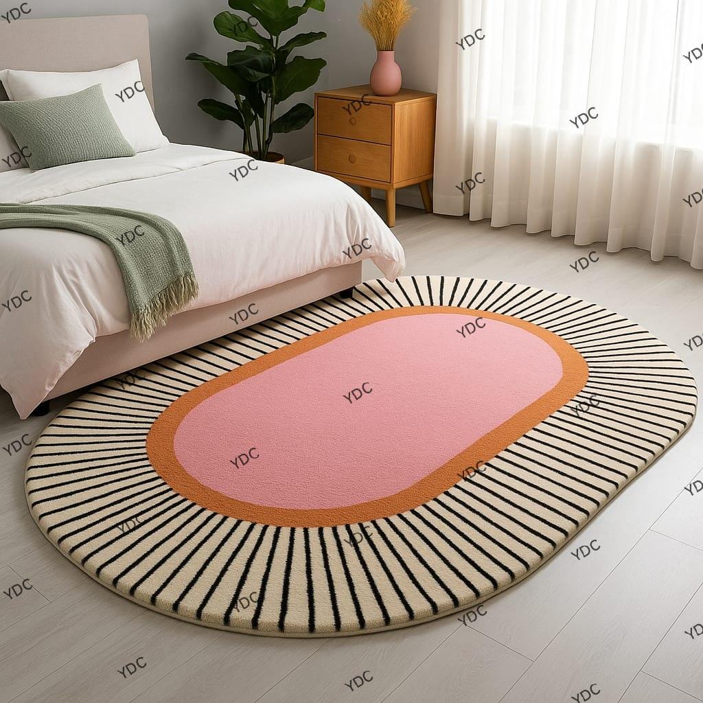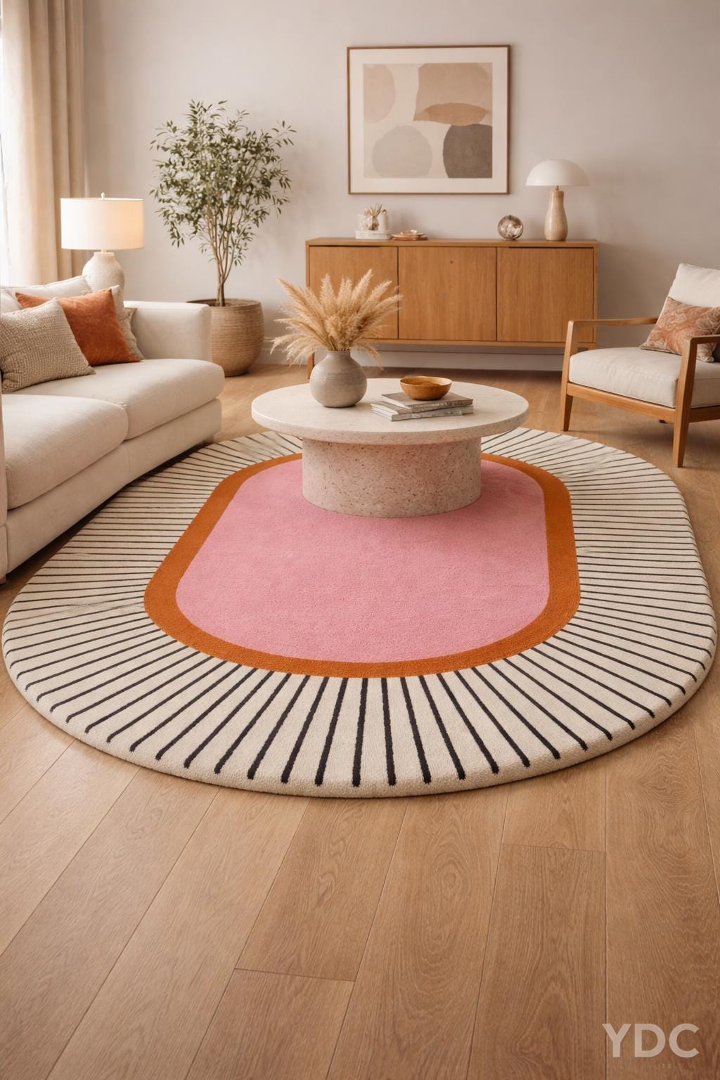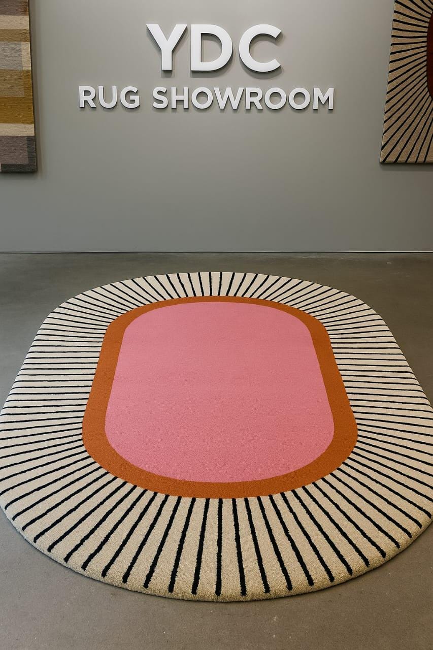 Elevate your interiors with this hand tufted modern oval rug, thoughtfully designed for both domestic and global homes. The soft pink center, warm rust border, and ivory base with fine black linear detailing create a balanced, modern aesthetic that complements bedrooms, living rooms, and stylish sitting areas.