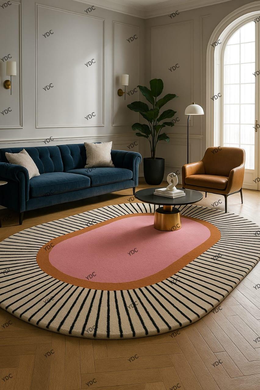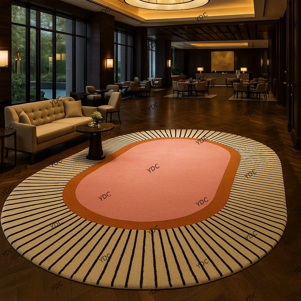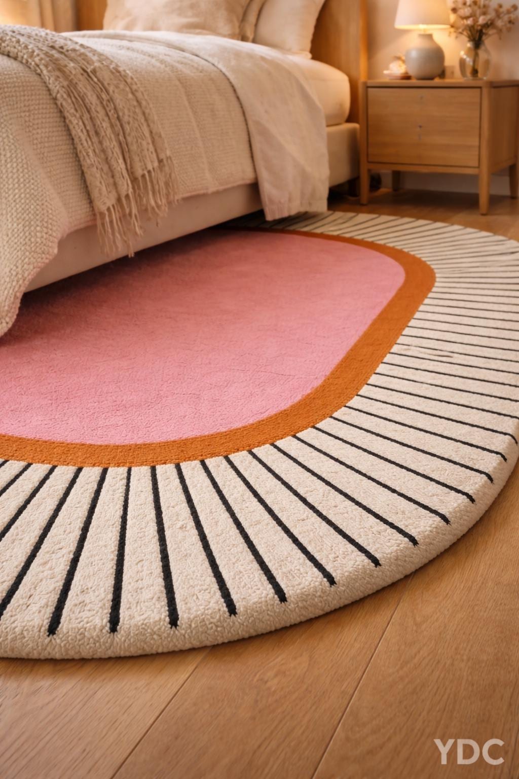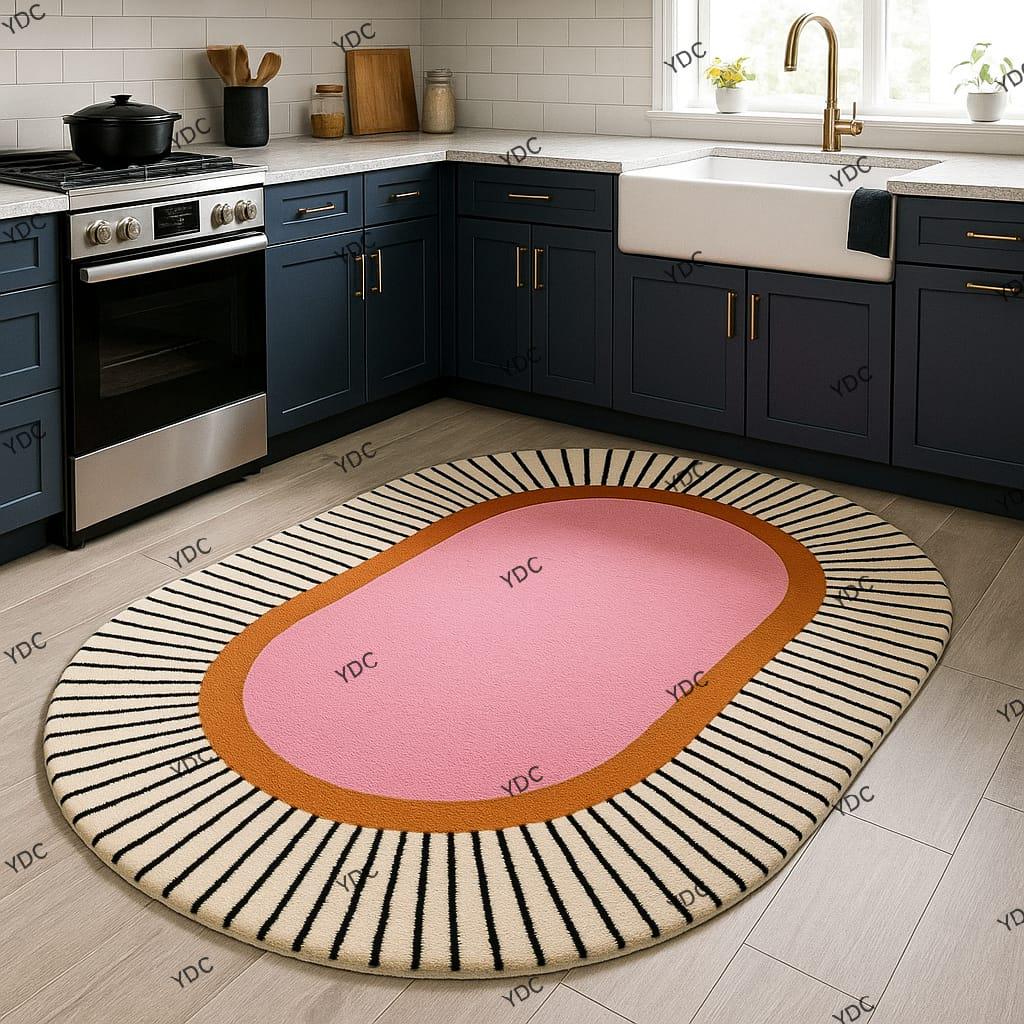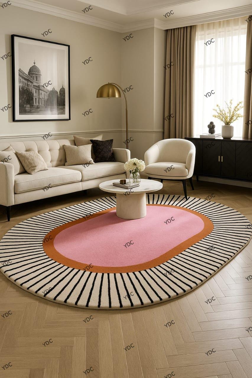 Elevate your interiors with this hand tufted modern oval rug, thoughtfully designed for both domestic and global homes. The soft pink center, warm rust border, and ivory base with fine black linear detailing create a balanced, modern aesthetic that complements bedrooms, living rooms, and stylish sitting areas.