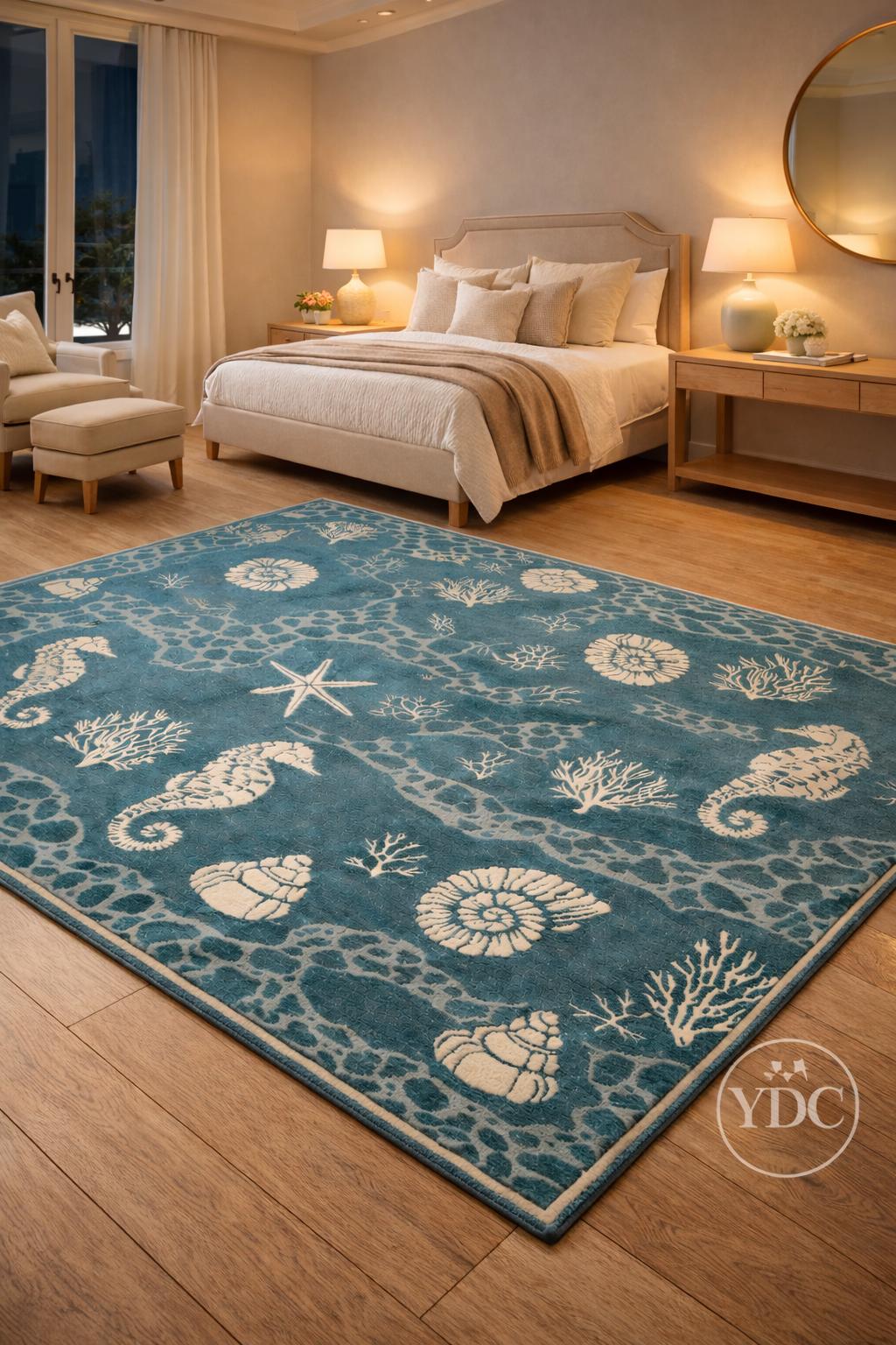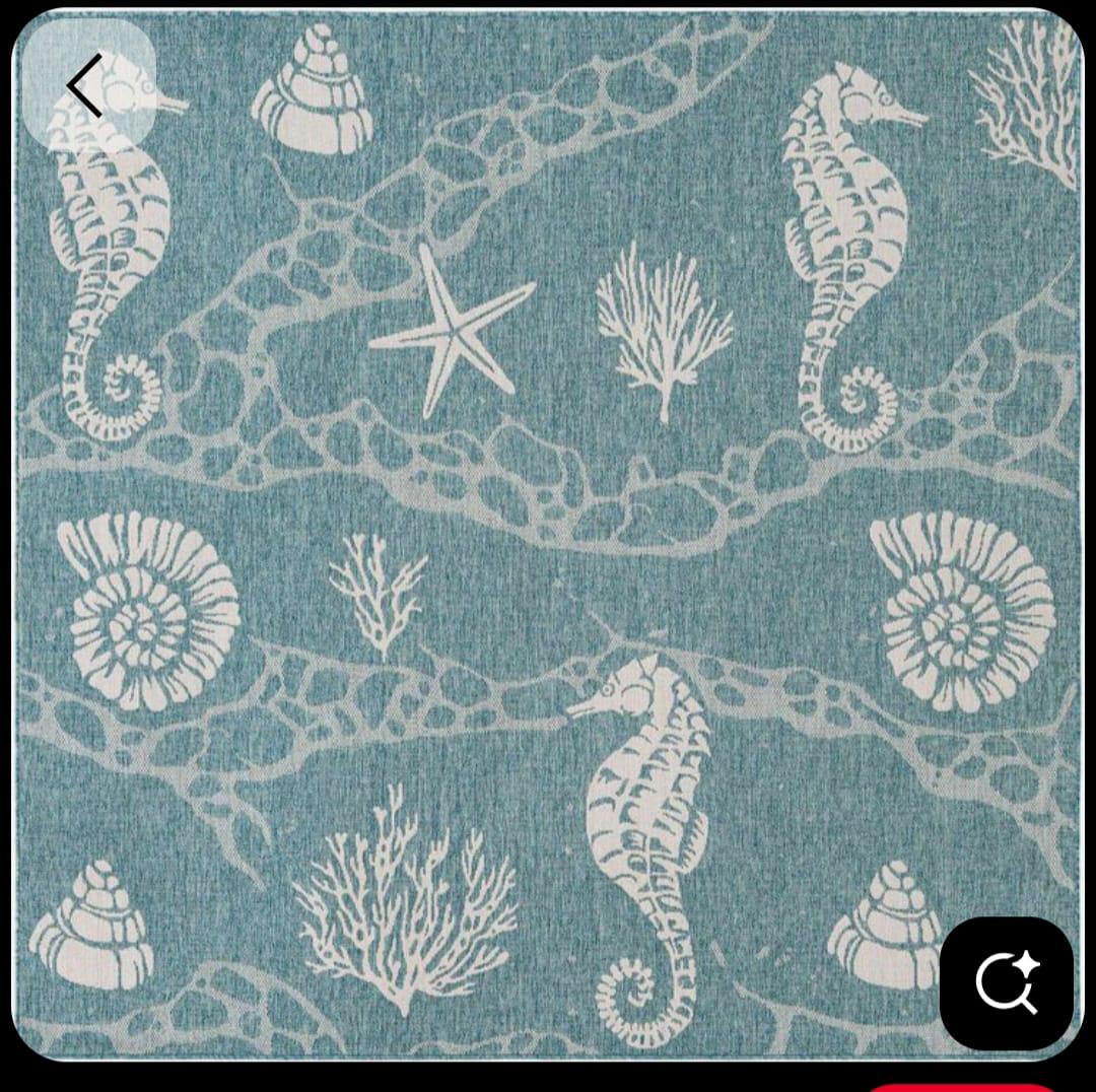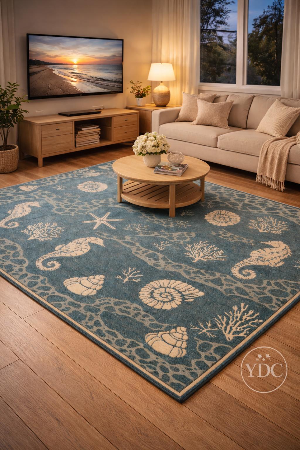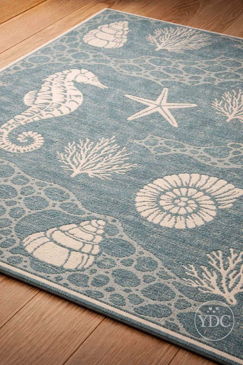Bring a fresh coastal vibe into your home with this hand tufted coastal blue area rug, inspired by ocean elements like seashells, corals, starfish, and marine textures. The soothing blue base paired with soft ivory motifs creates a calm, beach-inspired look that brightens living rooms, bedrooms, beach houses, and modern homes.