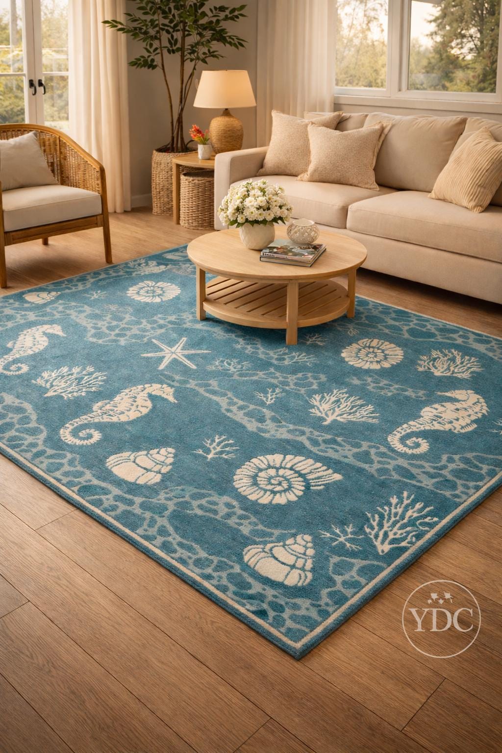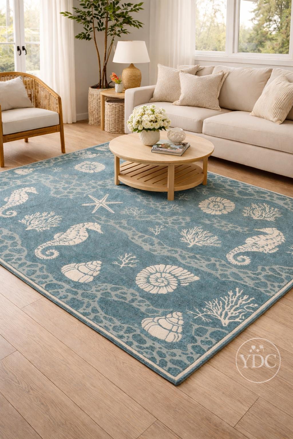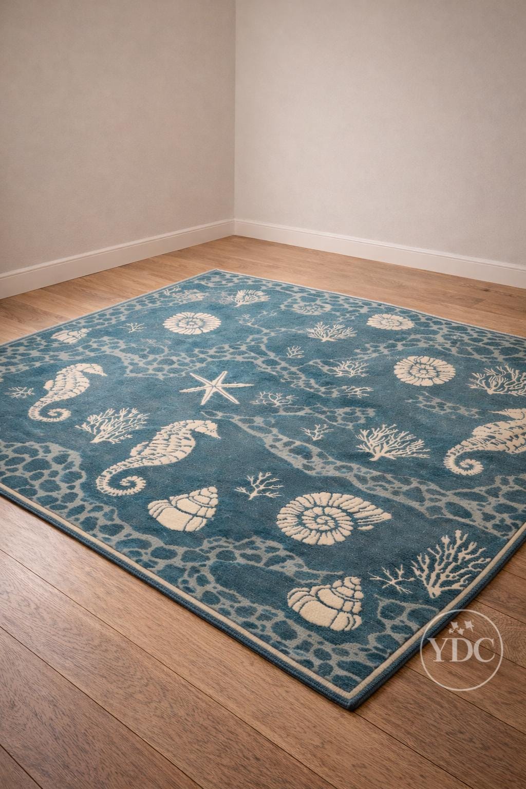 Bring a fresh coastal vibe into your home with this hand tufted coastal blue area rug, inspired by ocean elements like seashells, corals, starfish, and marine textures. The soothing blue base paired with soft ivory motifs creates a calm, beach-inspired look that brightens living rooms, bedrooms, beach houses, and modern homes.