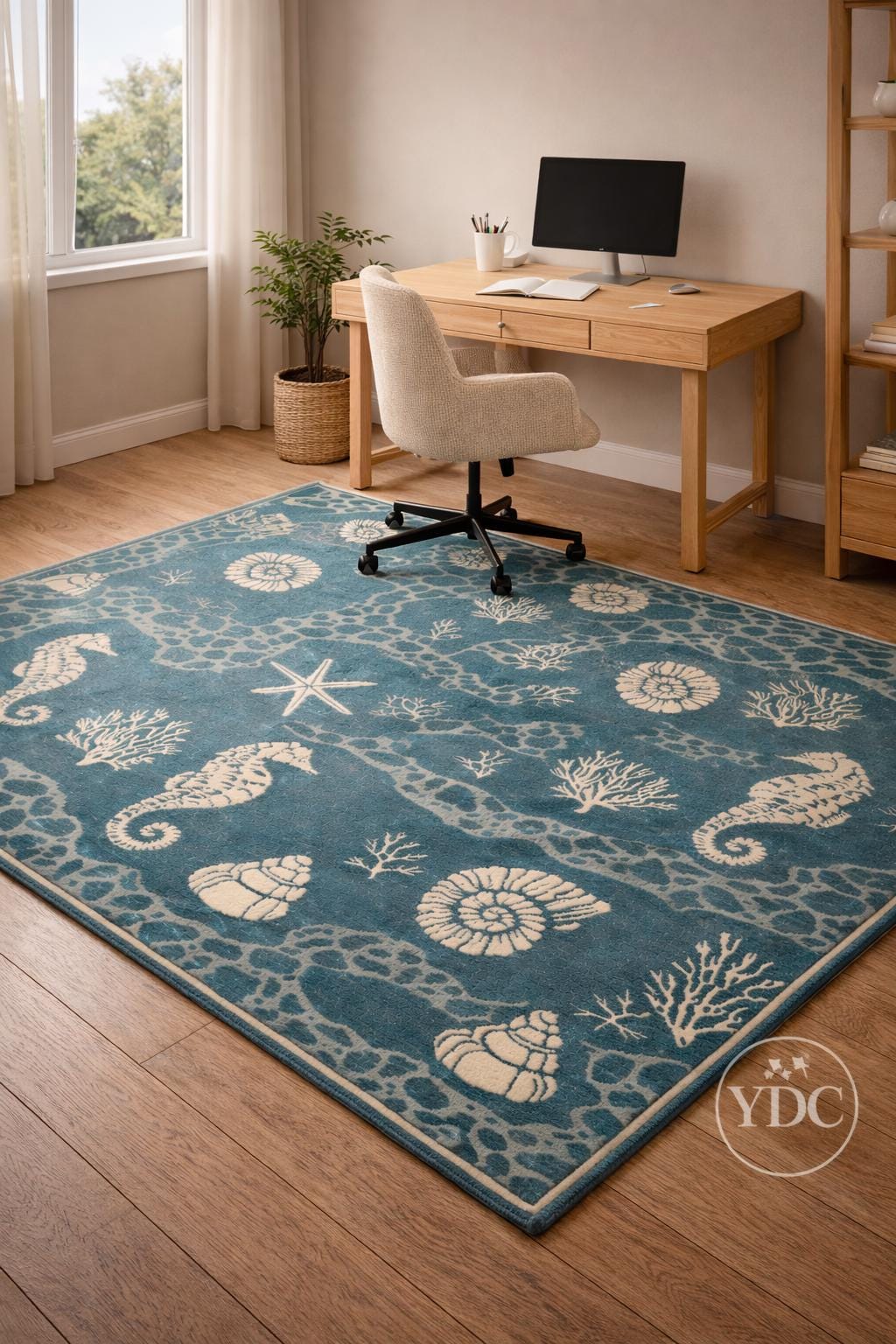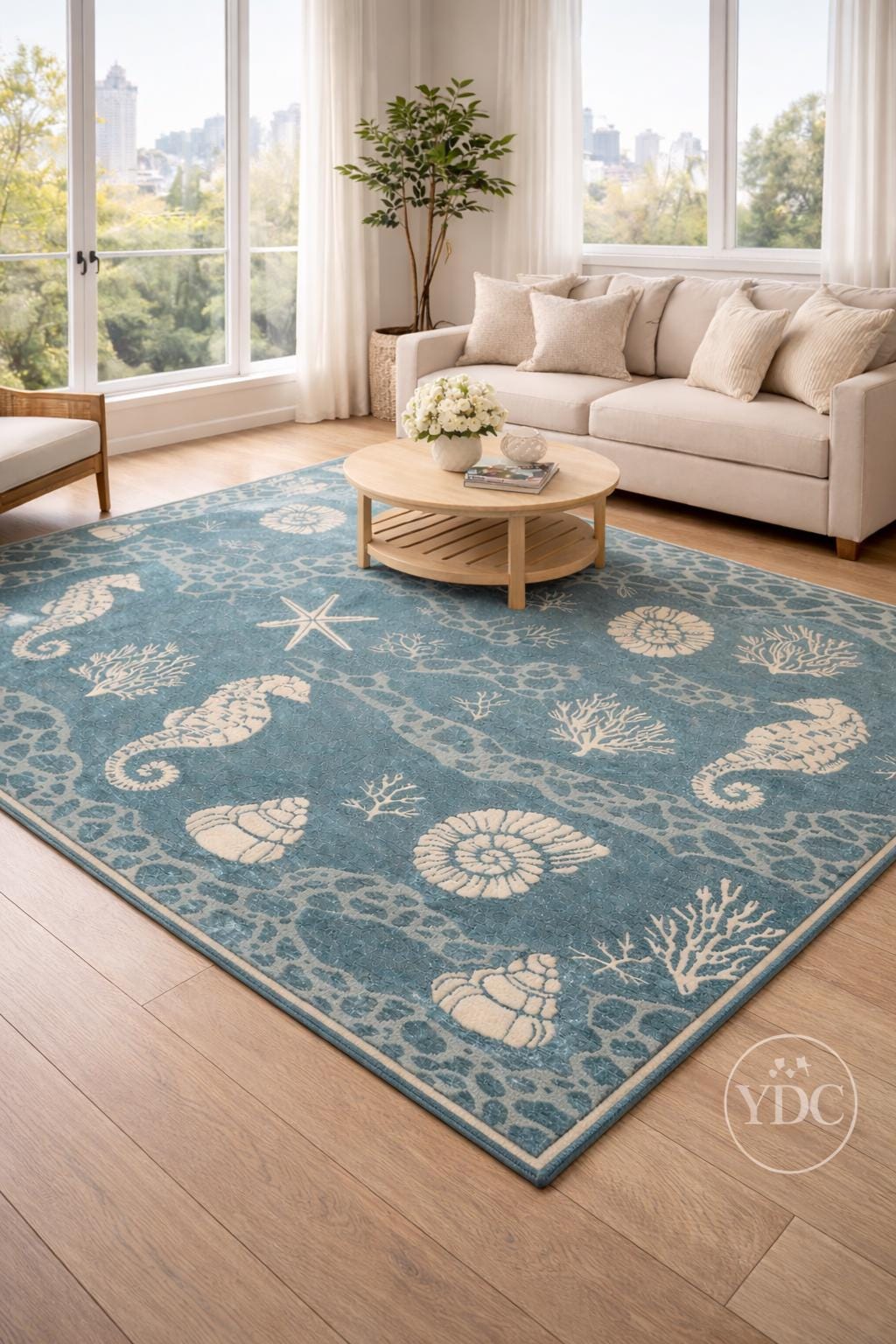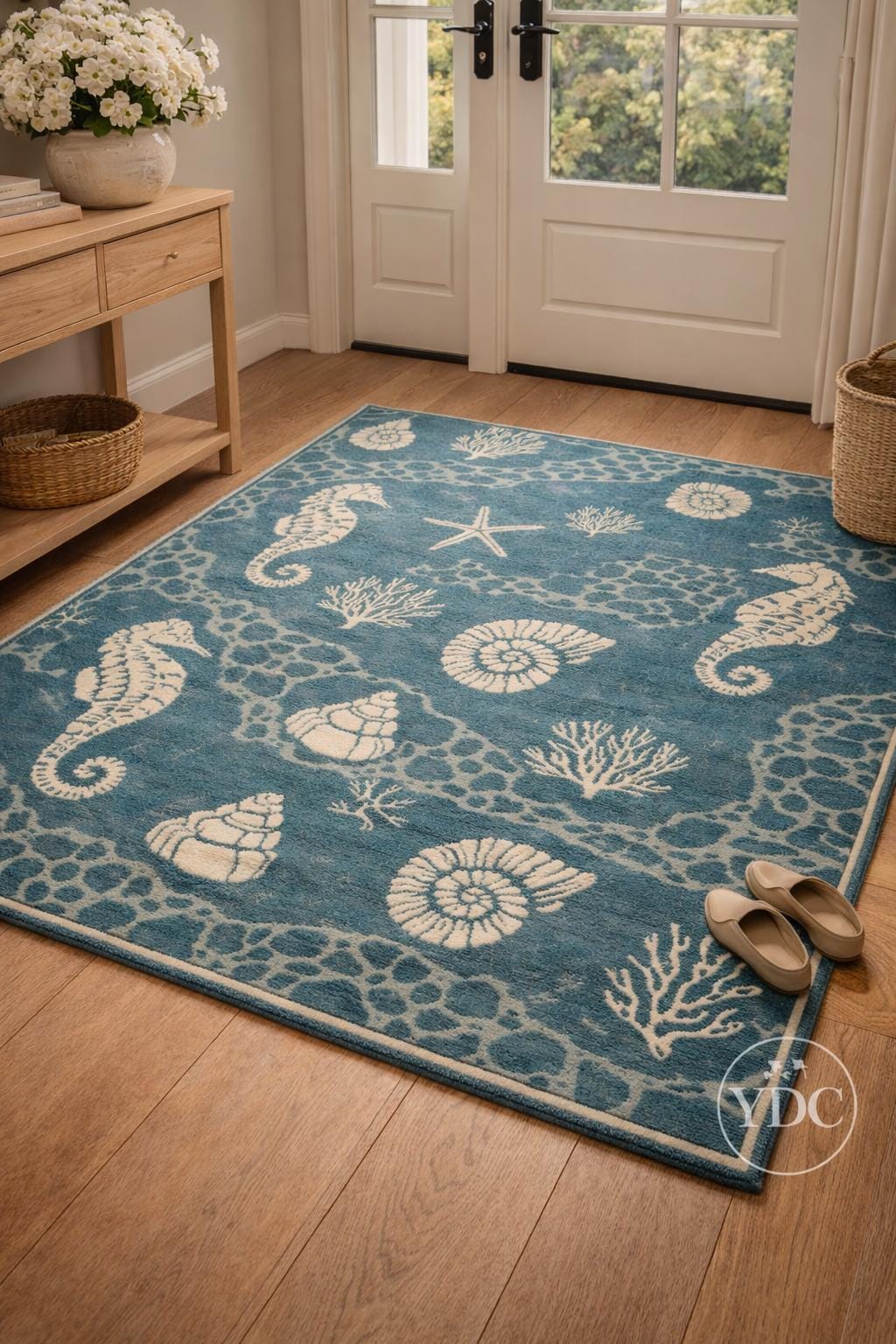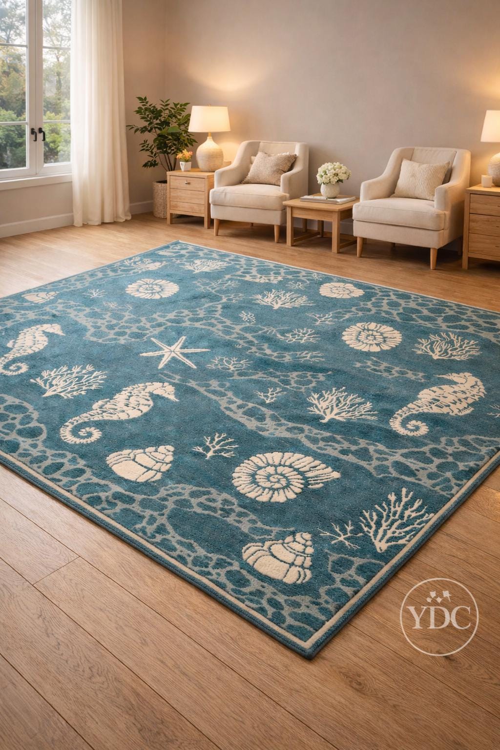 Bring a fresh coastal vibe into your home with this hand tufted coastal blue area rug, inspired by ocean elements like seashells, corals, starfish, and marine textures. The soothing blue base paired with soft ivory motifs creates a calm, beach-inspired look that brightens living rooms, bedrooms, beach houses, and modern homes.
