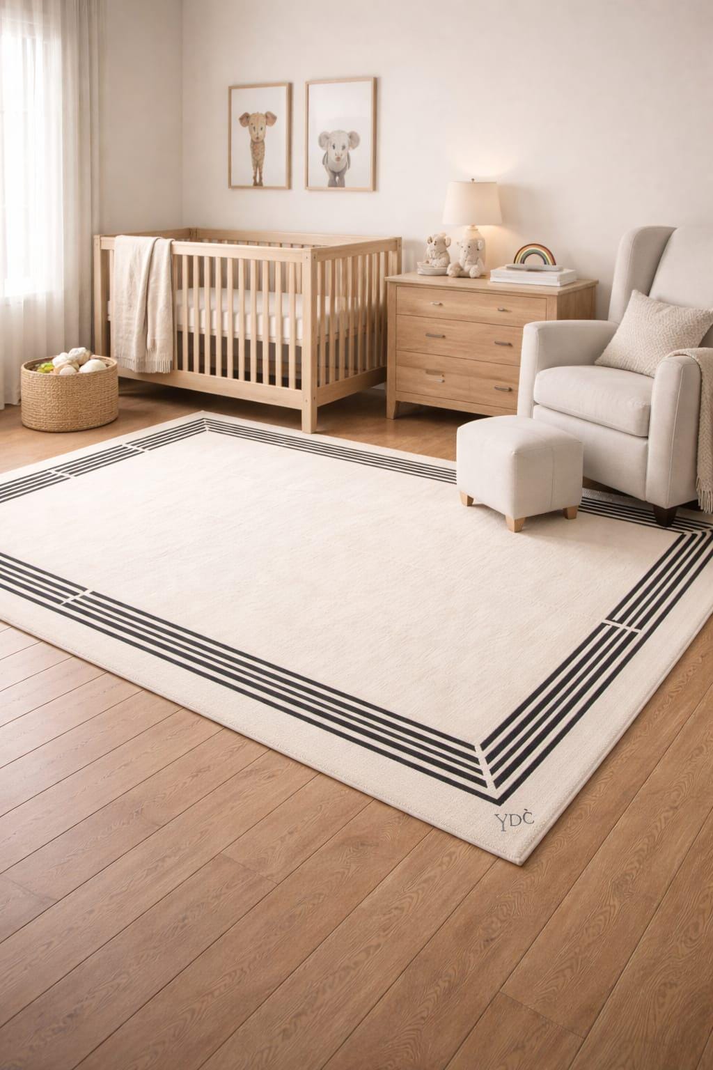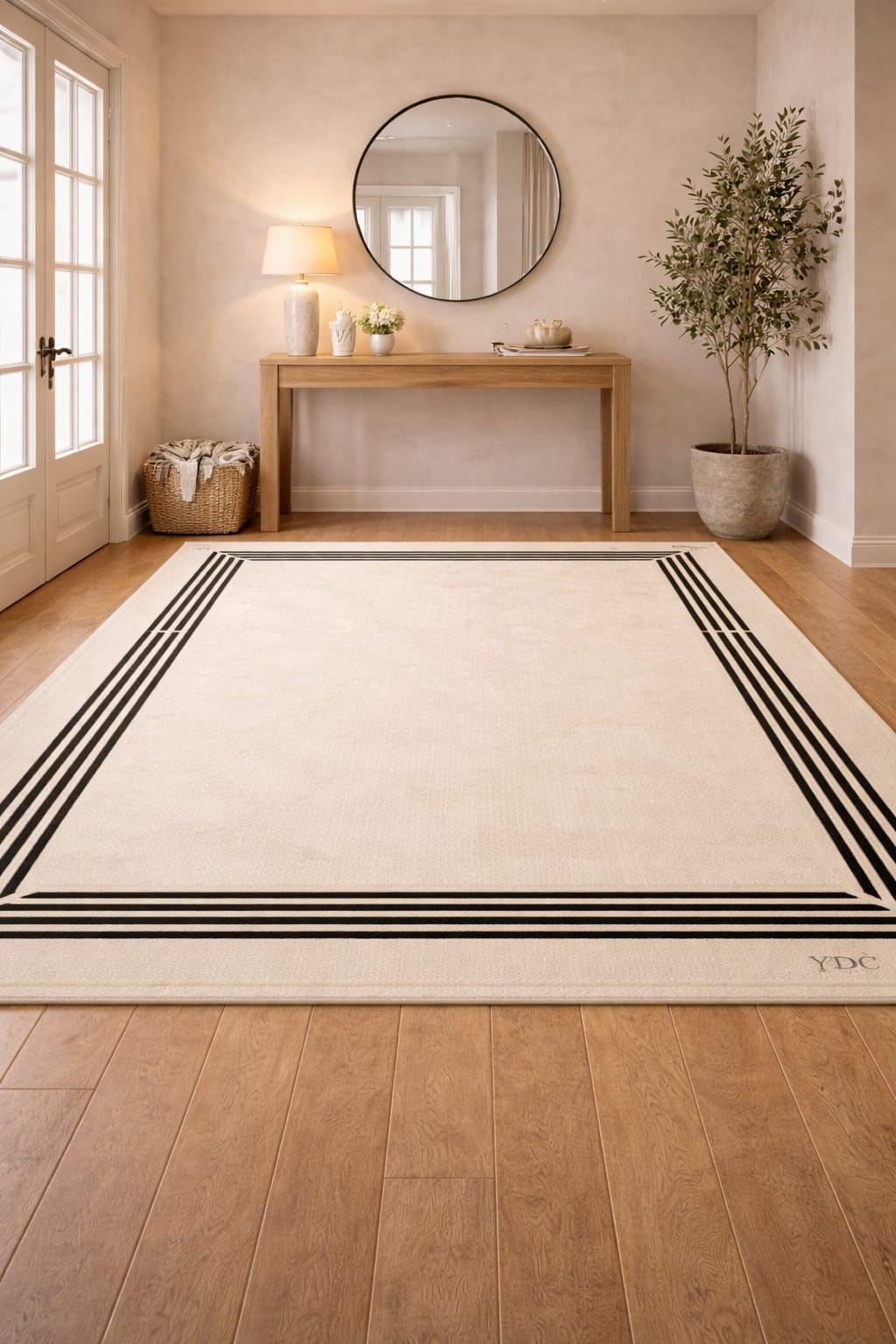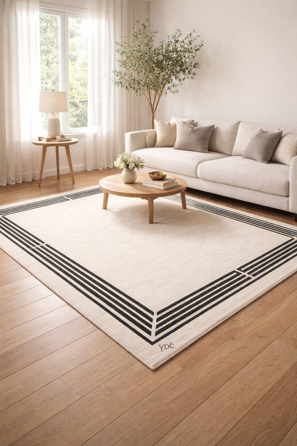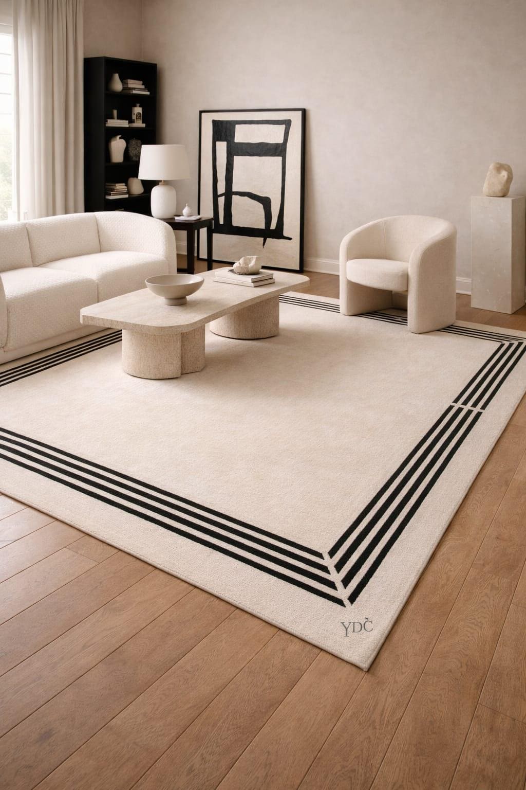 Elevate your space with this hand tufted modern border area rug, featuring a clean ivory ground framed with sharp black linear borders. Its balanced, minimalist design creates a refined look that works beautifully in entryways, living rooms, bedrooms, and modern interiors where simplicity and elegance matter.