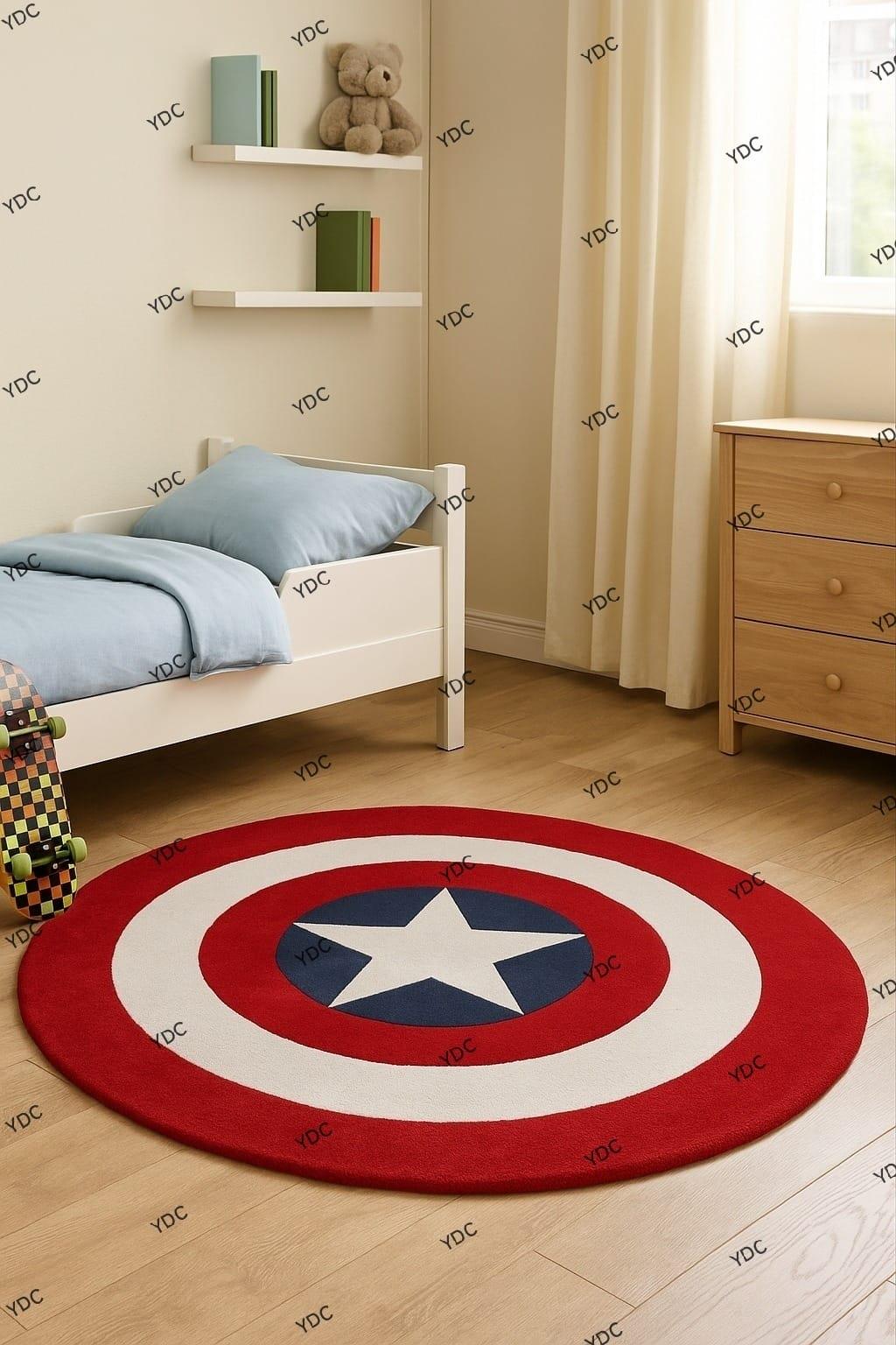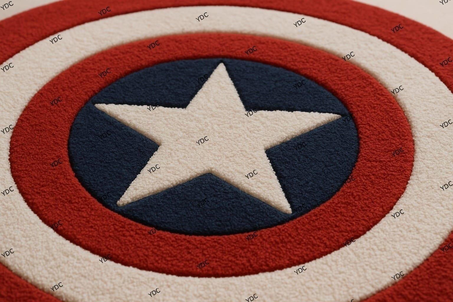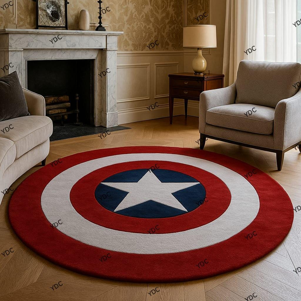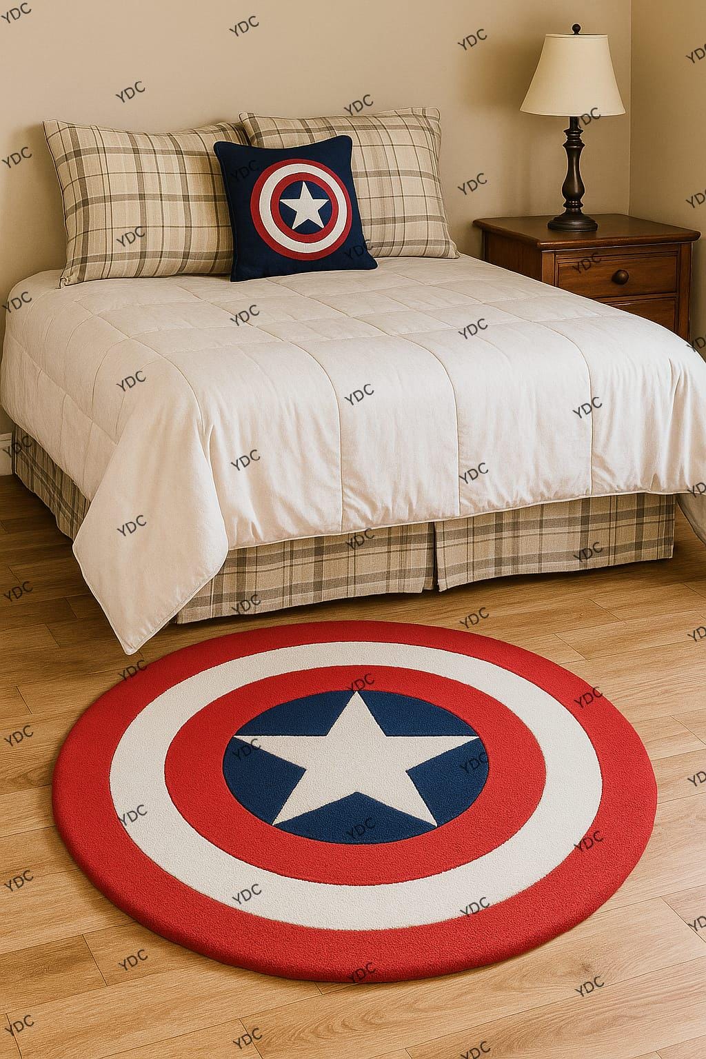 Turn your child’s room into a bold and playful space with this hand tufted superhero star shield round rug, inspired by a classic red, white, and blue emblem design. The clean circular layout with a strong central white star creates an eye-catching focal point that instantly energizes any kids’ bedroom, nursery, or playroom.