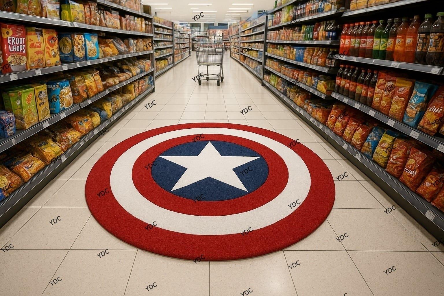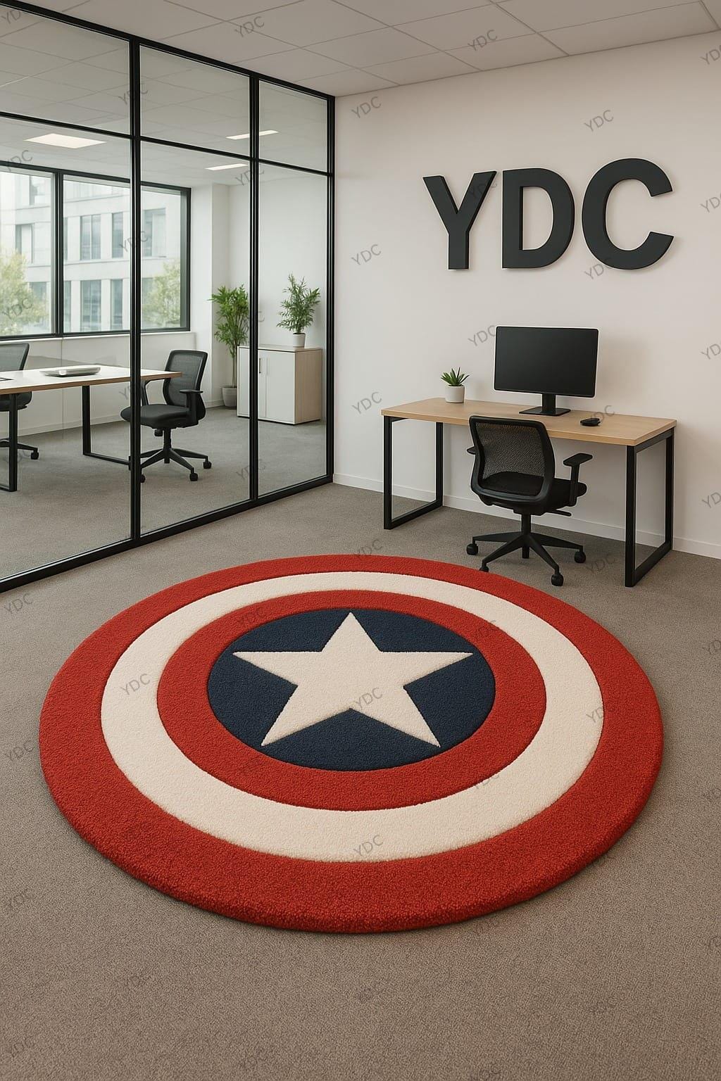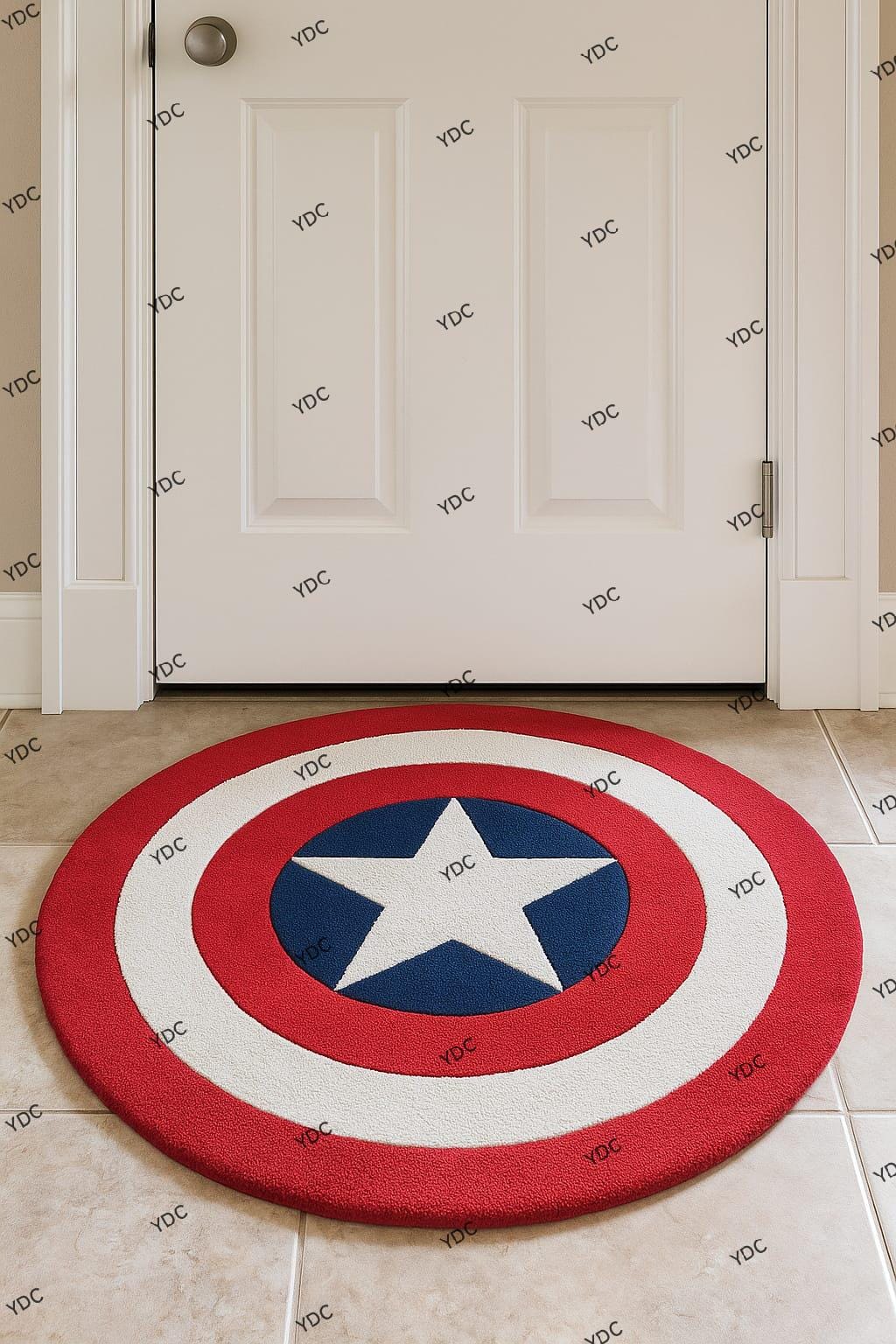 Turn your child’s room into a bold and playful space with this hand tufted superhero star shield round rug, inspired by a classic red, white, and blue emblem design. The clean circular layout with a strong central white star creates an eye-catching focal point that instantly energizes any kids’ bedroom, nursery, or playroom.