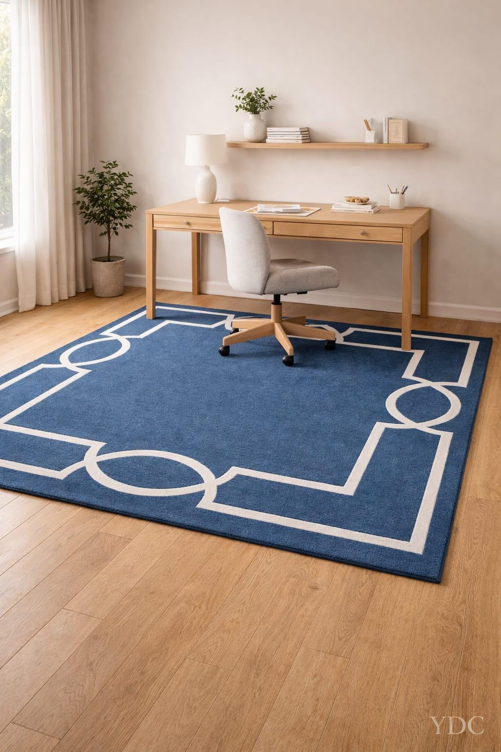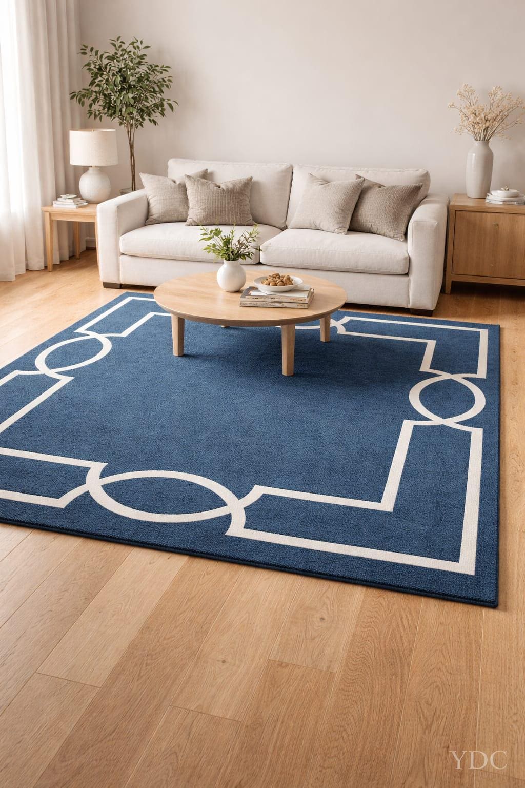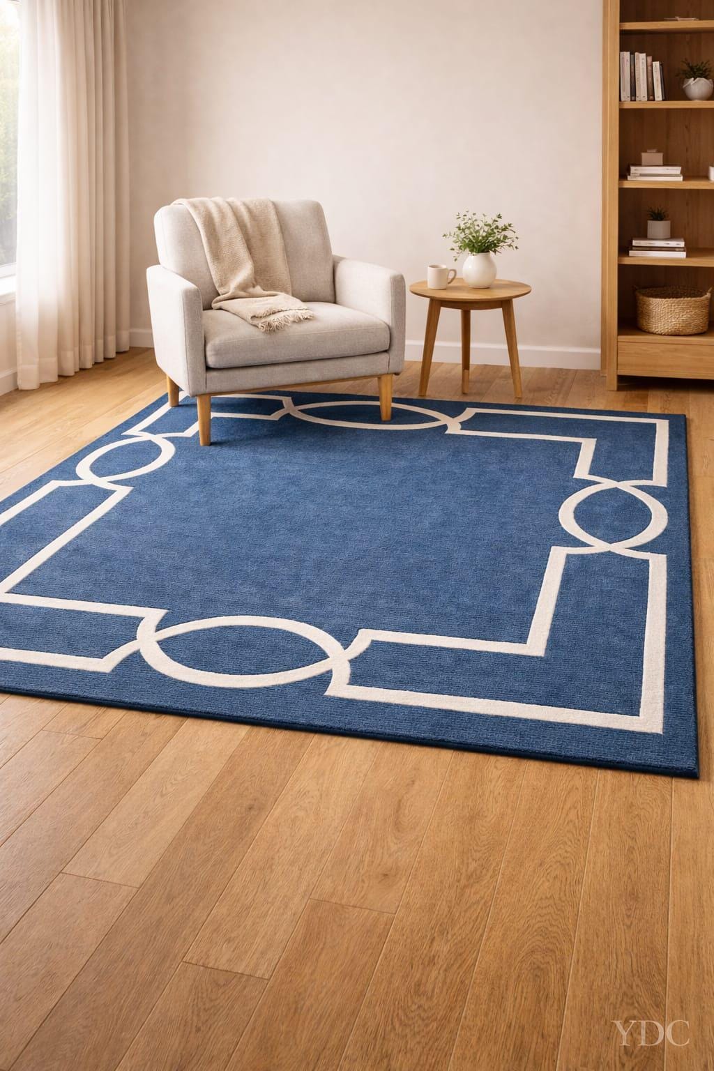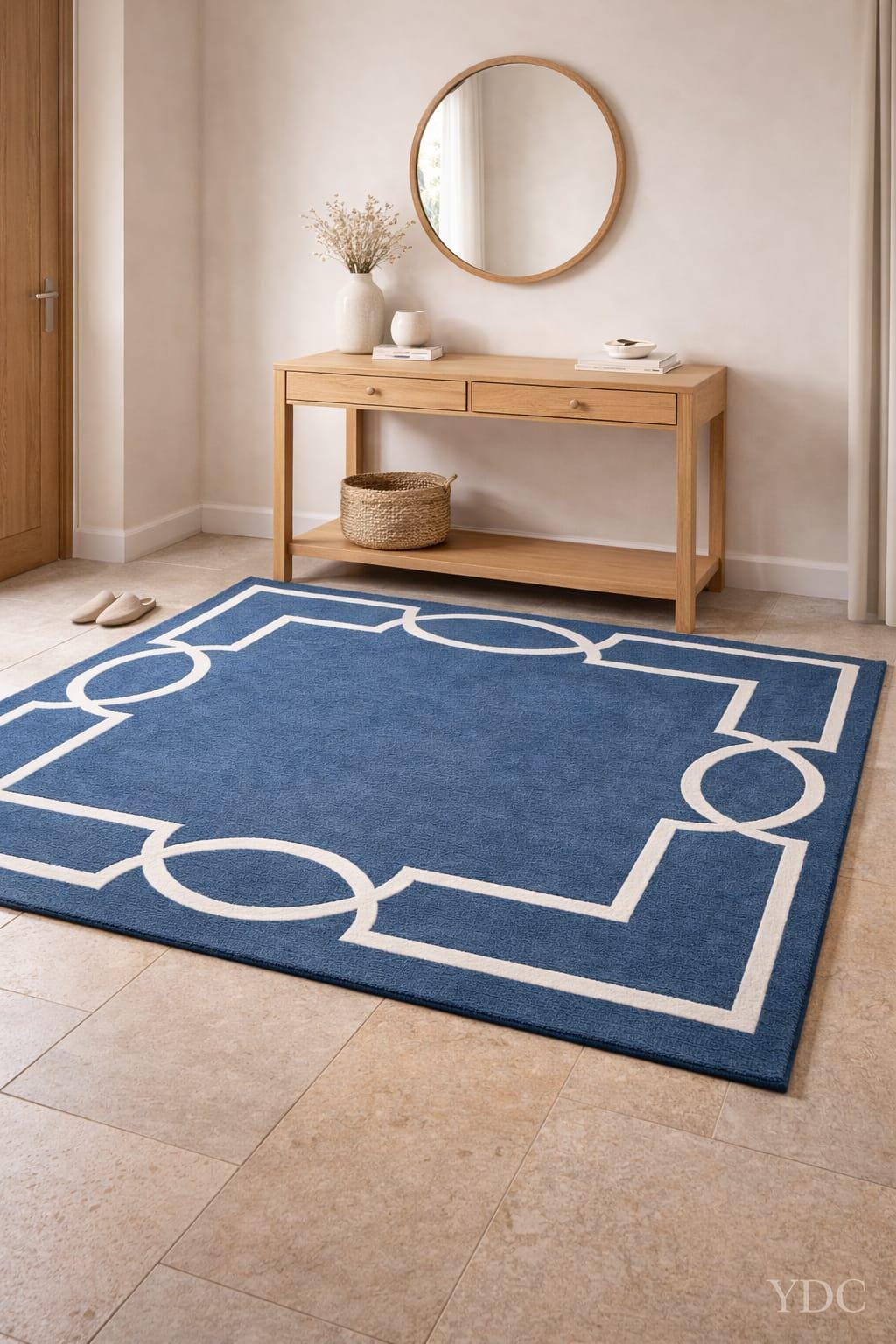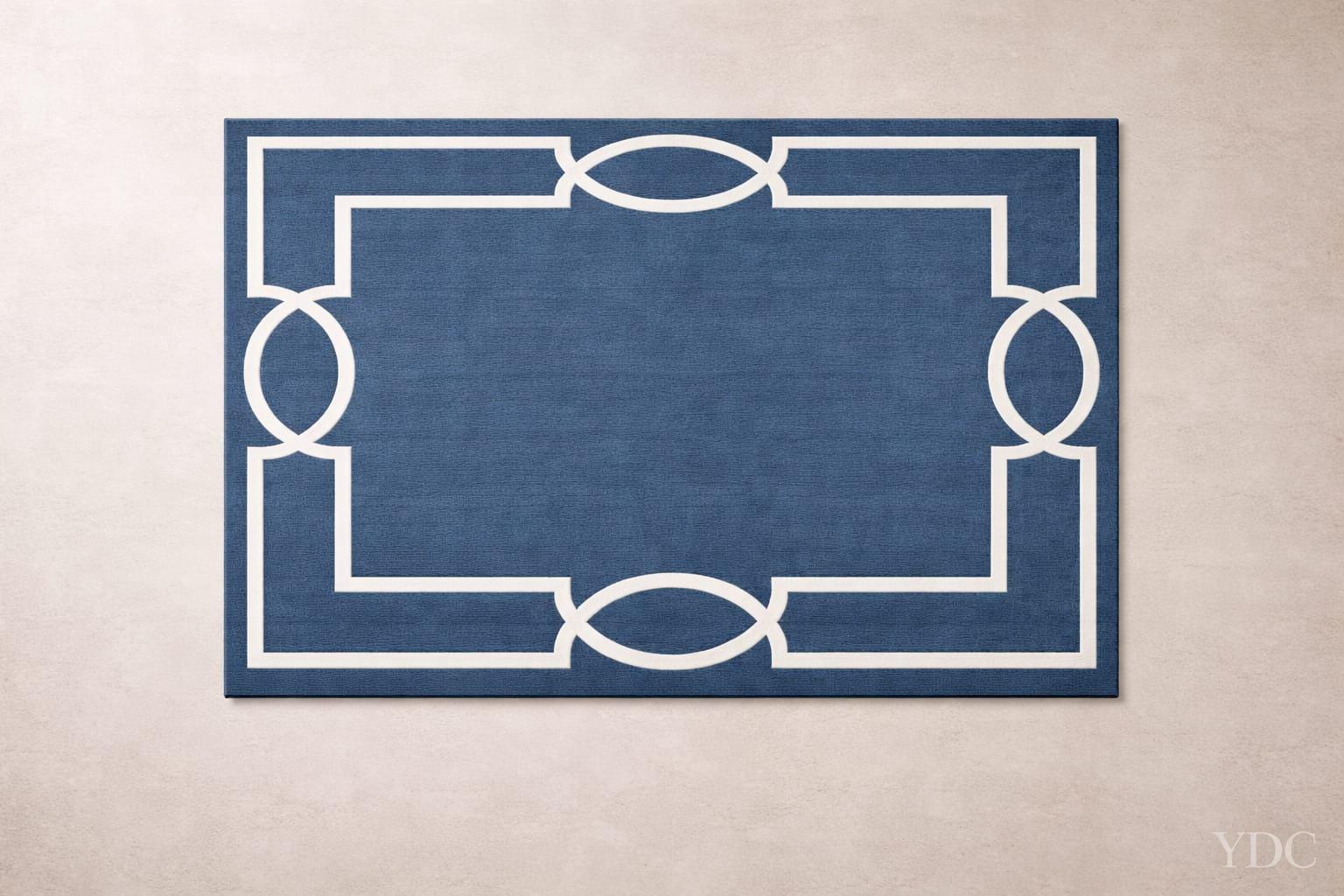 Add a refined architectural touch to your interior with this elegant blue geometric border rug. The rich blue base is framed with a clean white ornamental border featuring circular and linear detailing, creating a timeless design that blends modern simplicity with classic symmetry.