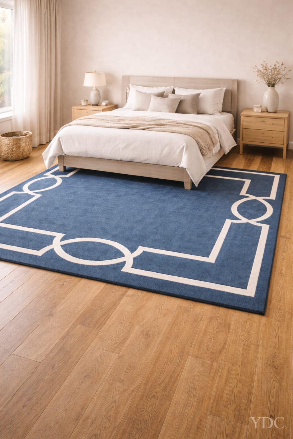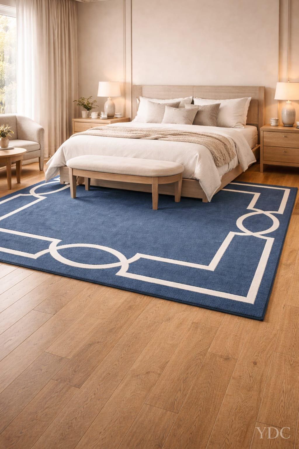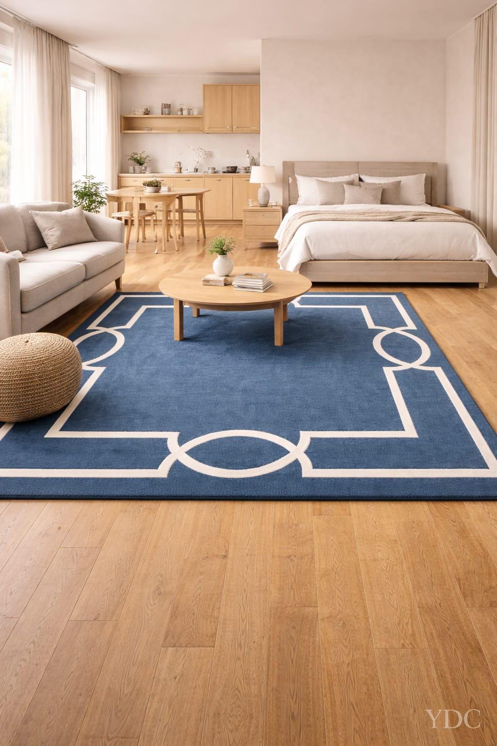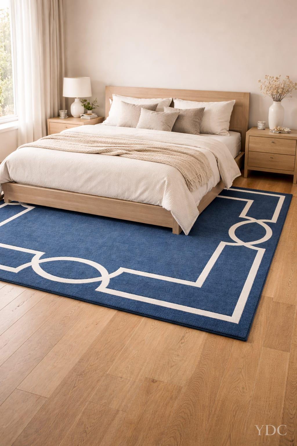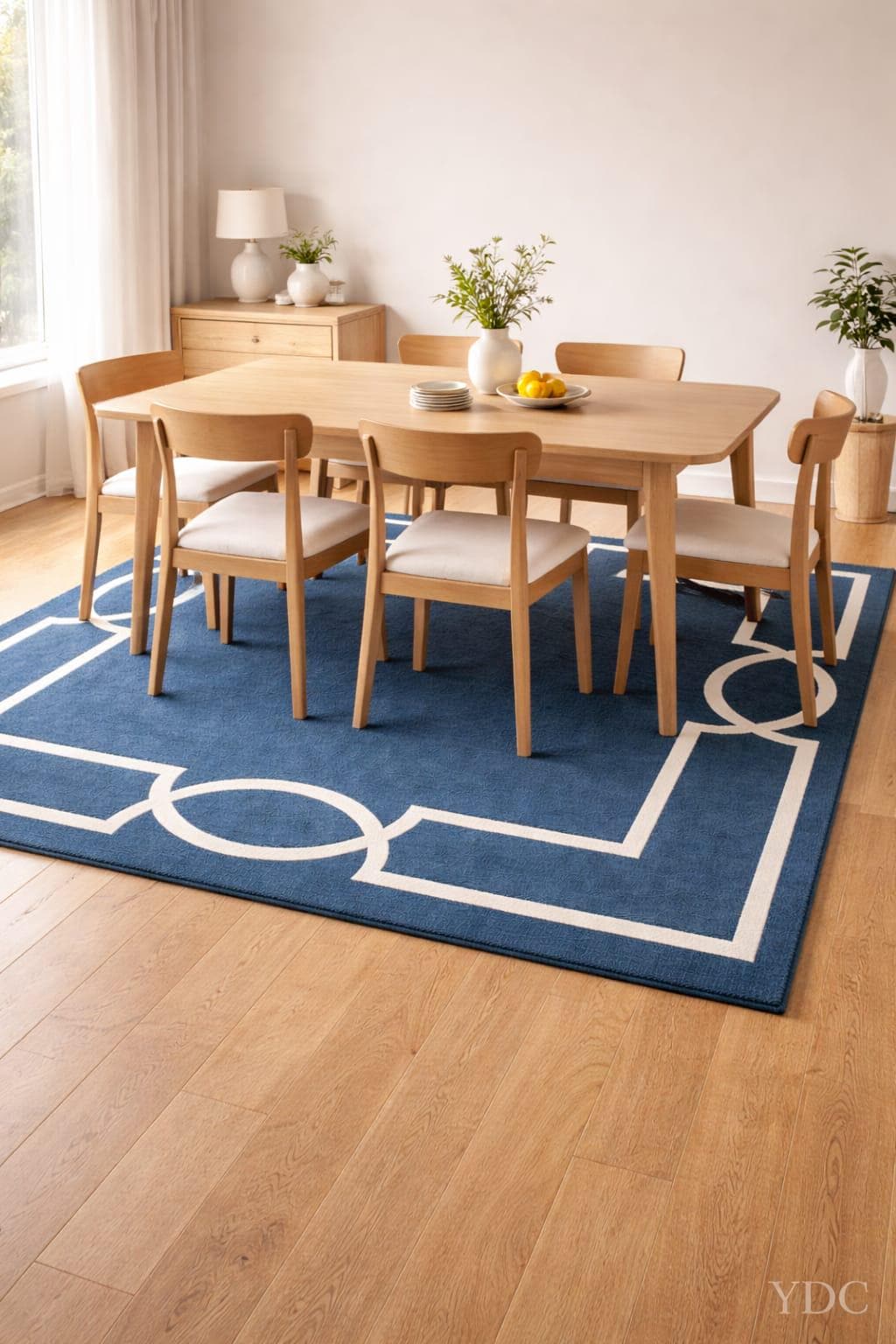 Add a refined architectural touch to your interior with this elegant blue geometric border rug. The rich blue base is framed with a clean white ornamental border featuring circular and linear detailing, creating a timeless design that blends modern simplicity with classic symmetry.