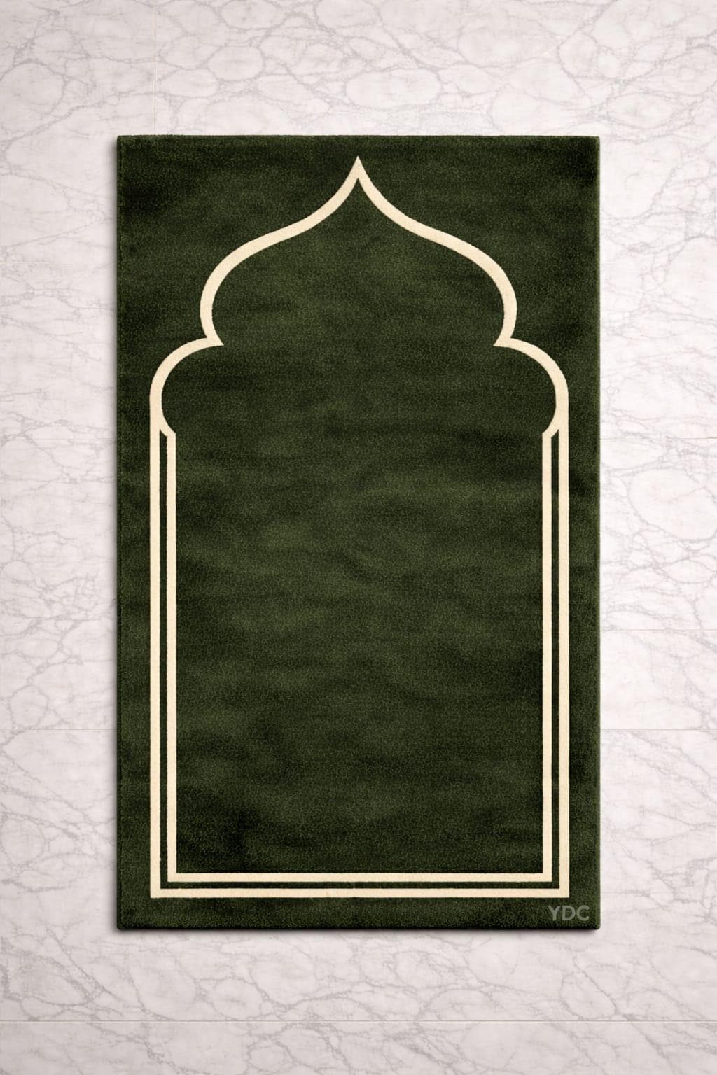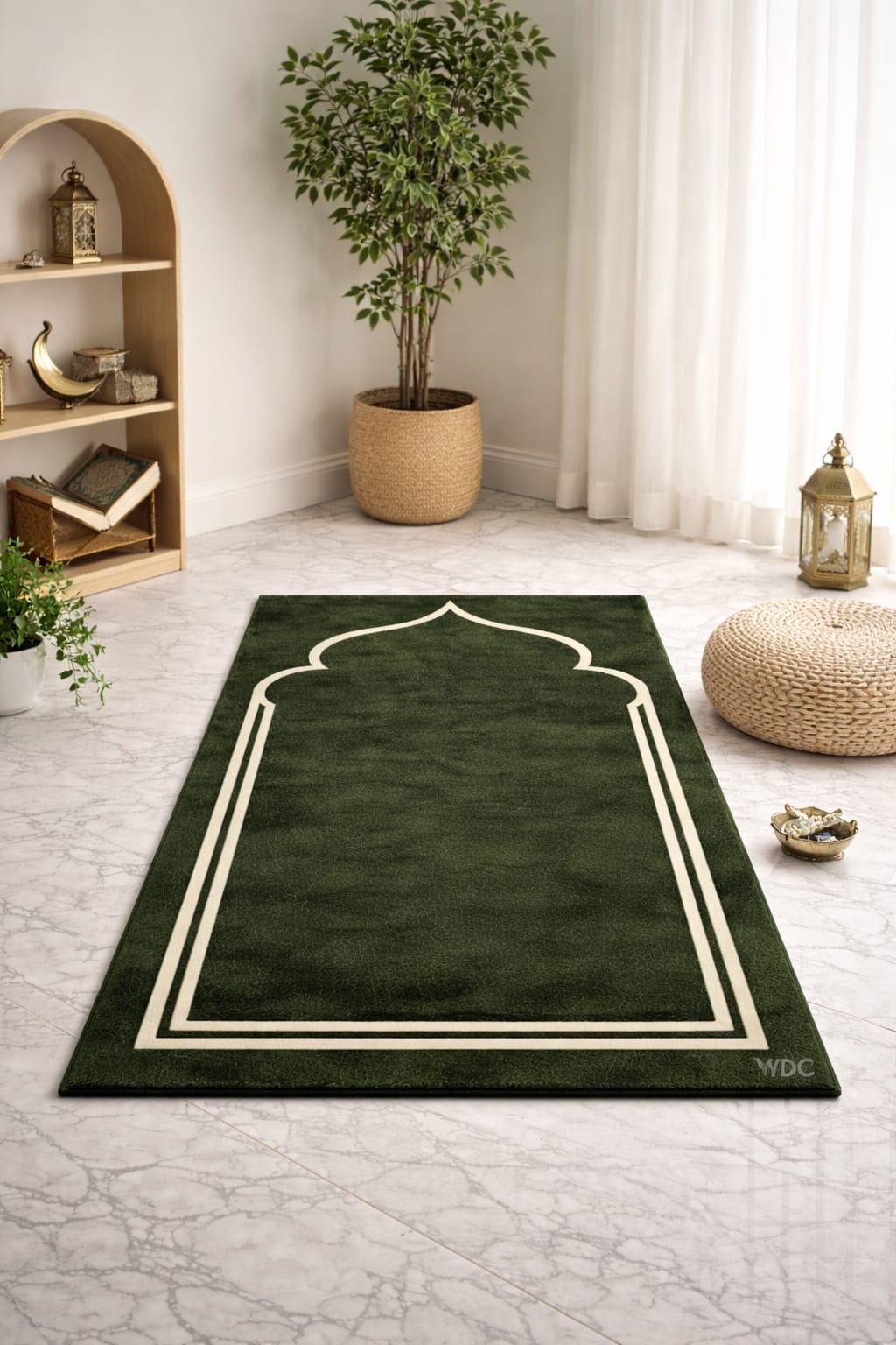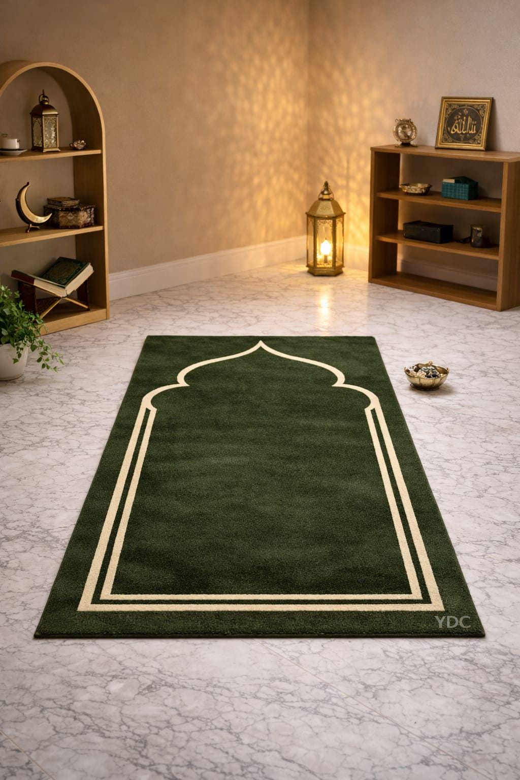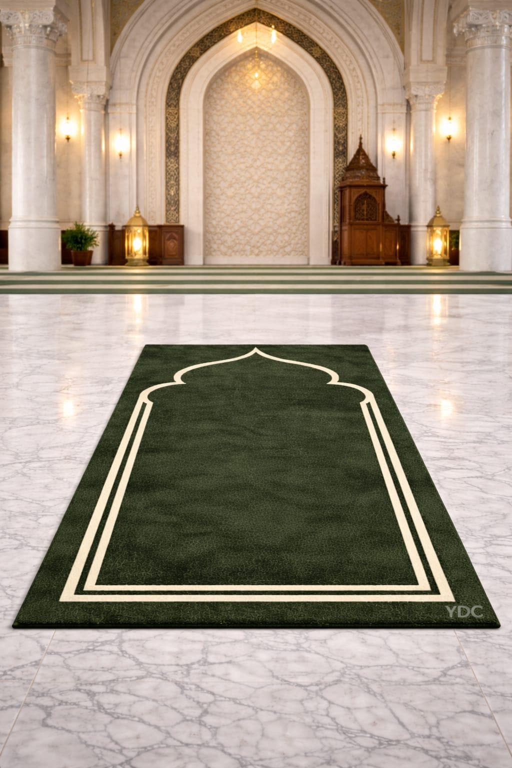 Create a peaceful and elegant prayer space with this beautifully crafted Islamic prayer rug featuring a classic mosque arch design. The deep green background paired with the clean cream arch outline reflects traditional Islamic aesthetics while maintaining a modern minimalist appearance.