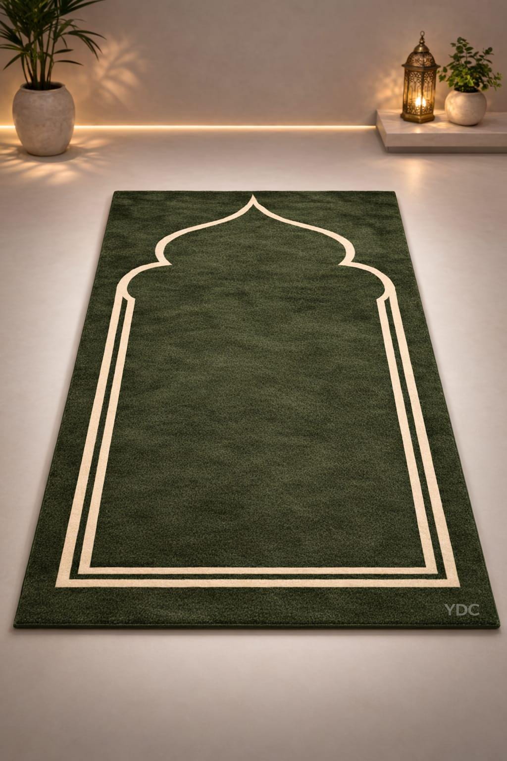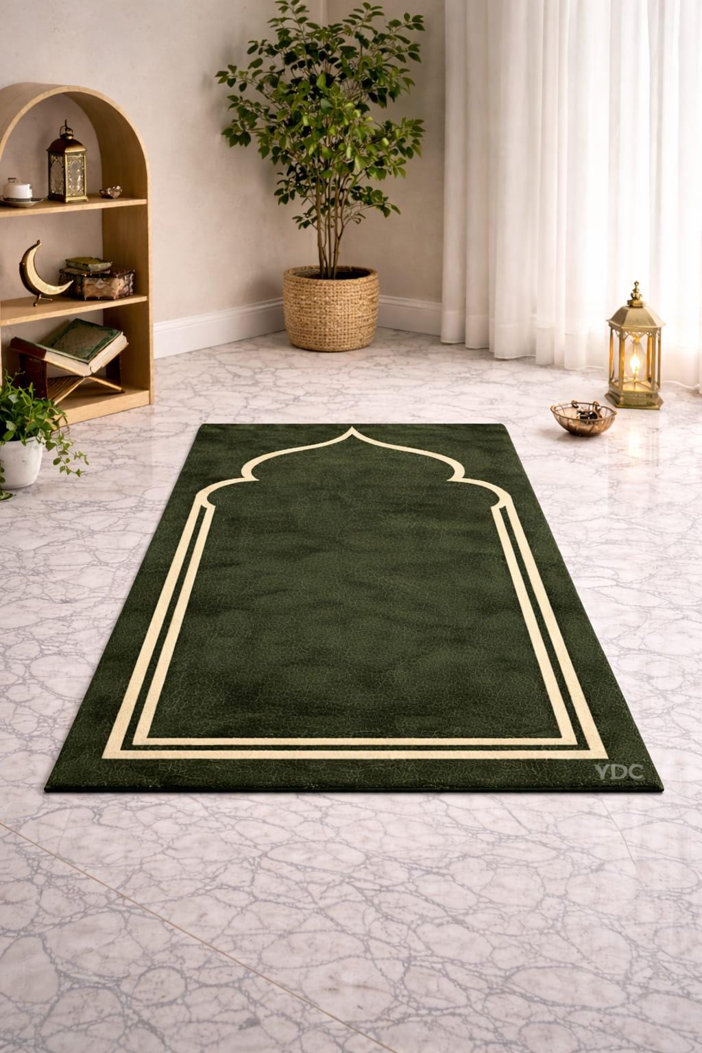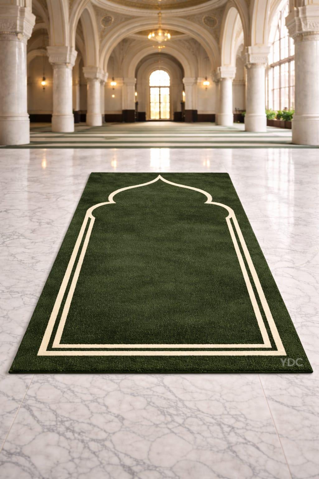 Create a peaceful and elegant prayer space with this beautifully crafted Islamic prayer rug featuring a classic mosque arch design. The deep green background paired with the clean cream arch outline reflects traditional Islamic aesthetics while maintaining a modern minimalist appearance.