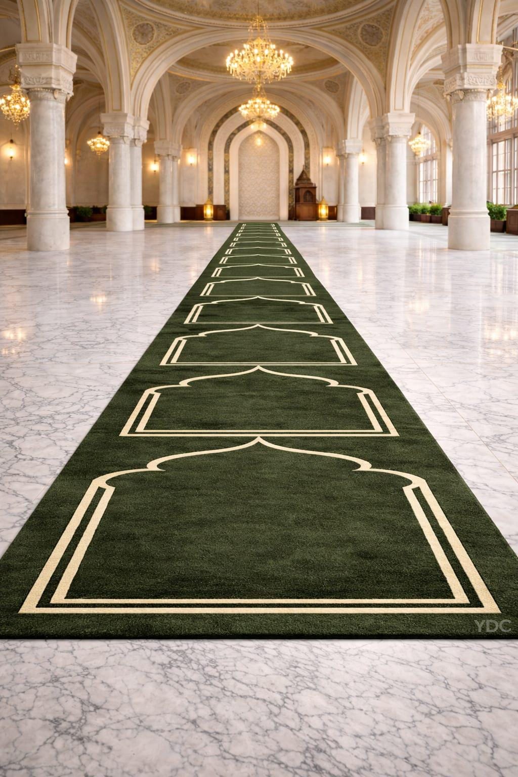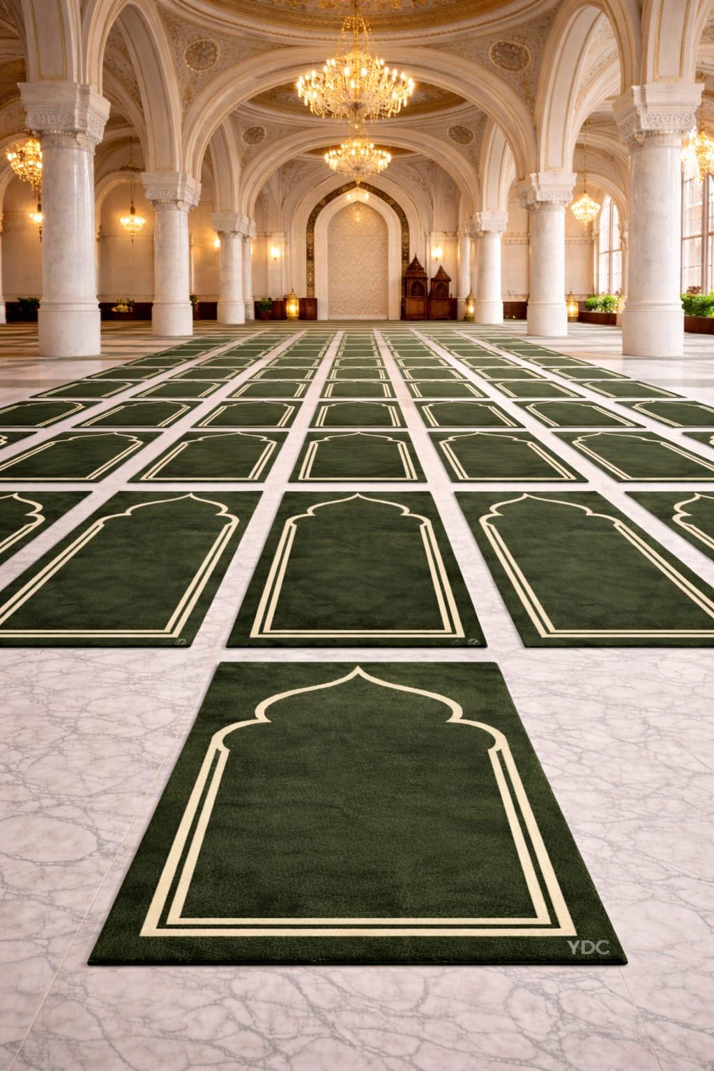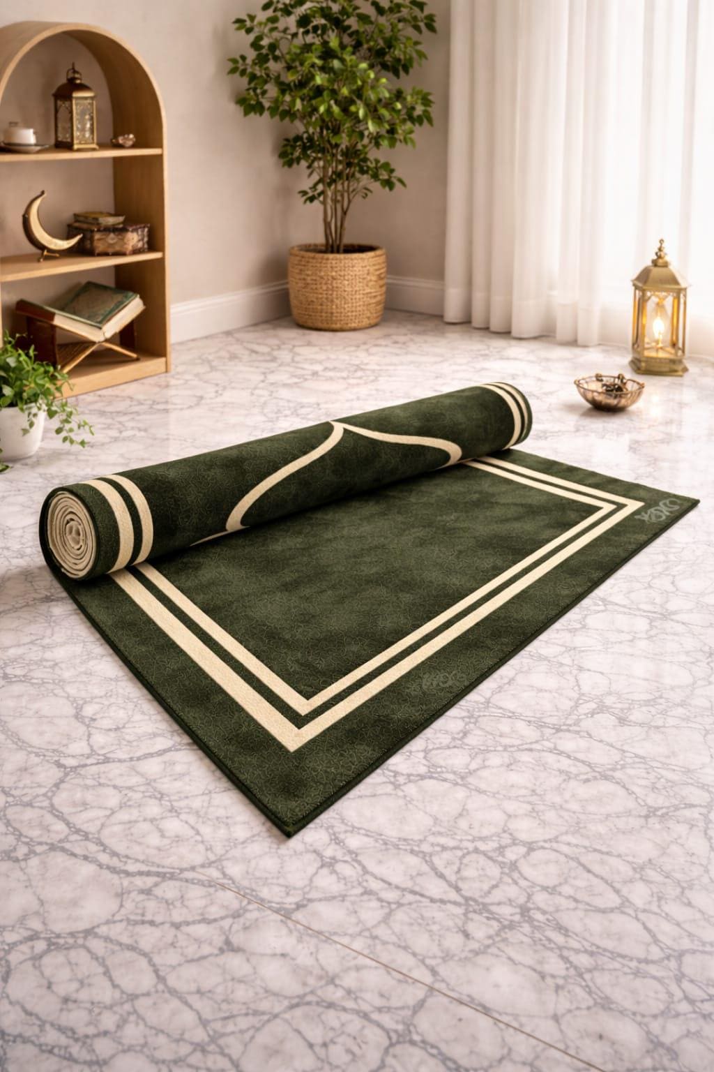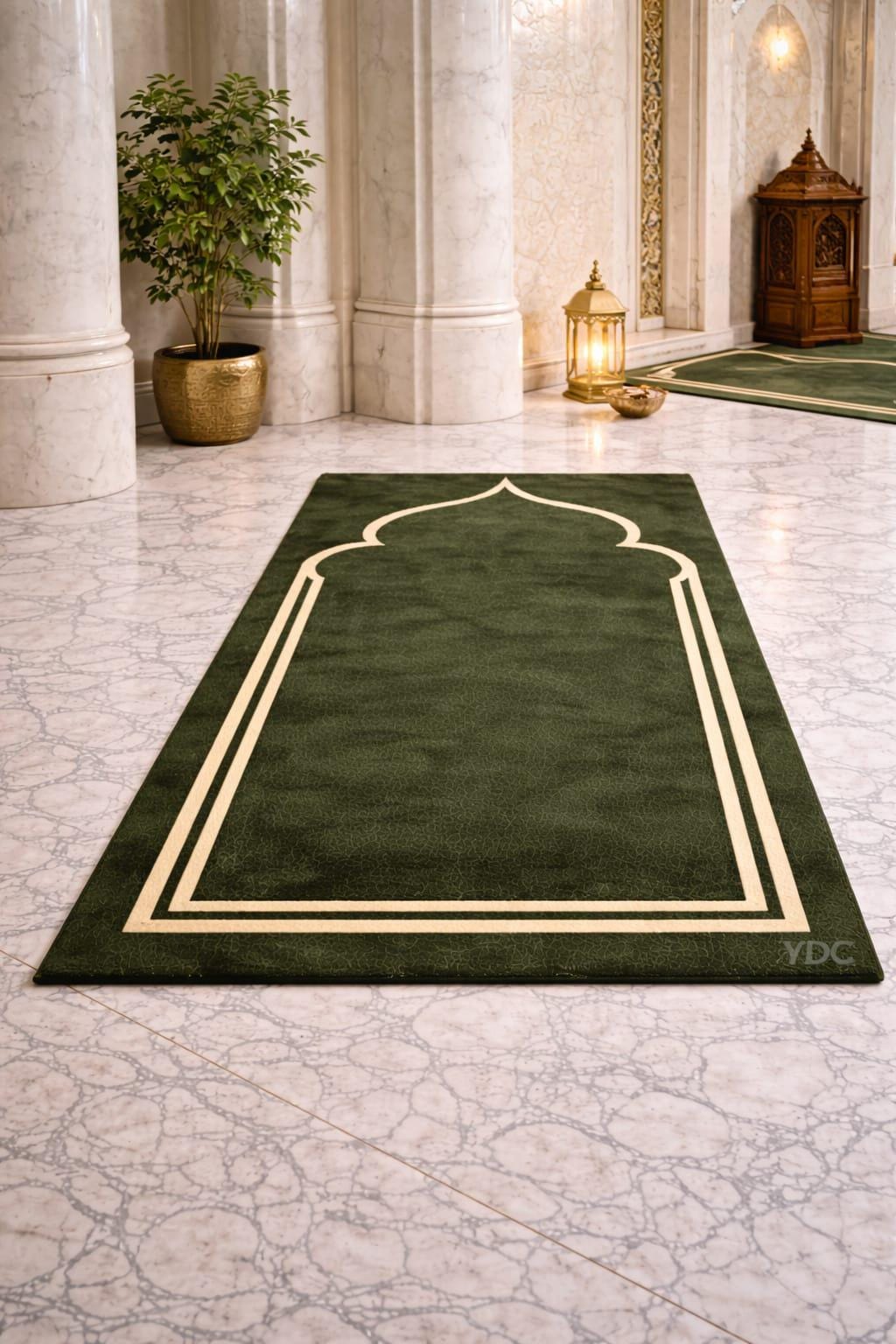 Create a peaceful and elegant prayer space with this beautifully crafted Islamic prayer rug featuring a classic mosque arch design. The deep green background paired with the clean cream arch outline reflects traditional Islamic aesthetics while maintaining a modern minimalist appearance.