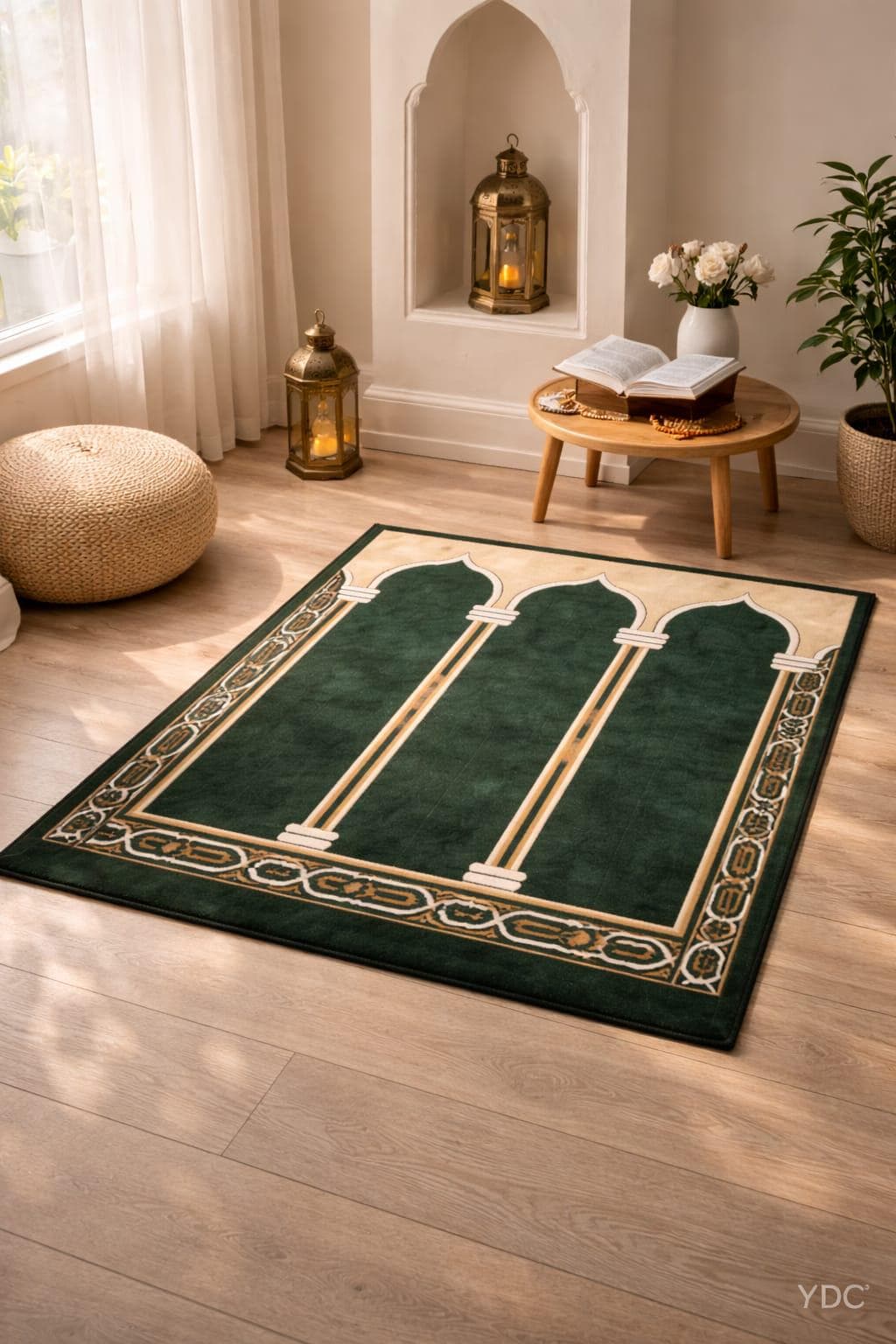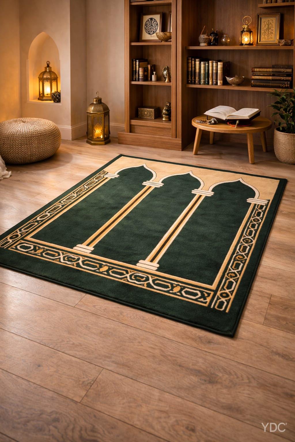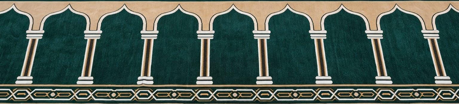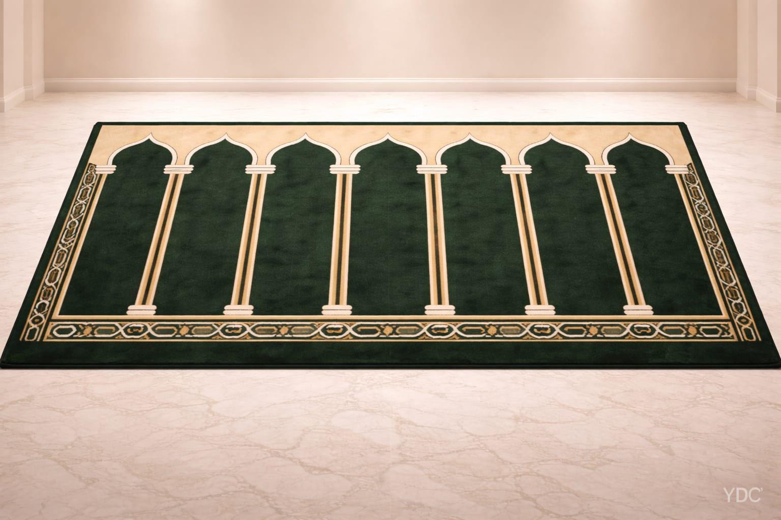 Enhance your prayer space with this beautifully designed Islamic mosque carpet featuring a traditional repeating mihrab arch pattern. The rich green base combined with elegant cream columns and borders creates a timeless spiritual aesthetic inspired by classic mosque interiors.