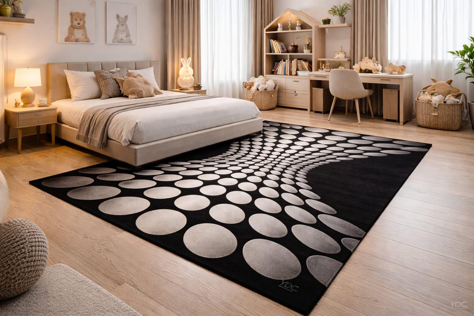 The rug is both functional and decorative, providing comfort and visual appeal.