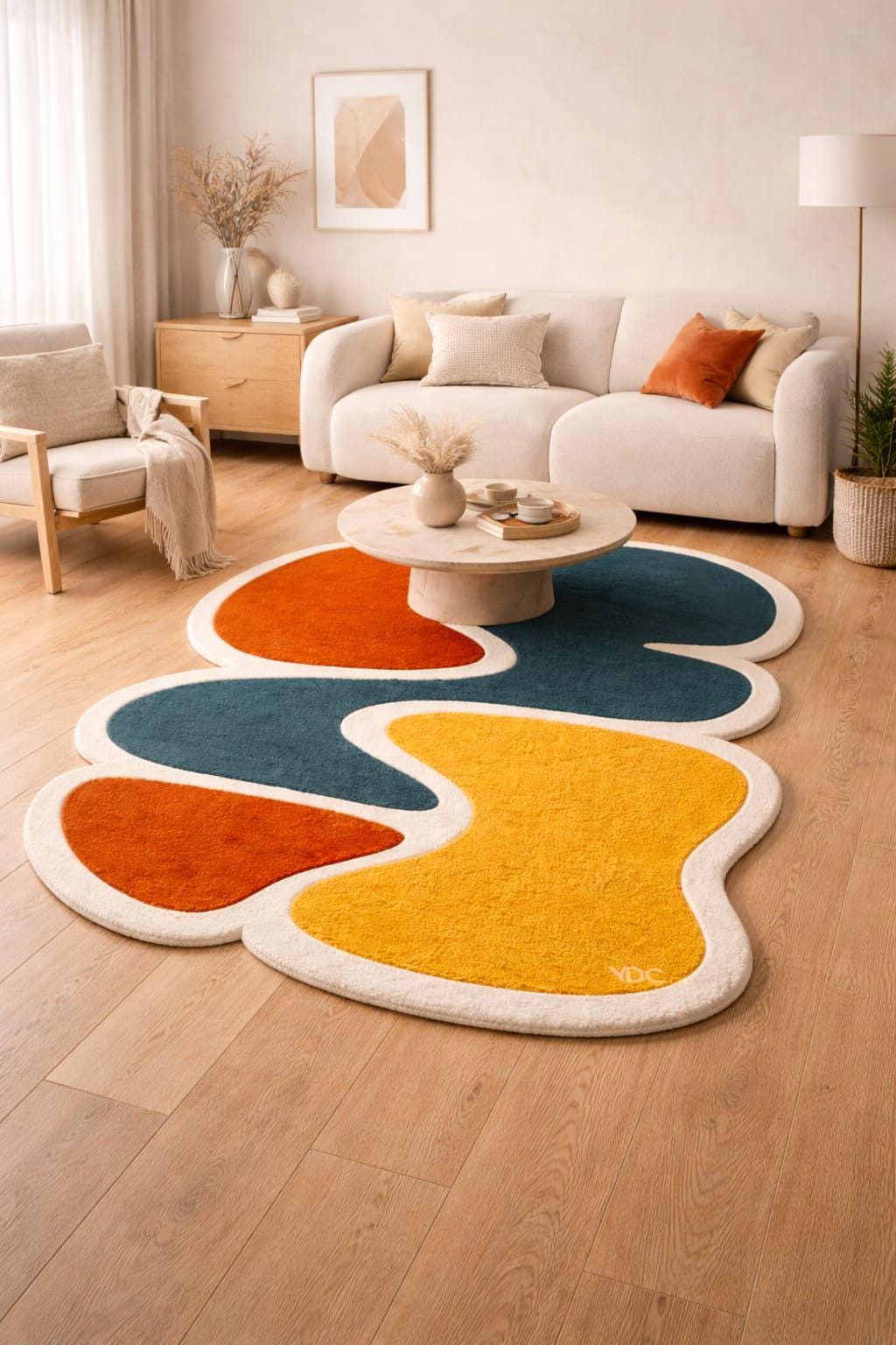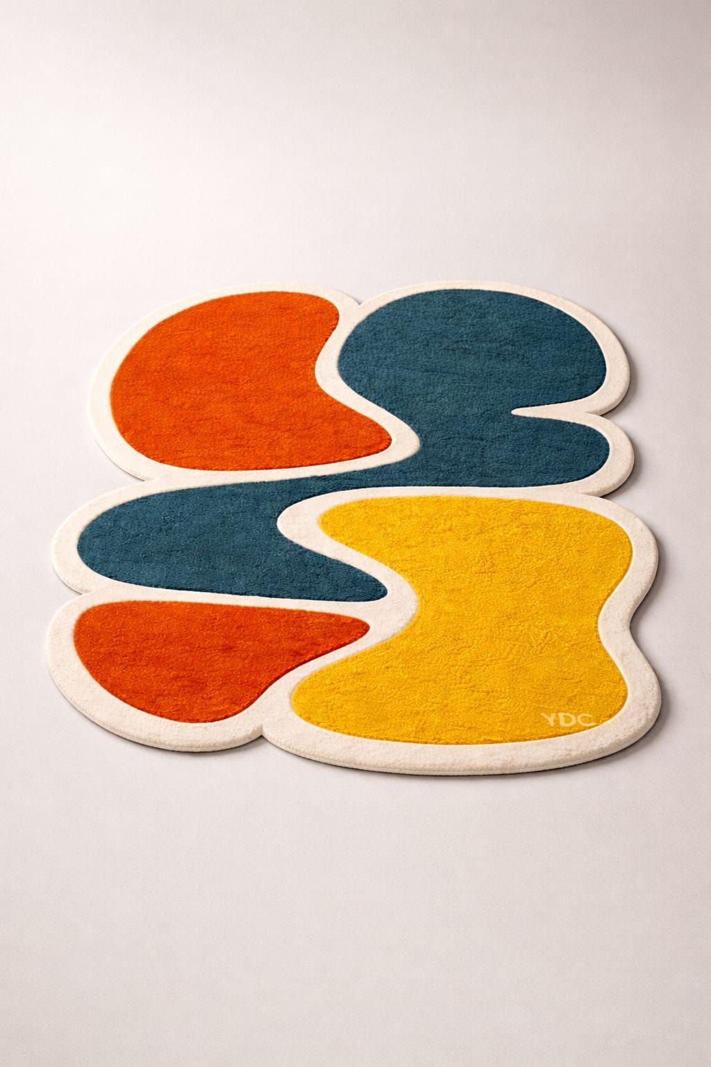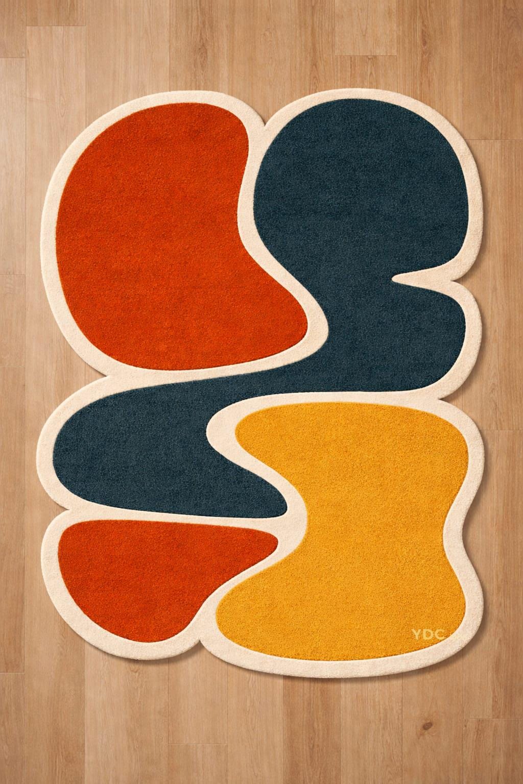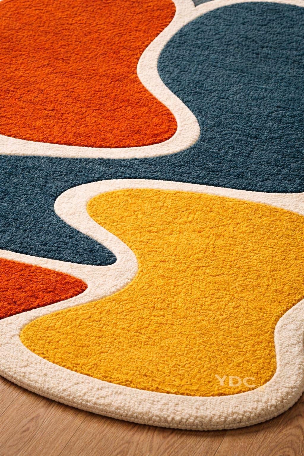 Bring a playful and artistic vibe into your space with this vibrant abstract rug featuring bold organic shapes in warm orange, mustard yellow, deep teal, and soft ivory tones. The unique free-flowing design creates a dynamic visual movement, making it a standout piece for modern interiors.